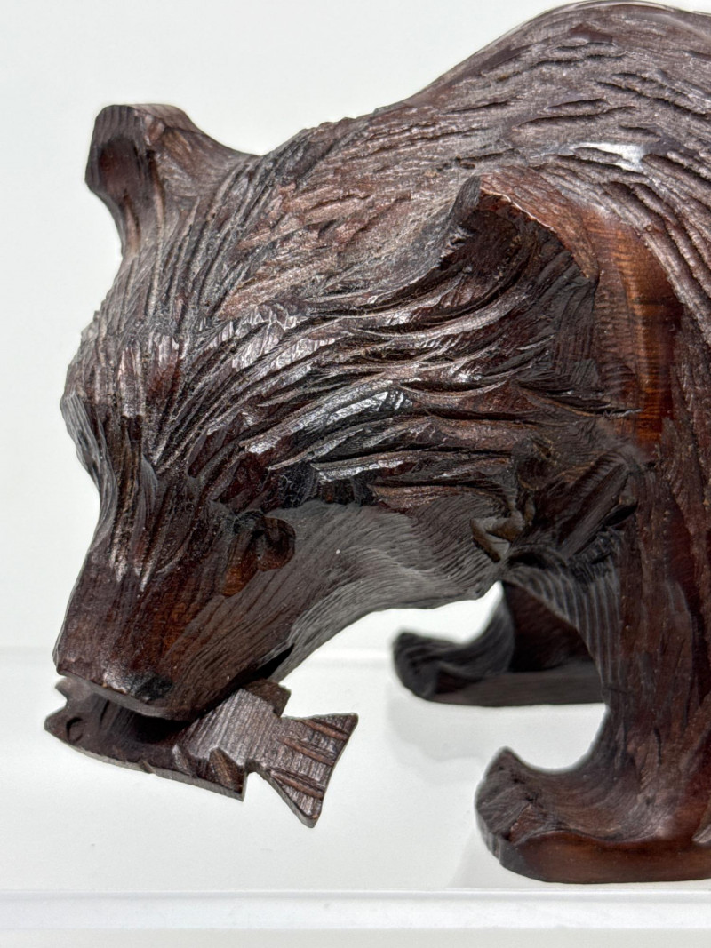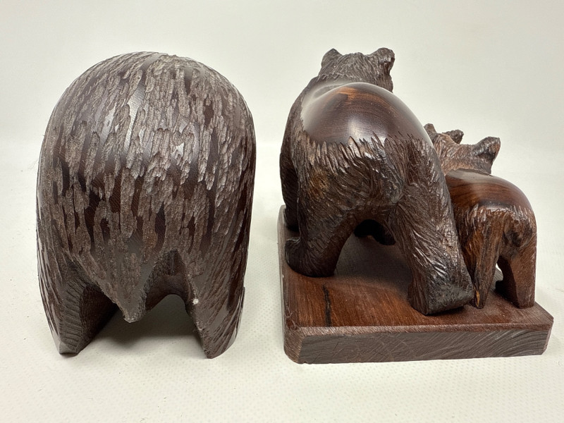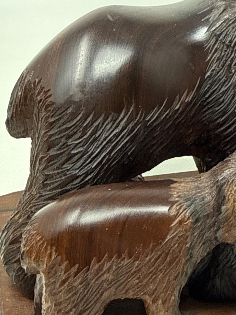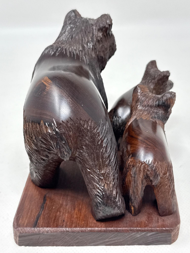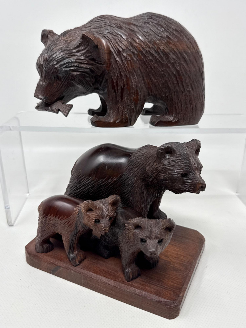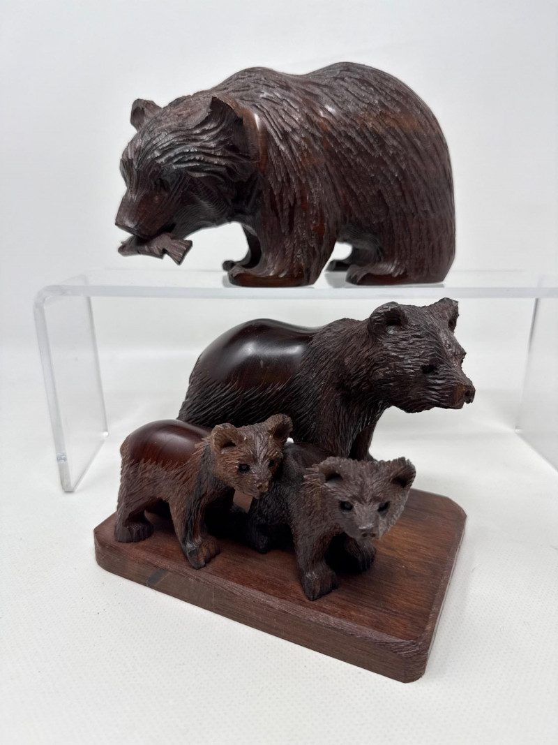 This beautifully handcrafted two-piece bear sculpture collection showcases the artistry and charm of traditional woodcarving. Both pieces are meticulously carved from richly grained hardwood with a smooth finish and fine detail. Set includes: "Hungry Bear" Bear Family Trio – Signed Features: Hand-carved from solid wood with intricate fur detailing Warm, dark wood tones with smooth and textured finishes One piece signed by the artist