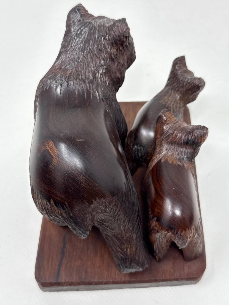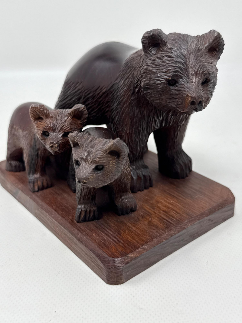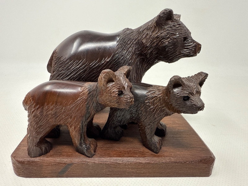 A heartwarming scene featuring a mother bear and her two cubs, all carved in attentive, lifelike poses and mounted on a wood base. This piece is artist-signed on the bottom.