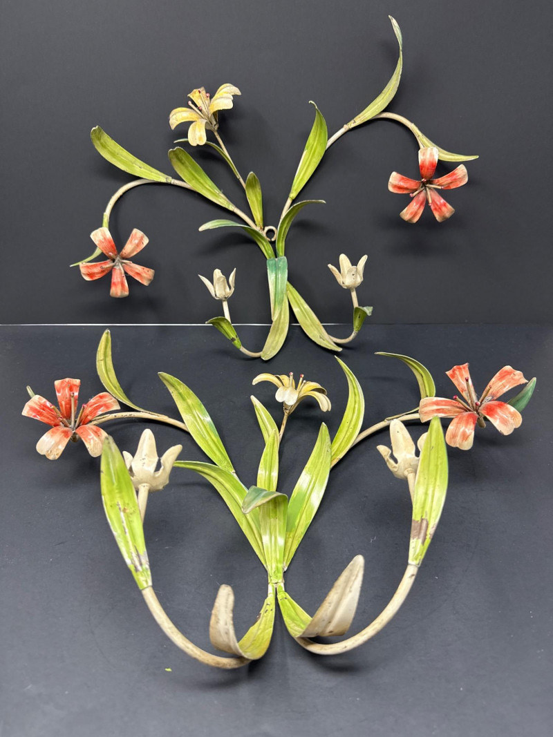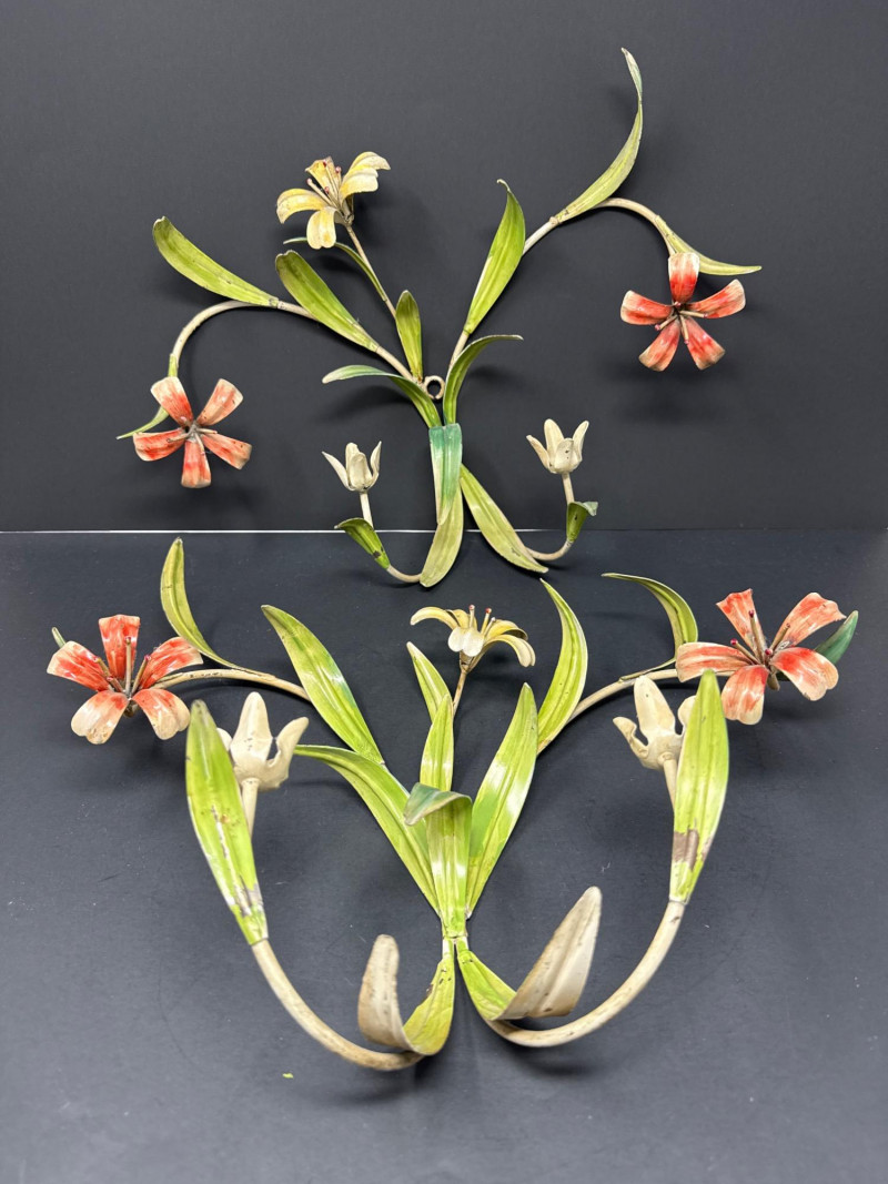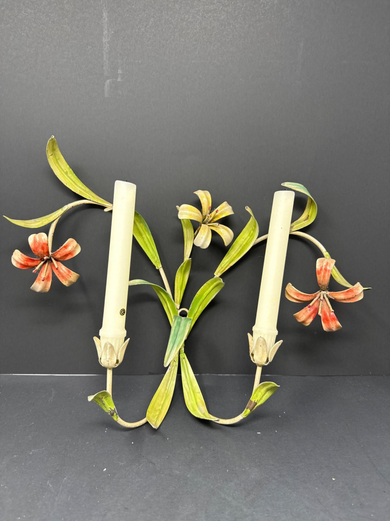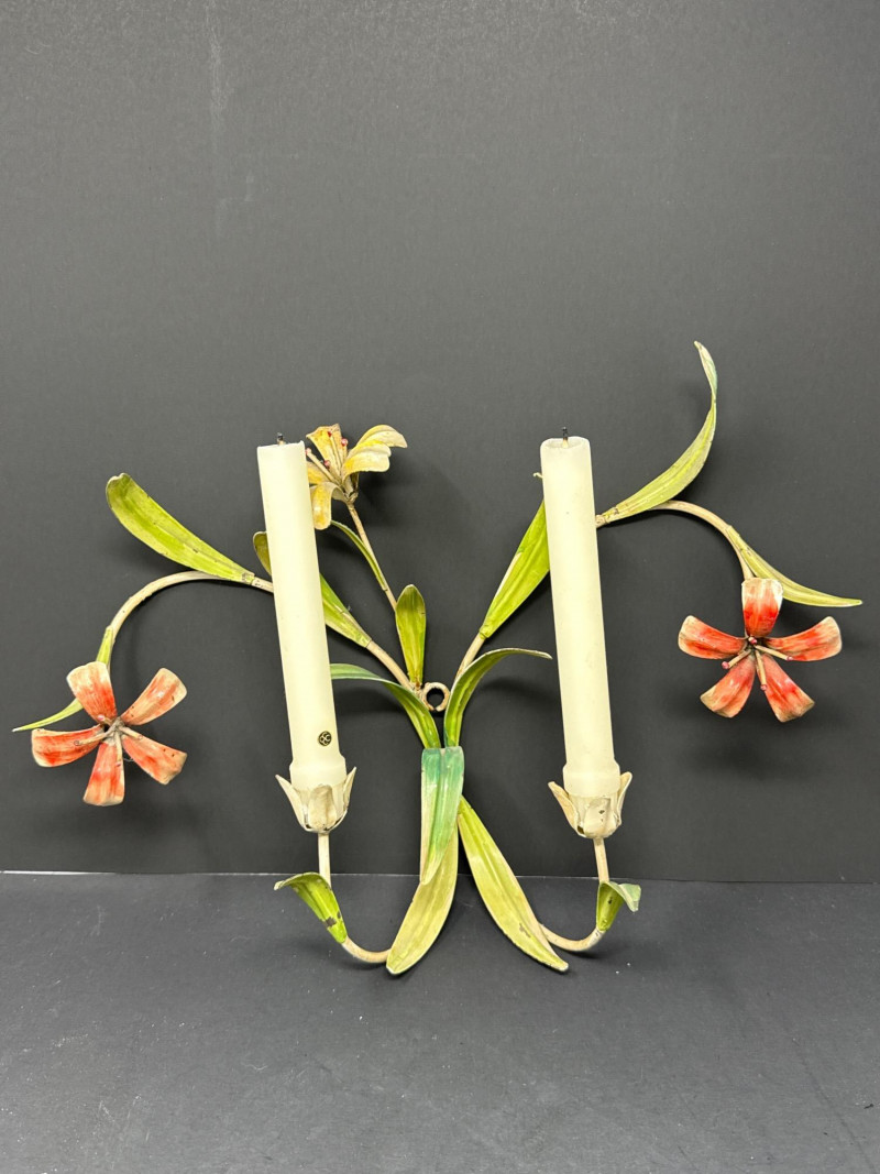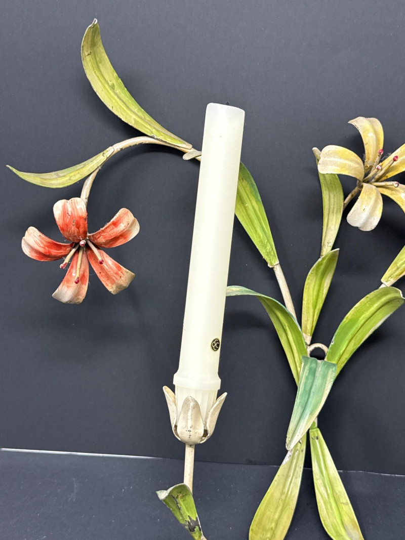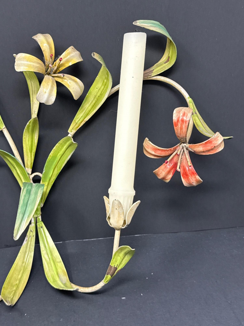 Set of two vintage metal wall-mounted candle holders designed in a floral motif, featuring red and cream lilies with green leaves. Each piece showcases detailed hand-painted accents and two candle arms shaped like flower stems, offering a charming rustic aesthetic ideal for cottage or shabby chic decor. Features: Two wall-mounted candle holders Hand-painted metal with floral lily design Holds standard taper candles Colors: red, cream, green Keyhole hanger on back for wall display Dimensions: 16" W x 13" T x 6" D