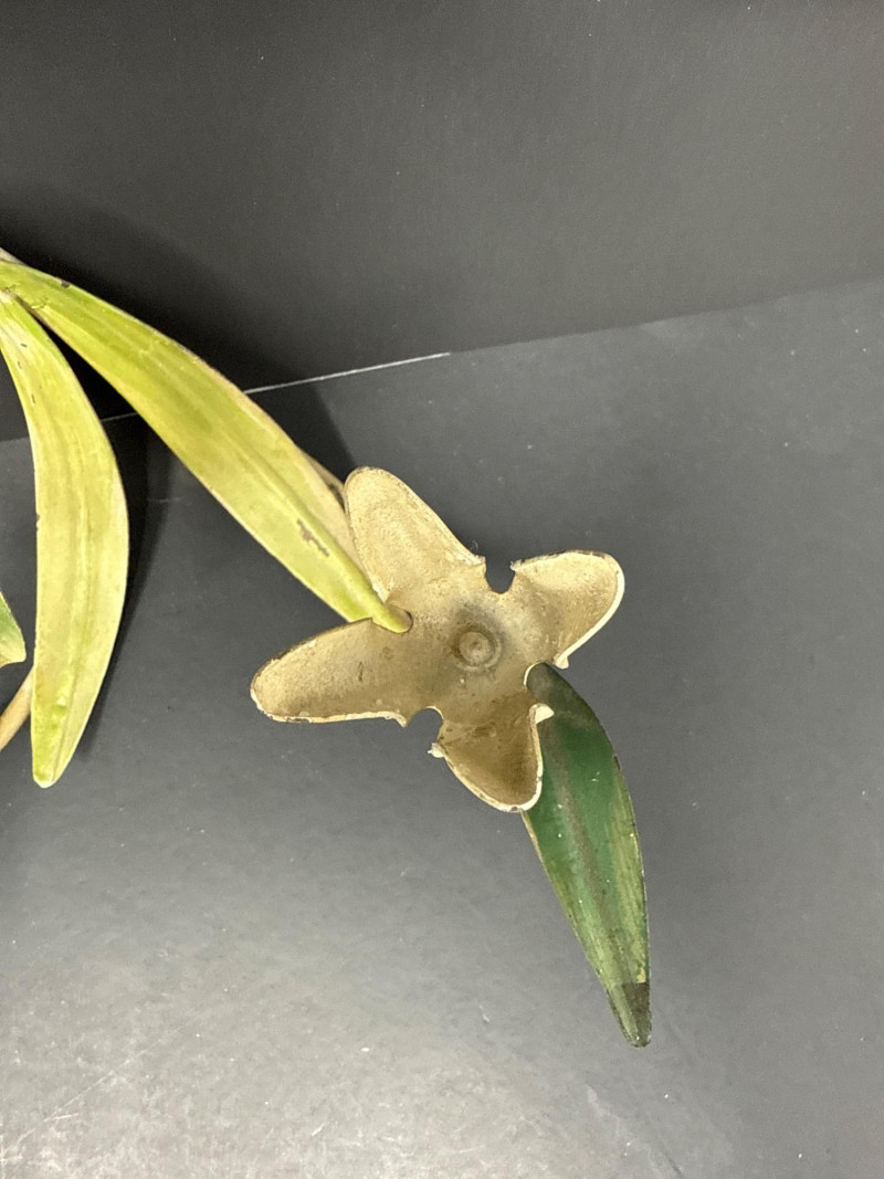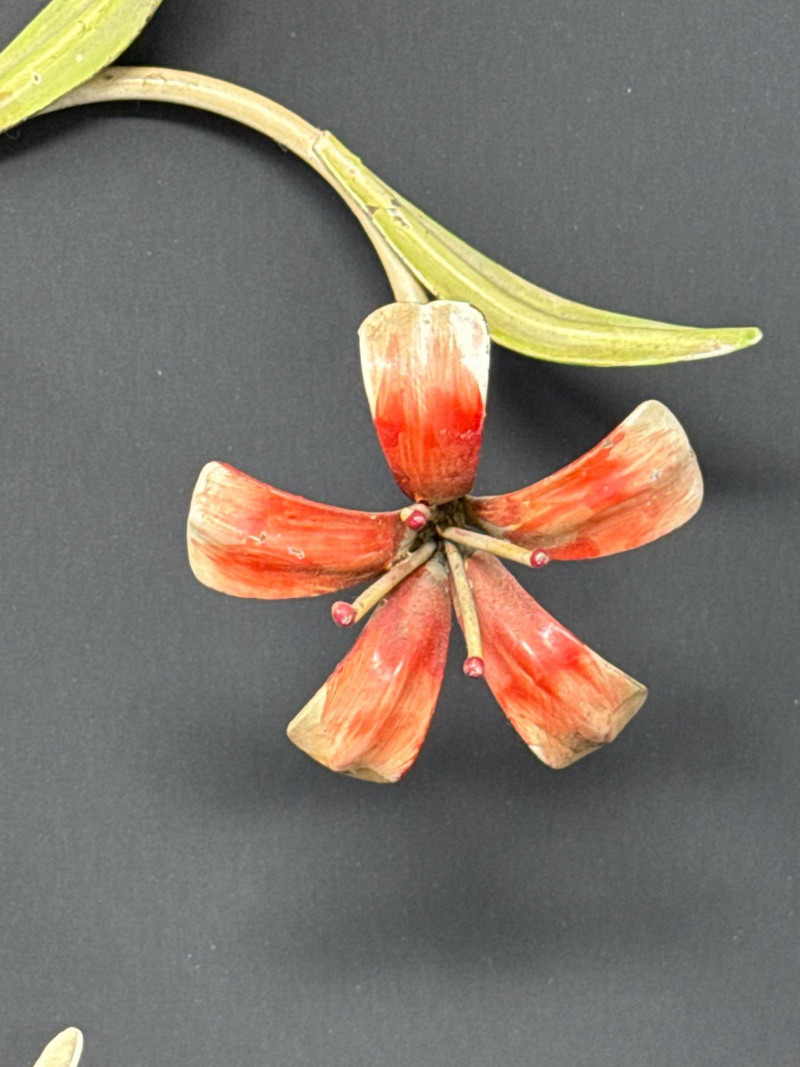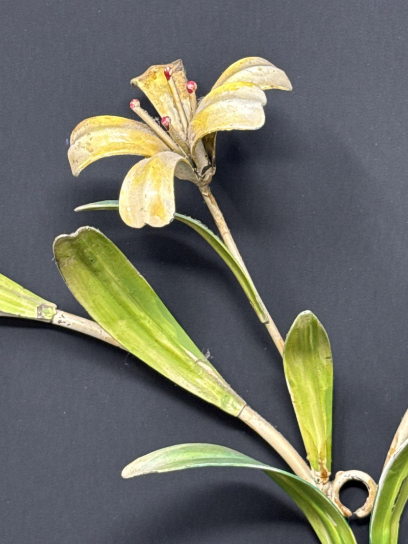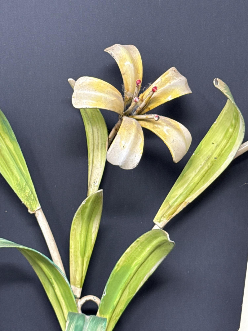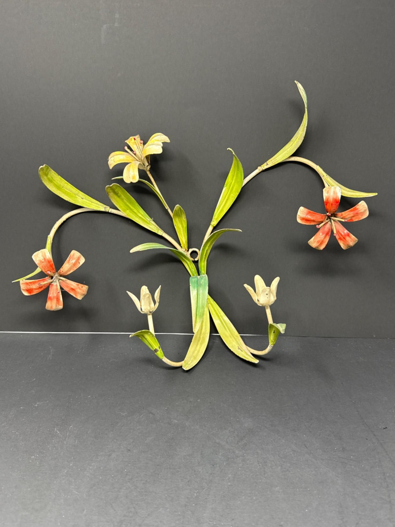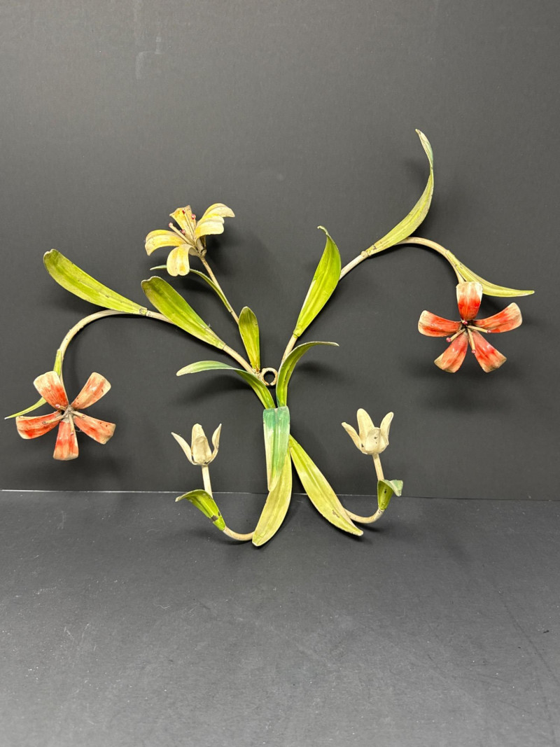 Set of two vintage metal wall-mounted candle holders designed in a floral motif, featuring red and cream lilies with green leaves. Each piece showcases detailed hand-painted accents and two candle arms shaped like flower stems, offering a charming rustic aesthetic ideal for cottage or shabby chic decor. Features: Two wall-mounted candle holders Hand-painted metal with floral lily design Holds standard taper candles Colors: red, cream, green Keyhole hanger on back for wall display Dimensions: 16" W x 13" T x 6" D