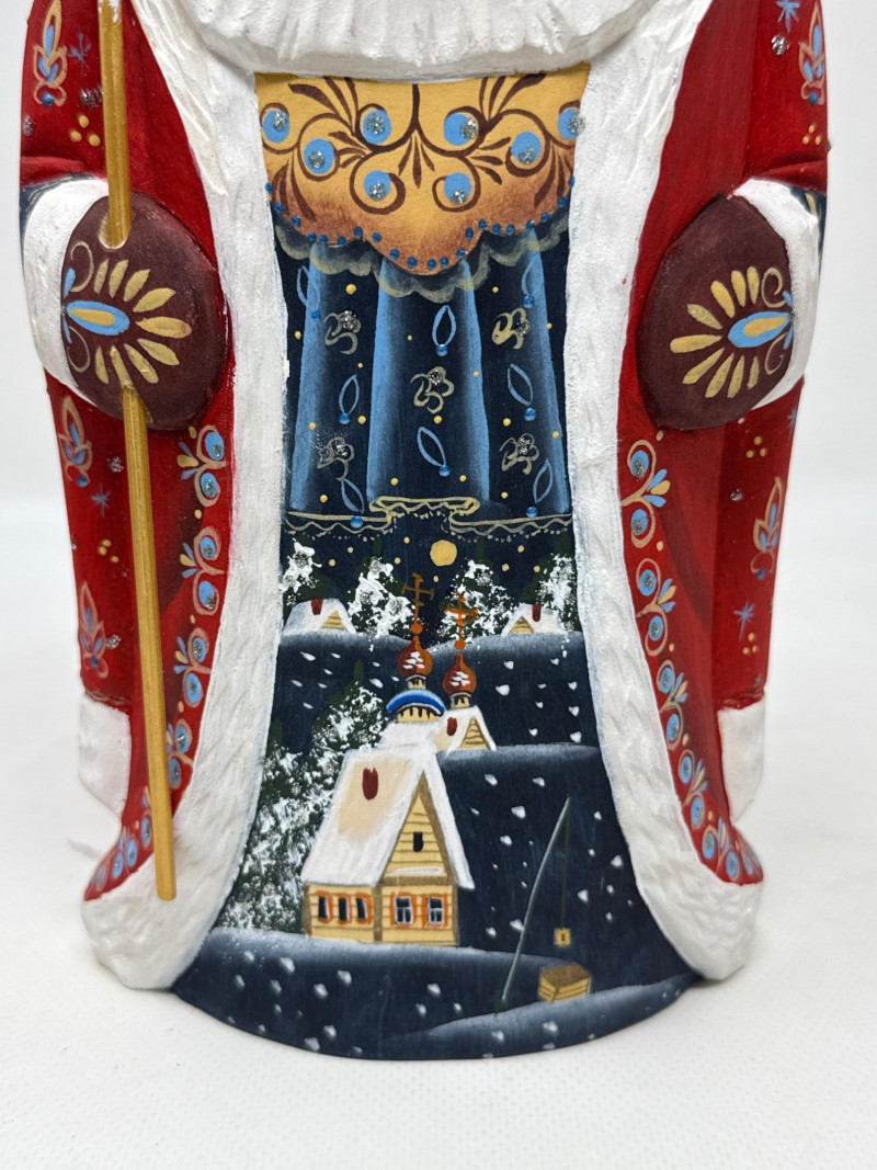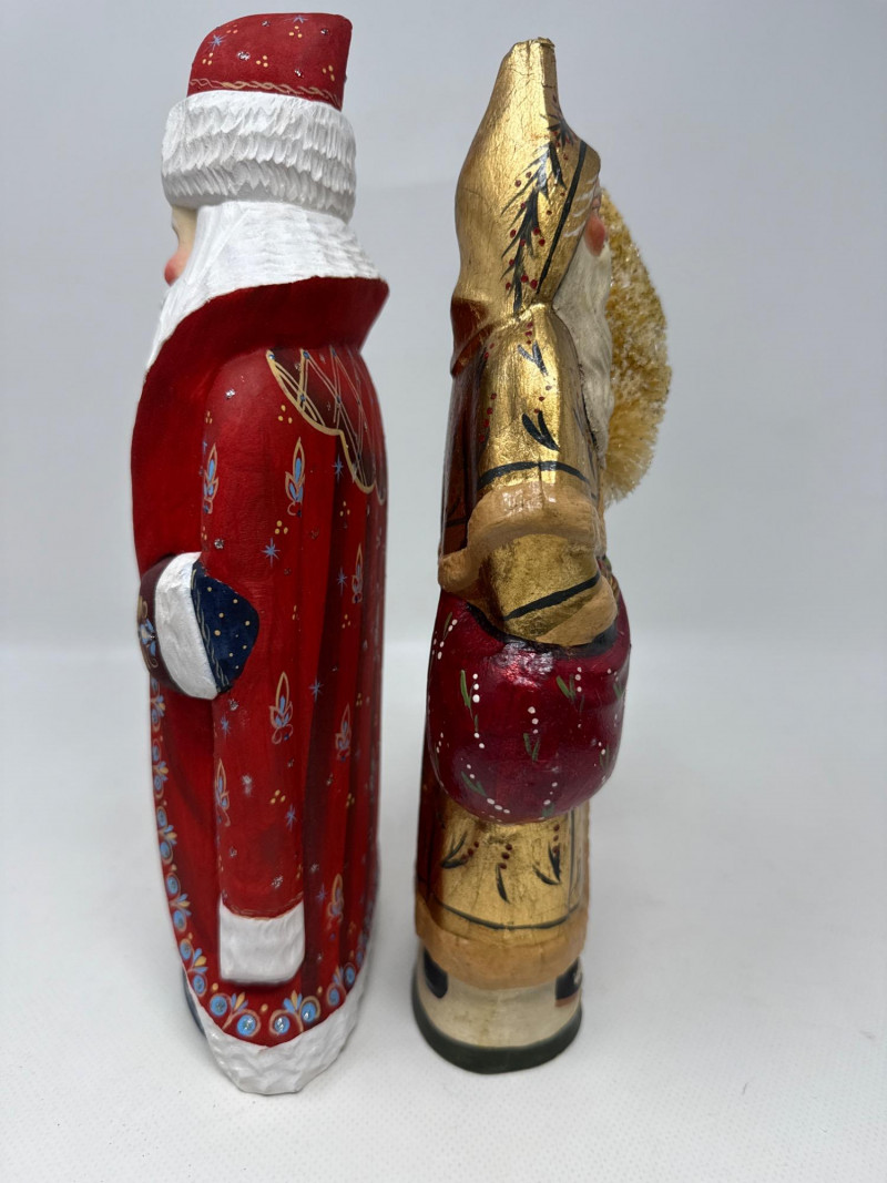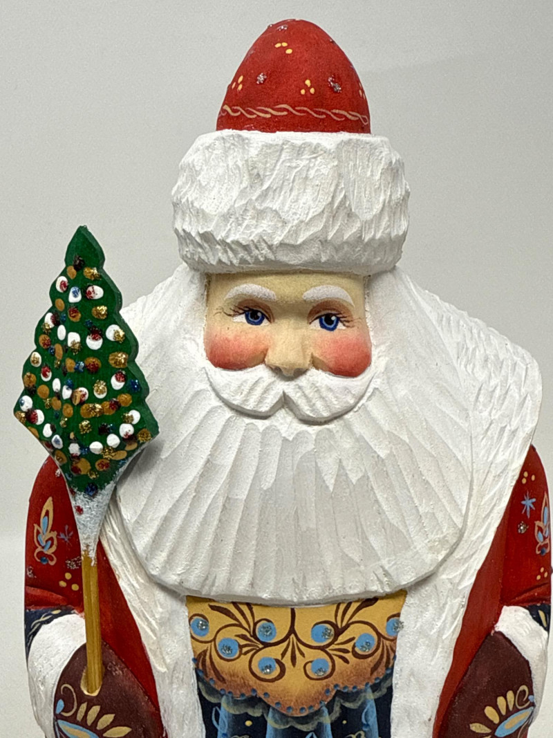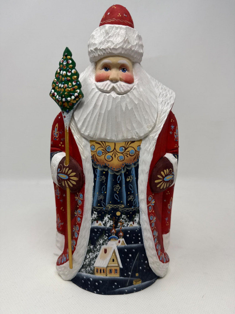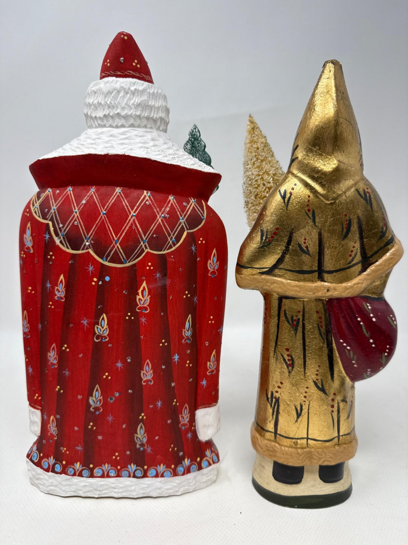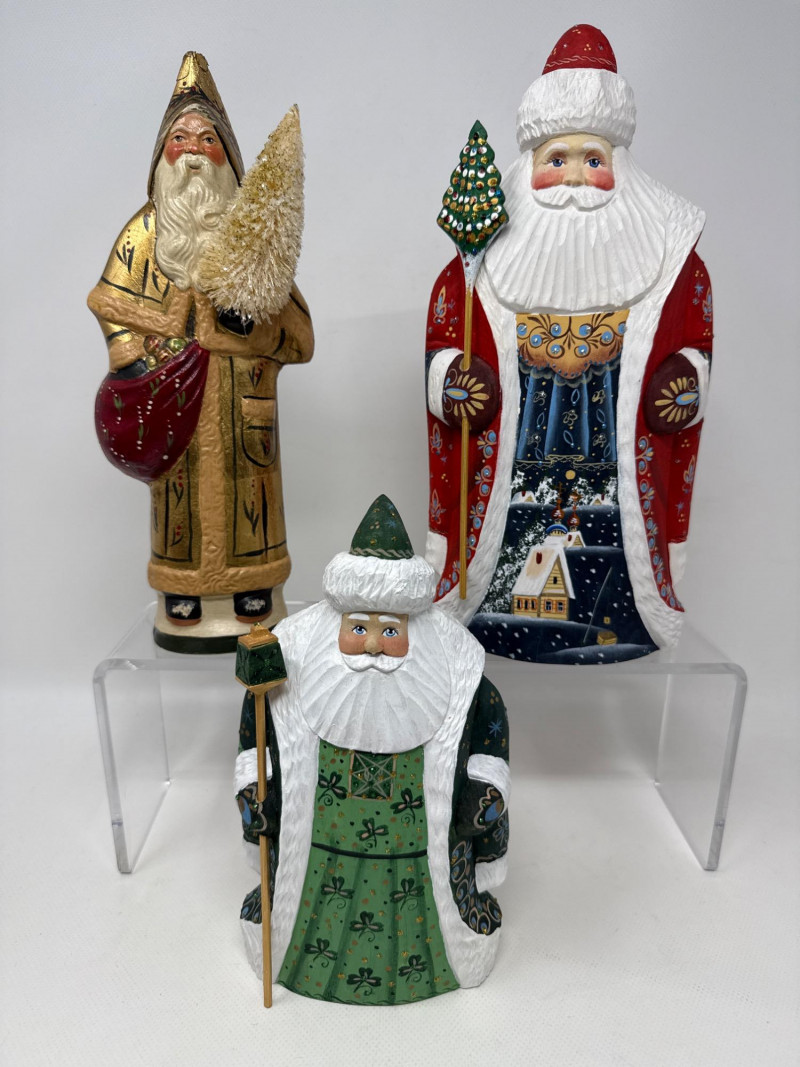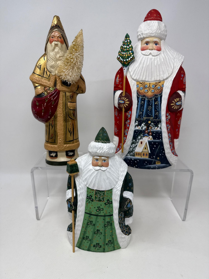 This charming set includes three handcrafted Russian Santa Claus figurines, each meticulously carved from wood and hand-painted with traditional festive designs. These collectible pieces reflect fine artisan detail and craftsmanship, and all three are signed by the artists on the base. Set Includes: Red Santa: 11" tall, with snowflake motifs and a scenic winter village on the robe Gold Santa: 10.5" tall, holding a bottle brush tree, adorned in rich golden hues Green Santa: 8.5" tall x 4.5" wide, featuring a green patterned coat and staff