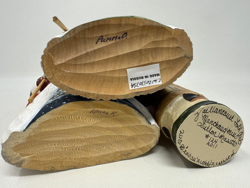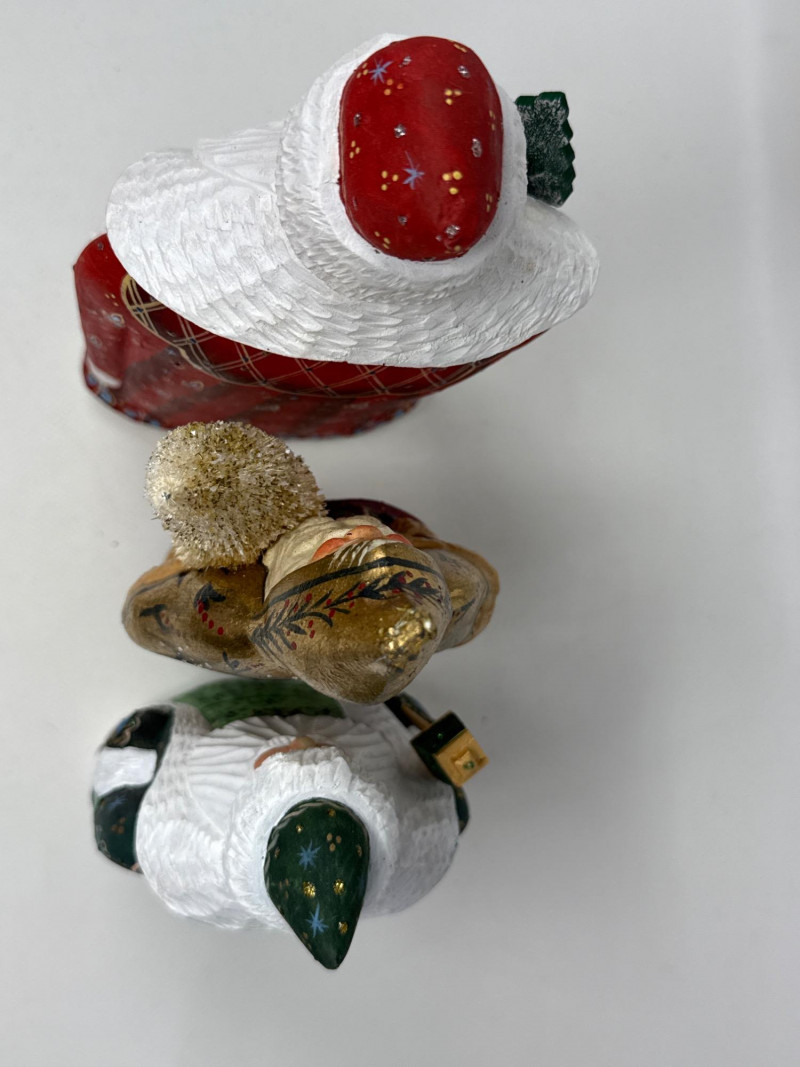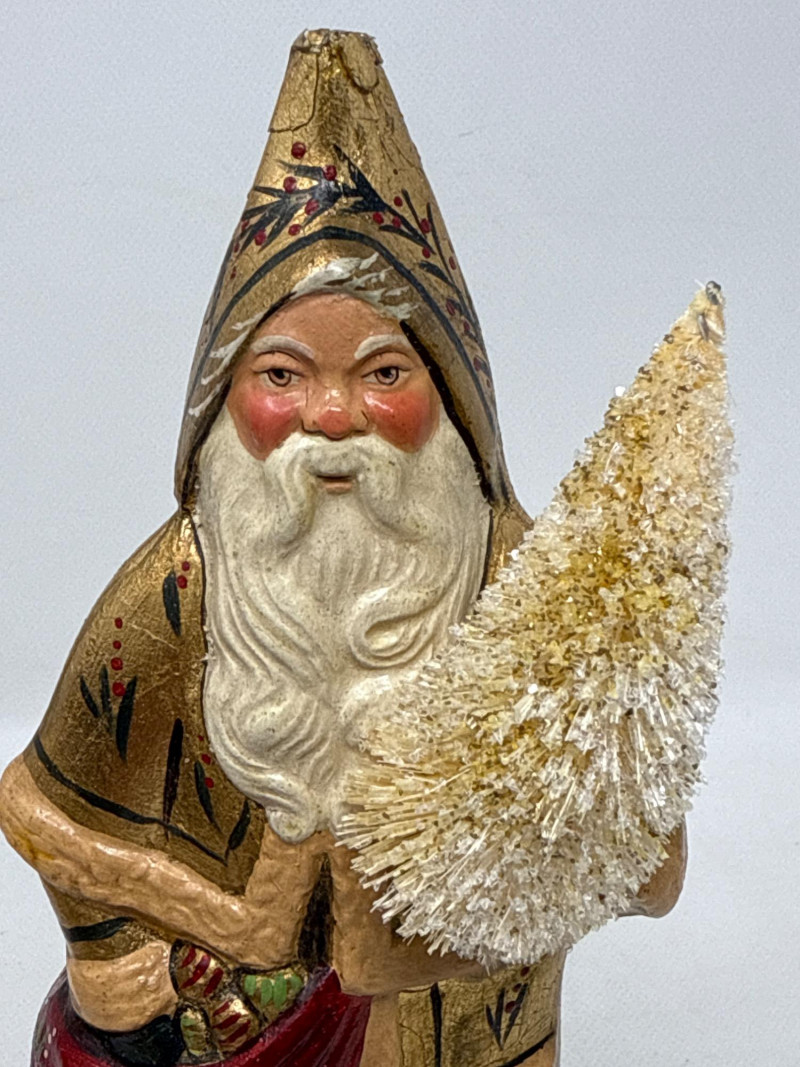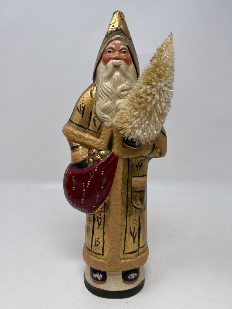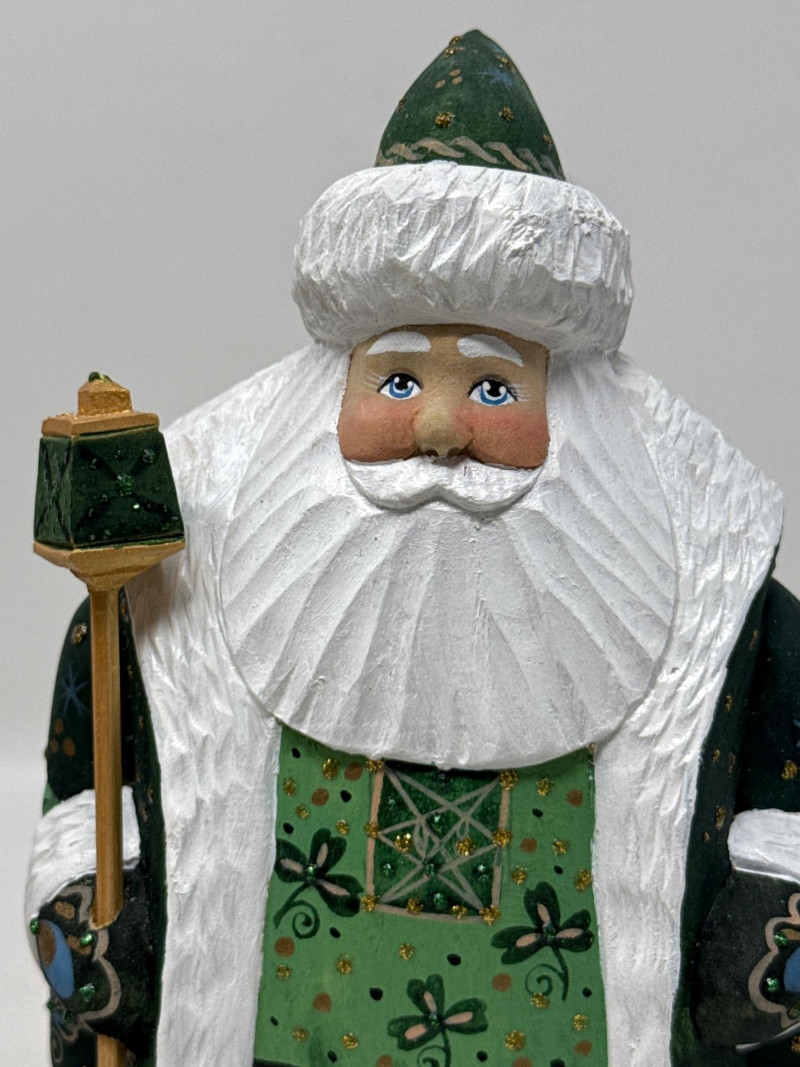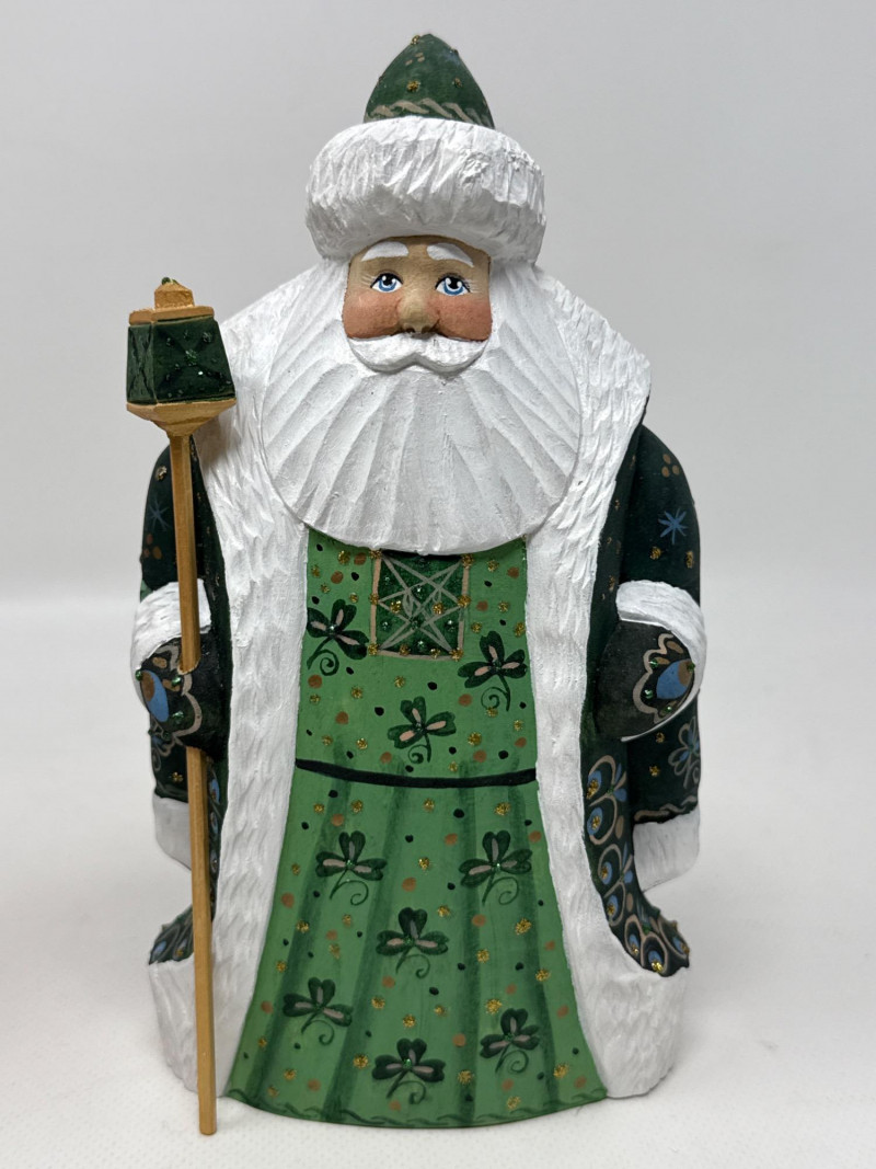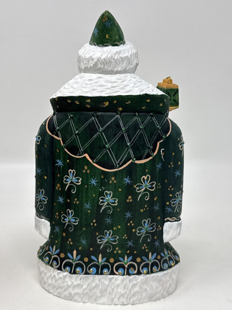 This charming set includes three handcrafted Russian Santa Claus figurines, each meticulously carved from wood and hand-painted with traditional festive designs. These collectible pieces reflect fine artisan detail and craftsmanship, and all three are signed by the artists on the base. Set Includes: Red Santa: 11" tall, with snowflake motifs and a scenic winter village on the robe Gold Santa: 10.5" tall, holding a bottle brush tree, adorned in rich golden hues Green Santa: 8.5" tall x 4.5" wide, featuring a green patterned coat and staff