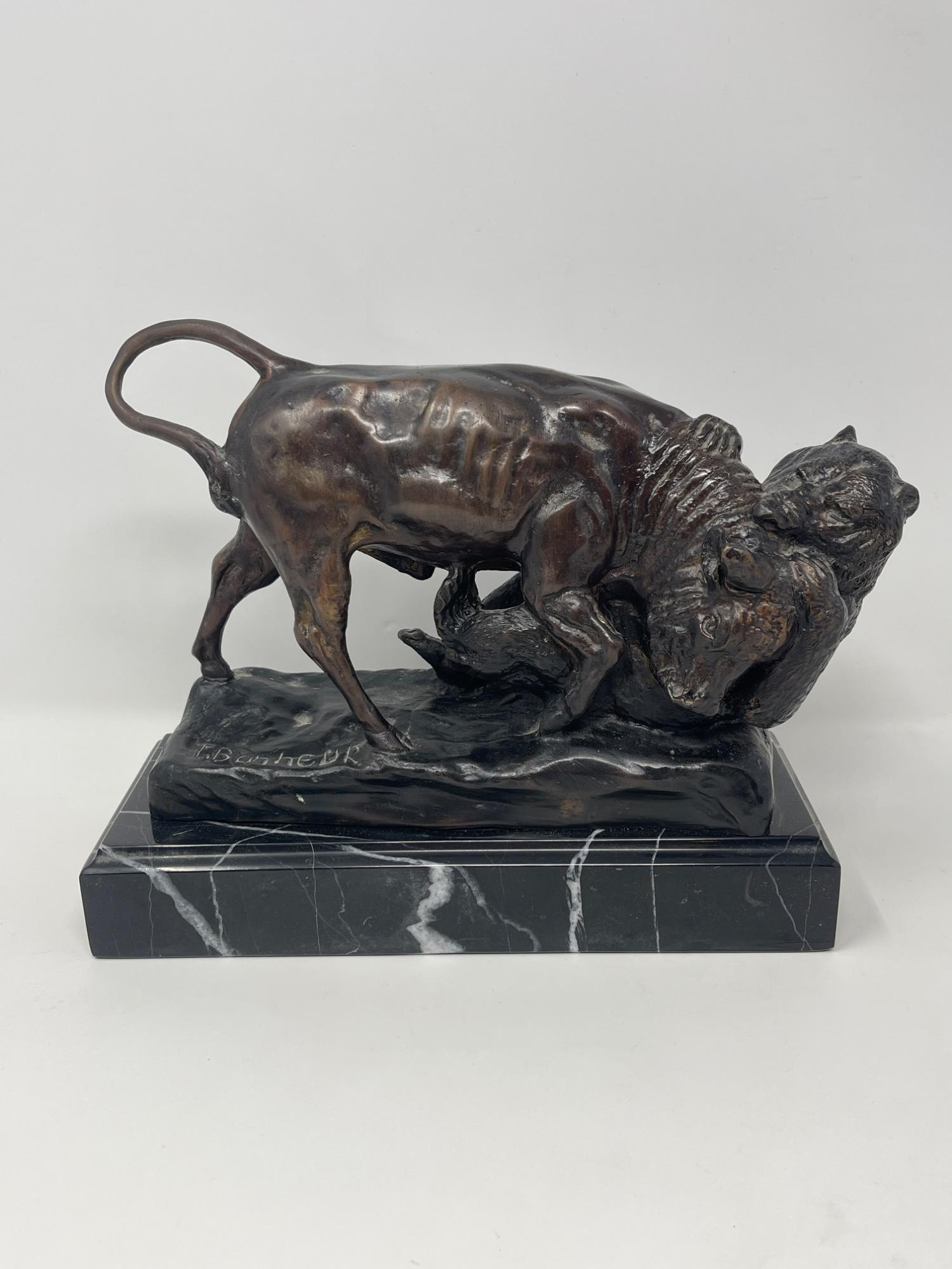 Original Isidore Jules Bonheur 'Bear & Bull' Bronze Sculpture Discover the artistry of Isidore Jules Bonheur with this original bronze sculpture depicting the iconic clash of a bear and bull. Measuring 10 inches long, 4 inches wide, and 8 inches high, this piece captures the intense energy and raw power of market symbolism. Mounted on a sleek marble base, it offers a compelling blend of realism and drama, ideal for collectors and enthusiasts of fine sculptures.