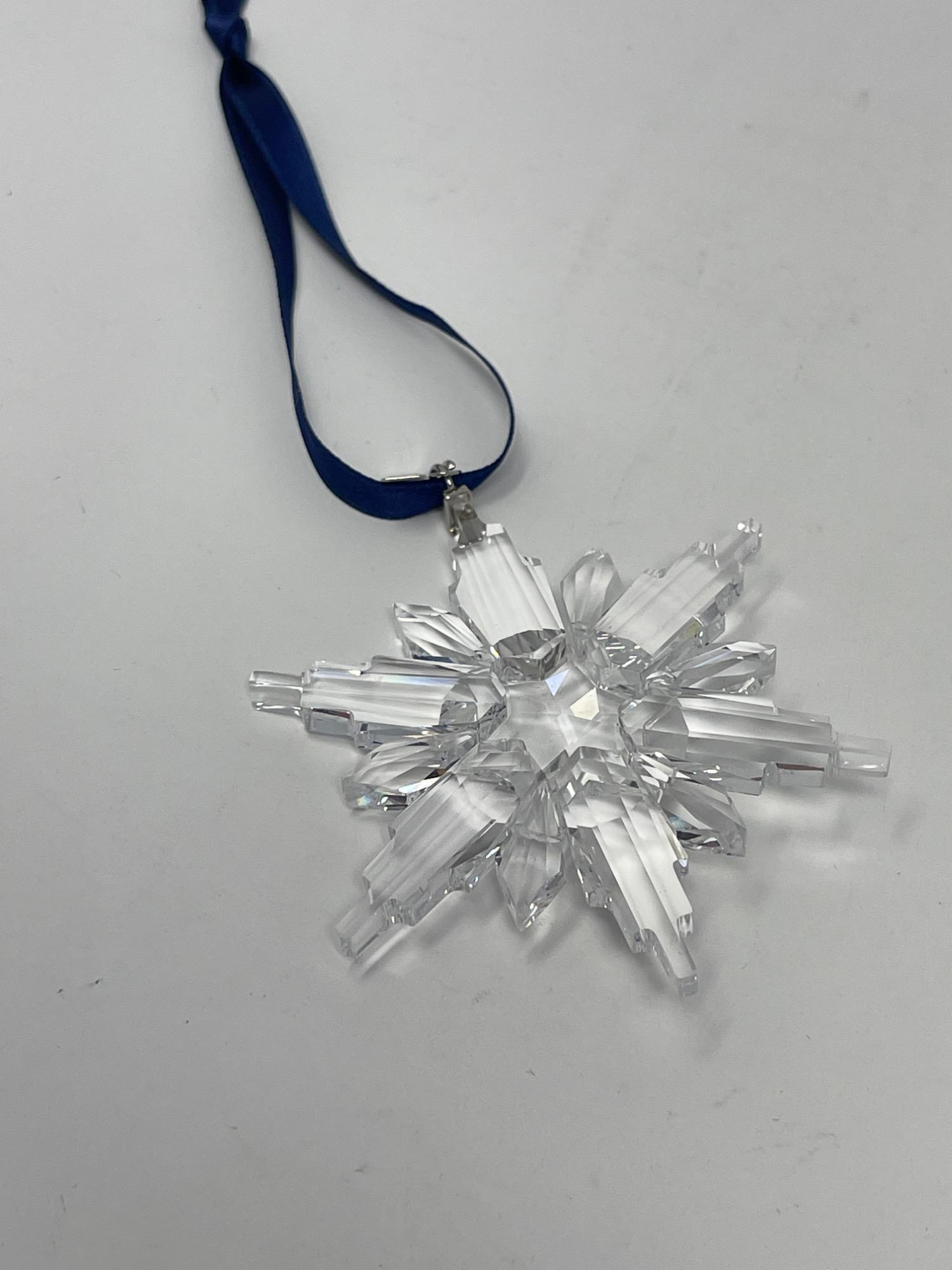 Swarovski Crystal Snowflake Ornaments, 2006 & 2018 Limited Editions 3-3.25” W Celebrate the splendor of the holidays with this pair of Swarovski crystal snowflake ornaments from the limited editions of 2006 and 2018. Each ornament dazzles with its unique design, capturing the intricate beauty of snowflakes in brilliant, clear crystal. The 2006 ornament features a classic white ribbon, while the 2018 version is adorned with a regal blue ribbon, both perfect for adding a touch of sparkle to any festive decoration.