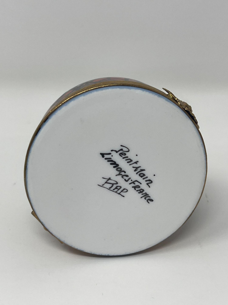 Limoges France Box - Stained Glass Style Dome w/ Nativity Scene This charming Limoges France box showcases a hand-painted stained glass style dome that opens to reveal a tiny Nativity scene. Marked "Peint Main" and signed "RAP," it exemplifies the artistry of Limoges porcelain. A unique and festive addition to any collection.