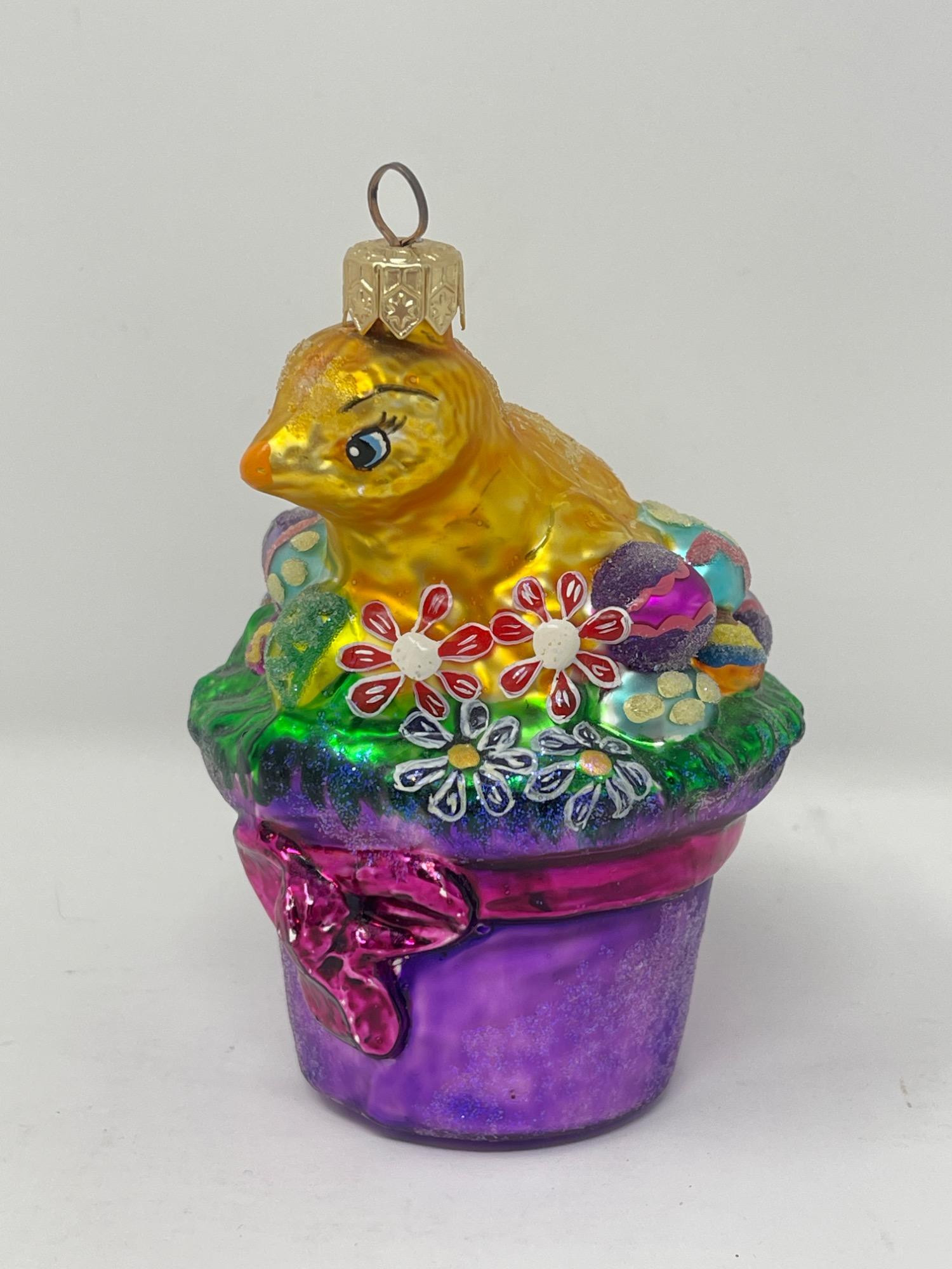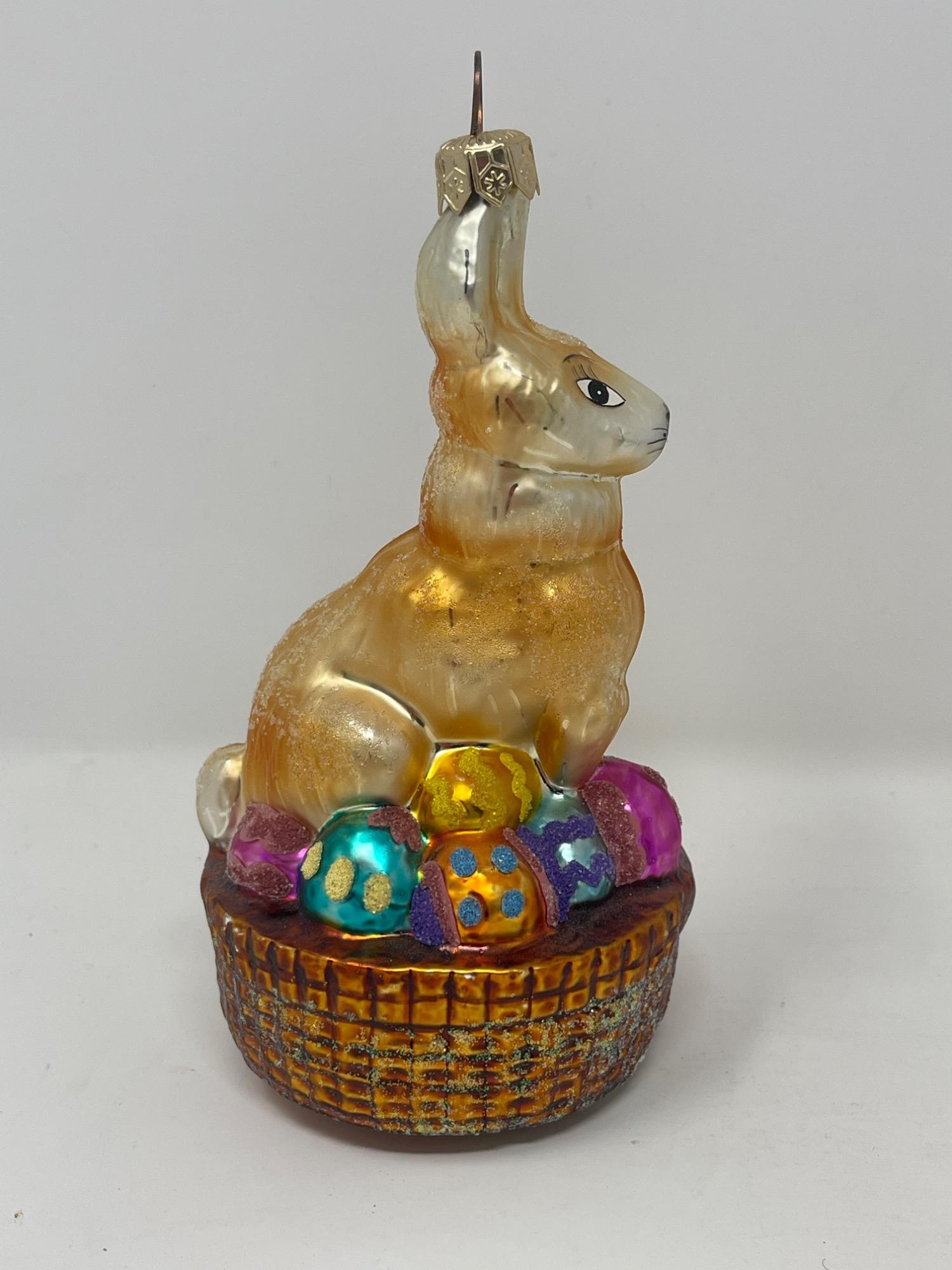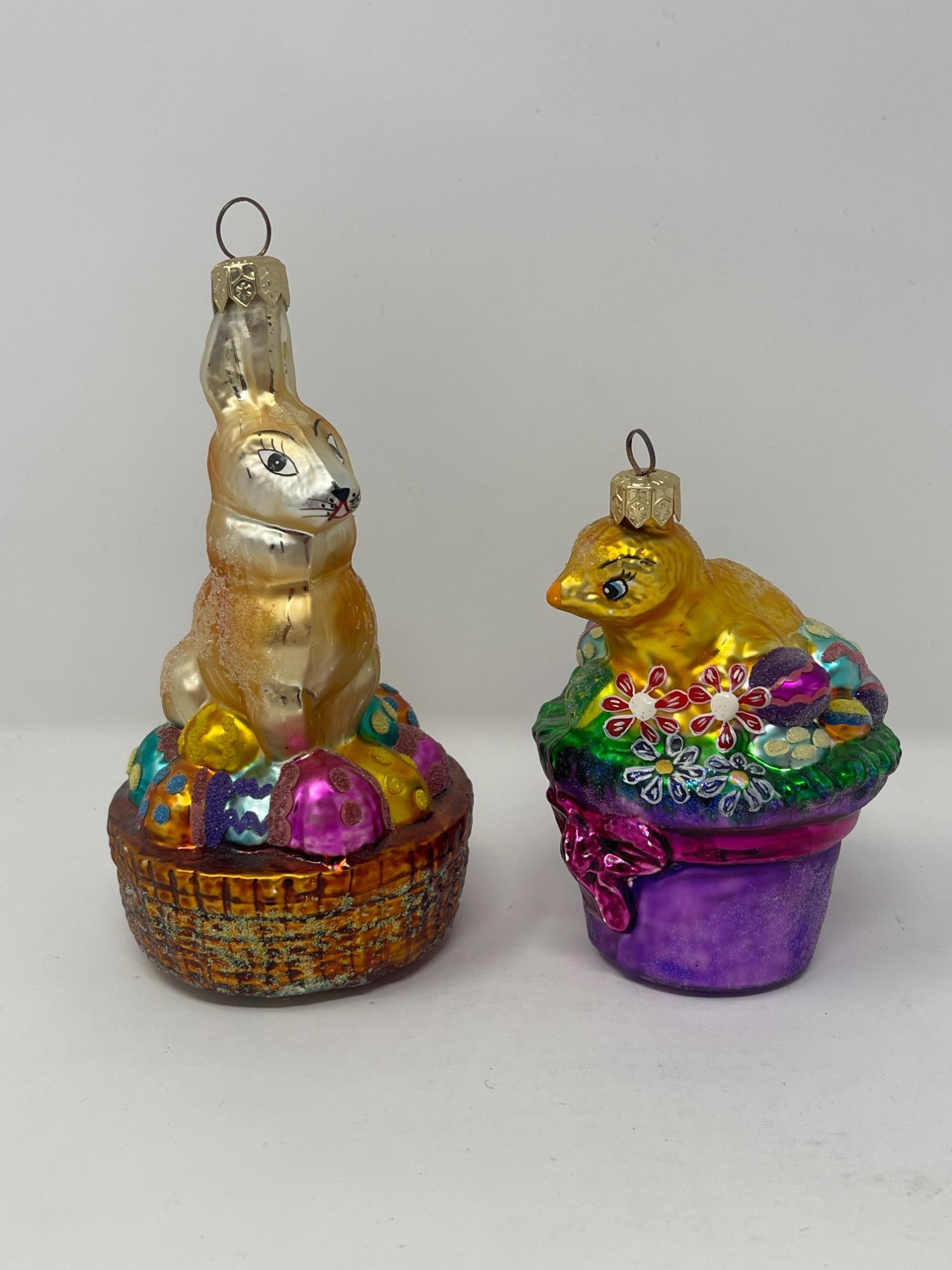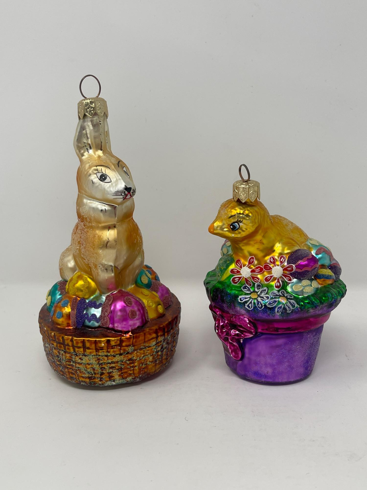 Christopher Radko Easter Ornaments - 2001 Nesting Chick & Bunny 4.5-6” H Celebrate Easter in style with these charming Christopher Radko ornaments from the 2001 Easter collection. This delightful duo includes the 'Nesting Chick' and the 'Bunny', each crafted from mouth-blown glass and meticulously hand-painted by skilled Polish artisans. The Nesting Chick features vibrant, colorful details atop a bed of Easter eggs, while the Bunny is elegantly posed in a festive basket. These limited edition pieces reflect Radko's commitment to quality and tradition, making them perfect for collectors seeking unique holiday decorations or thoughtful gifts. Each ornament took a week to create, highlighting their exclusivity and craftsmanship.