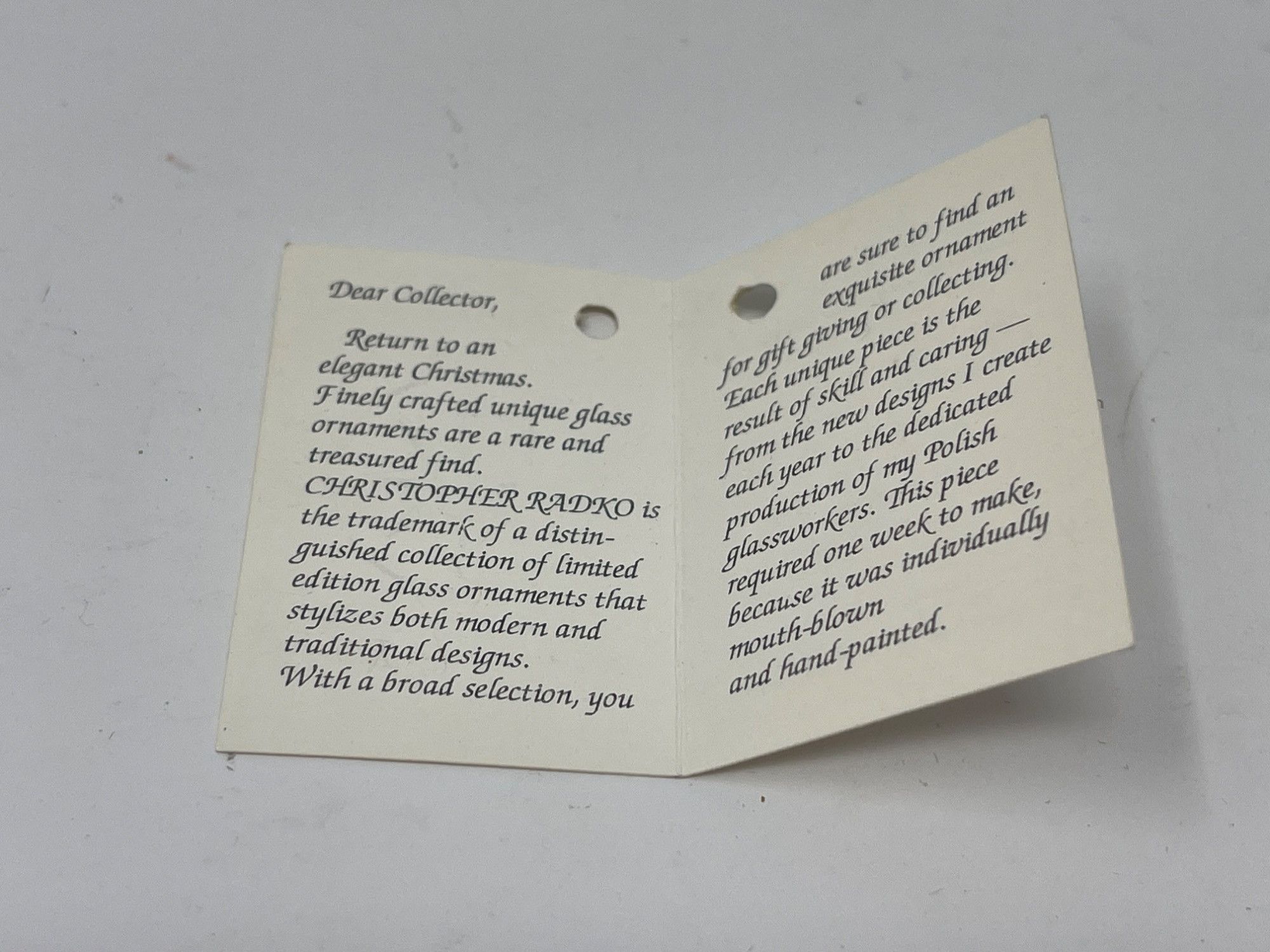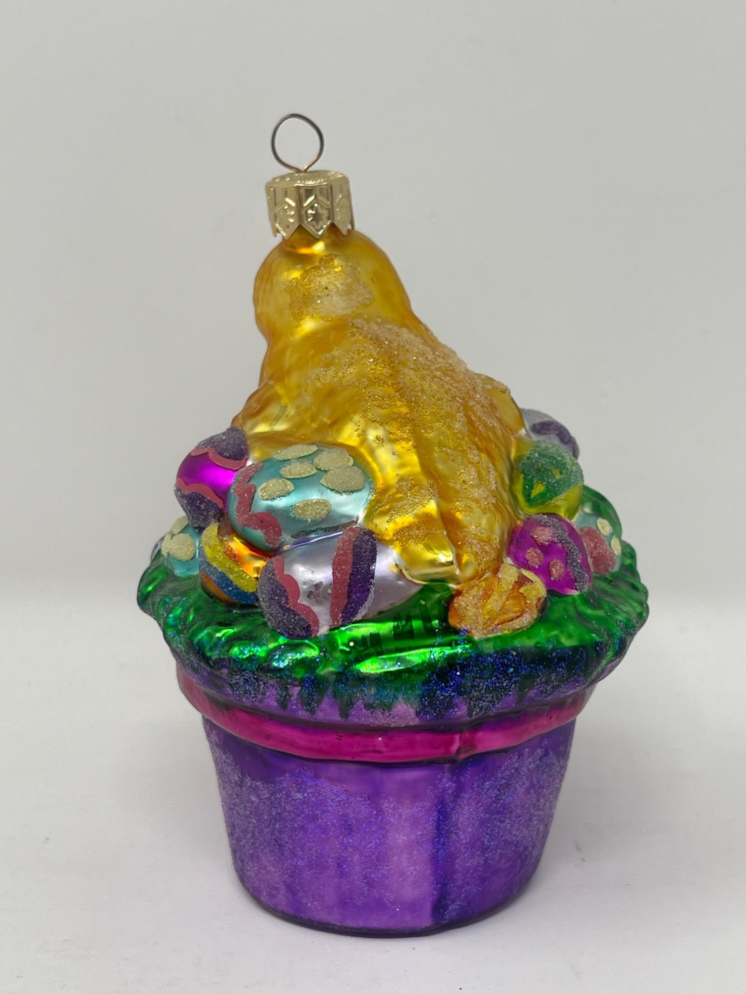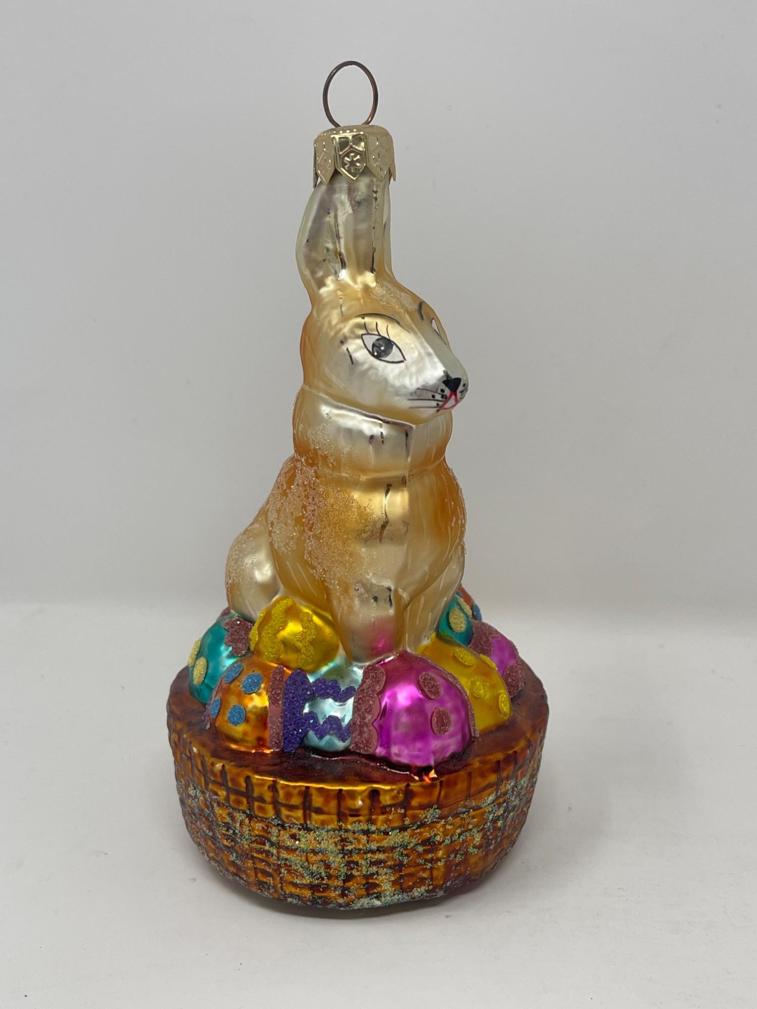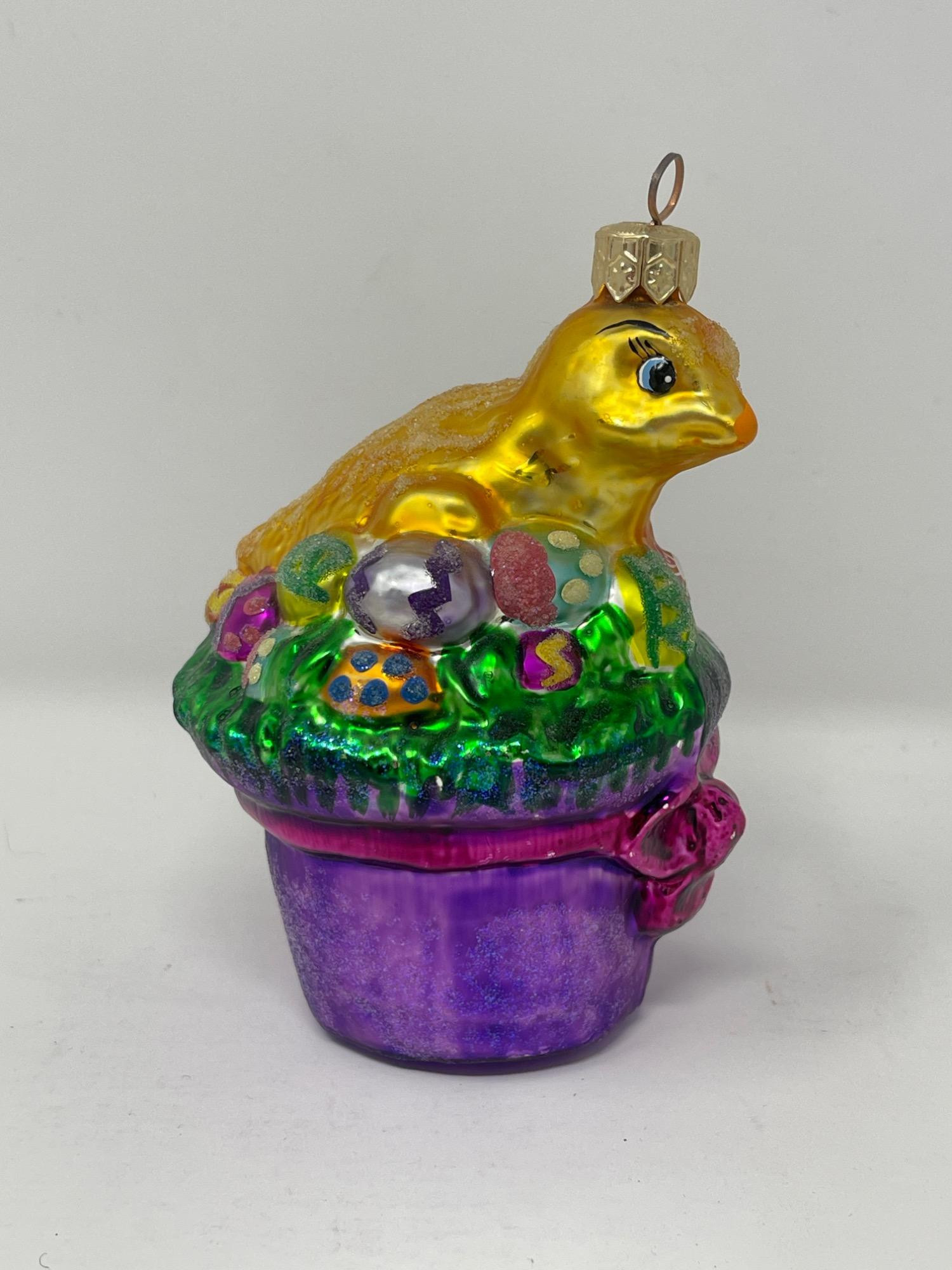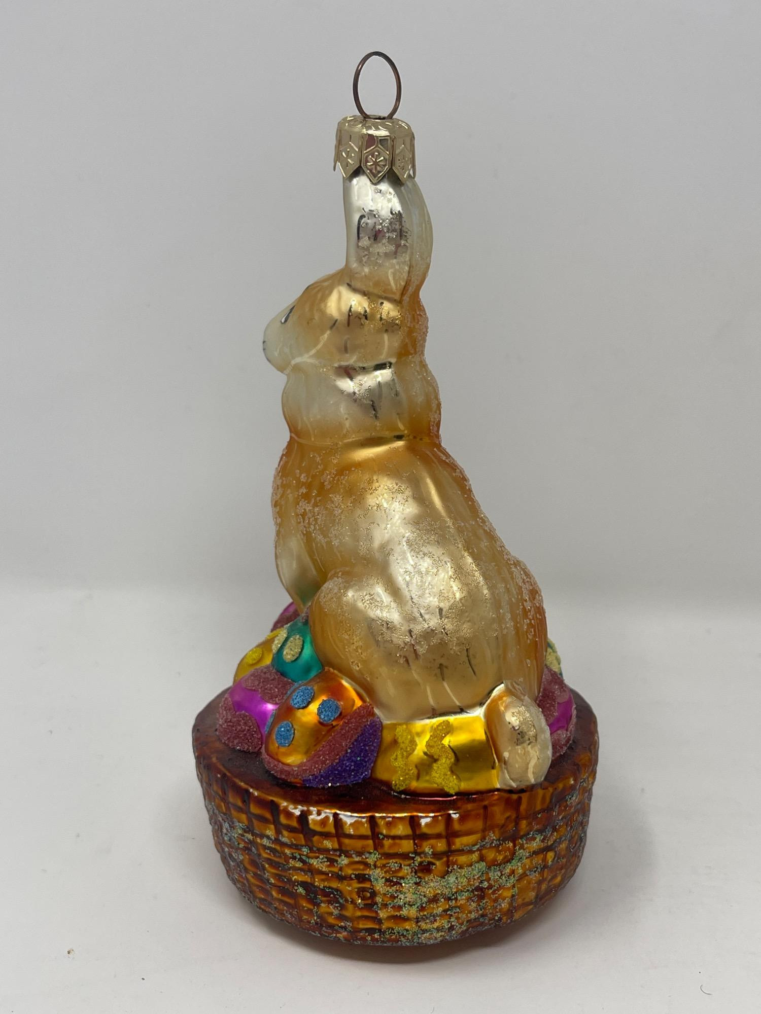 Christopher Radko Easter Ornaments - 2001 Nesting Chick & Bunny 4.5-6” H Celebrate Easter in style with these charming Christopher Radko ornaments from the 2001 Easter collection. This delightful duo includes the 'Nesting Chick' and the 'Bunny', each crafted from mouth-blown glass and meticulously hand-painted by skilled Polish artisans. The Nesting Chick features vibrant, colorful details atop a bed of Easter eggs, while the Bunny is elegantly posed in a festive basket. These limited edition pieces reflect Radko's commitment to quality and tradition, making them perfect for collectors seeking unique holiday decorations or thoughtful gifts. Each ornament took a week to create, highlighting their exclusivity and craftsmanship.