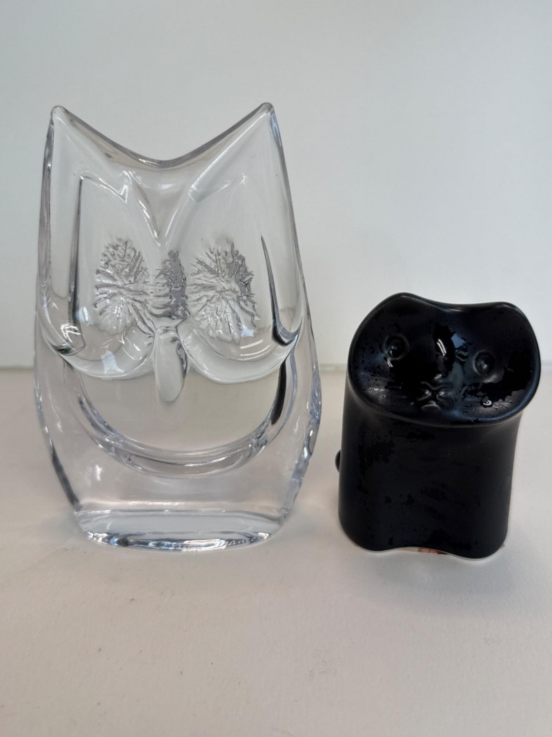 Daum Glass Owl & Mori Black Cat - Unique Artistic Creations Explore the artistic elegance of two unique pieces: a Daum glass owl and a Mori black cat. The owl, created by Daum, renowned for their exquisite crystal art, stands at 5.5 inches and features a sleek, minimalist design, highlighted by etched floral details that offer a glimpse into nature’s serene beauty. Accompanying the owl is the Mori black cat, a creation from the 1960s by Masahiro Mori, known for his award-winning porcelain designs in Japan. This cat, standing at 3.5 inches, captures a soulful, abstract expression, continuing its production in the same Japanese company that originally brought it to life. This set is perfect for collectors who appreciate the blend of modern design and traditional craftsmanship. Owl: 4" L x 1.5" W x 5.5" H Cat: 2.5" L x 2.25" W x 3.5" H