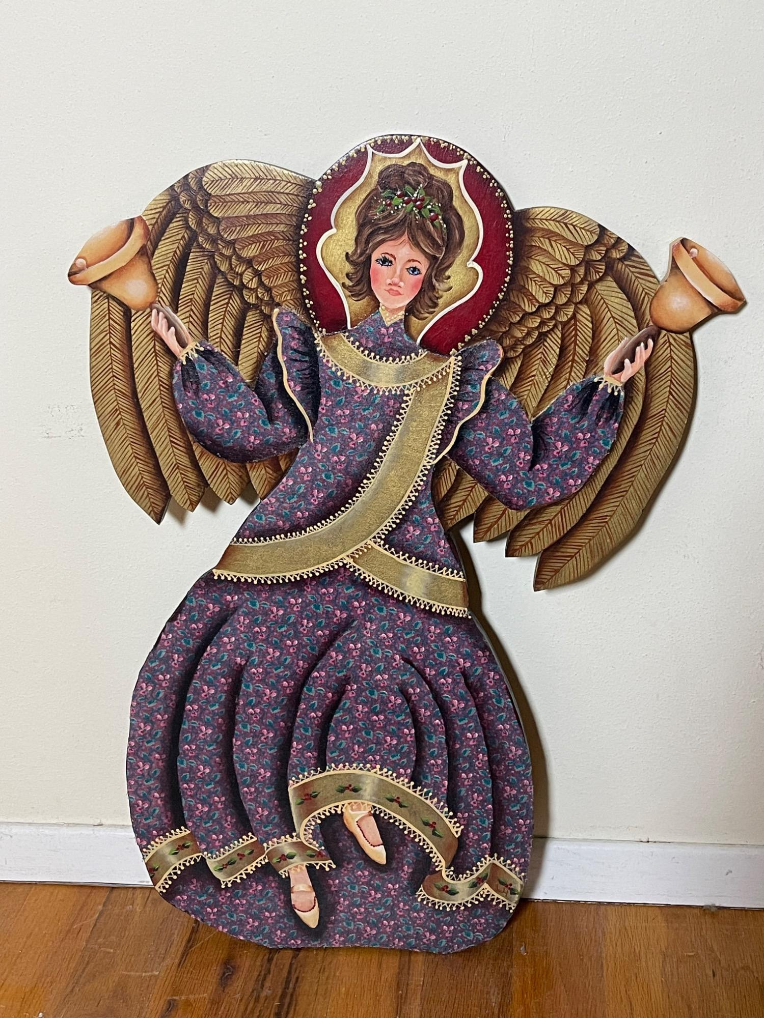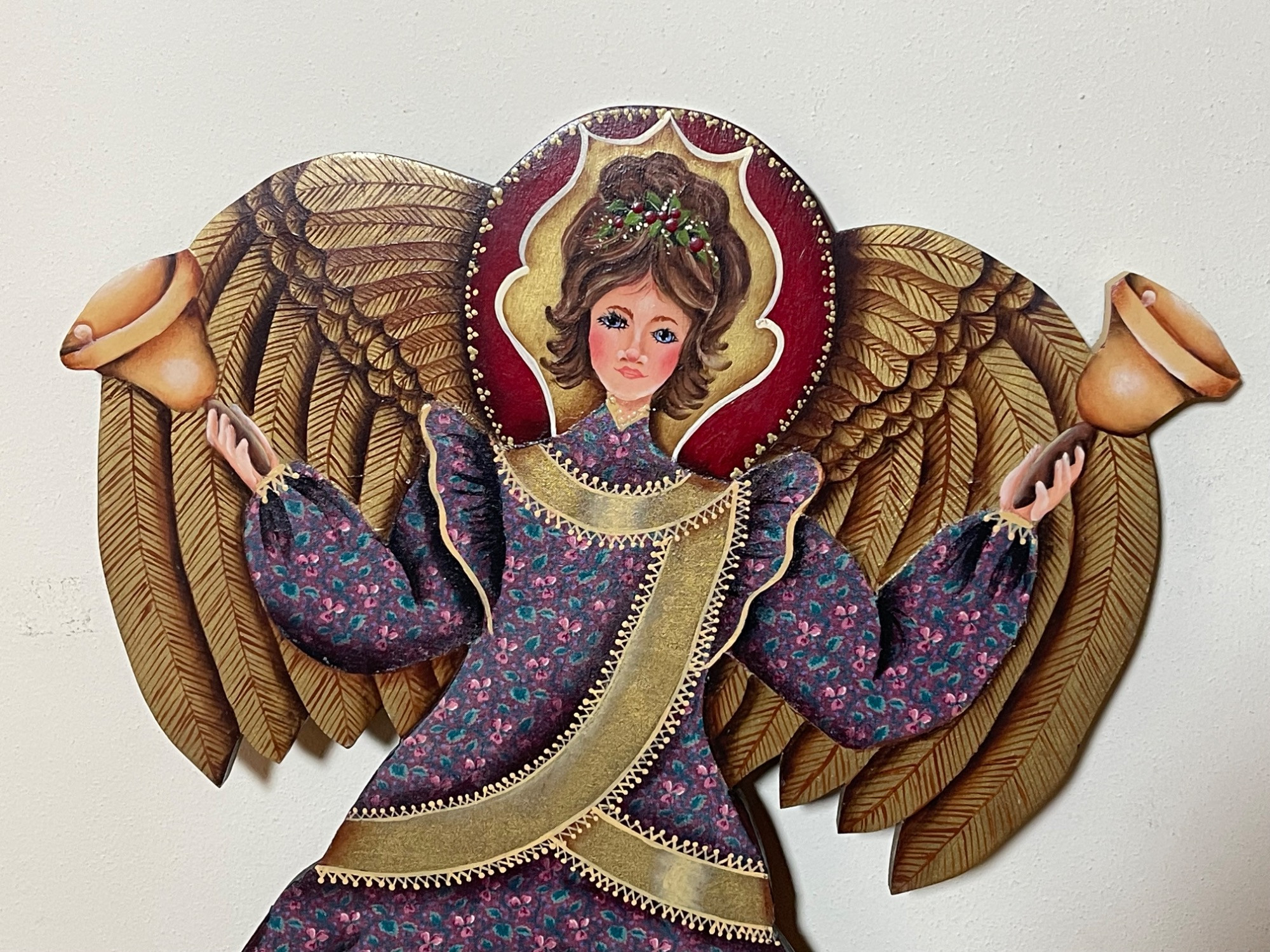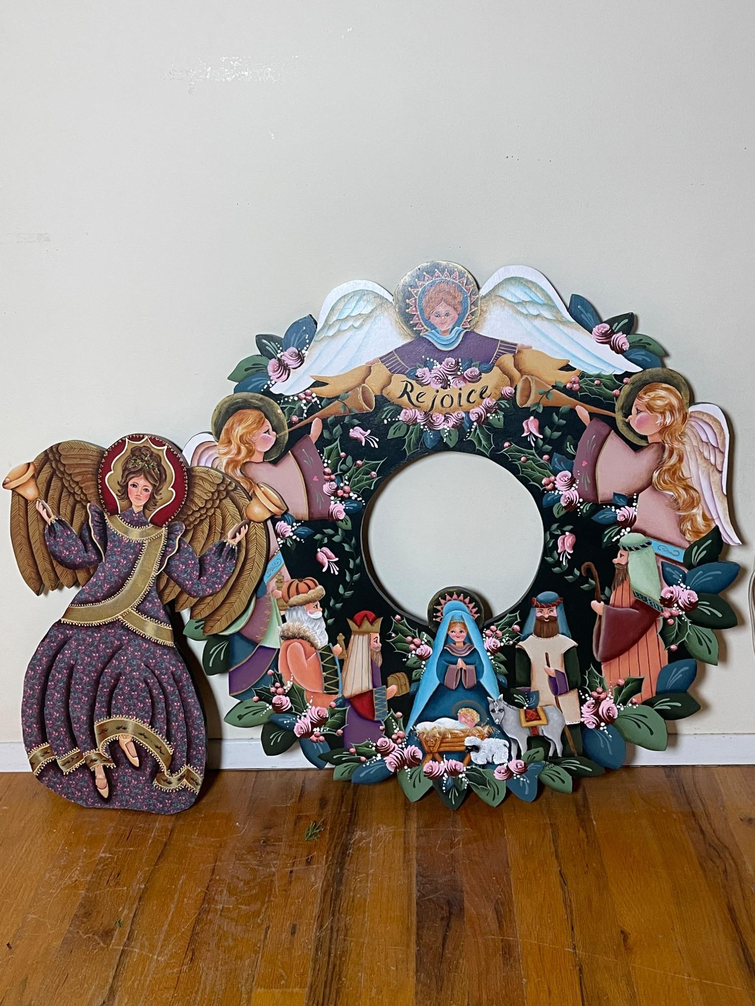 Judy Ouchida Nativity Wreath w/ Angel Paisley Design - Exquisite Decor Nativity Wreath - 28” W Angel - 15” W x 20” H Enhance your holiday decor with this breathtaking Nativity wreath, beautifully handcrafted by Judy Ouchida. This unique piece combines the spiritual grace of the Nativity scene with the intricate paisley patterns on angelic figures, creating a vibrant and inspiring display. Featuring a central depiction of the Holy Family surrounded by angels adorned in detailed, colorful paisley designs, this wreath is ideal for the Christmas season or as a focal point in religious art collections year-round, testament to skilled artistry and a celebration of faith.