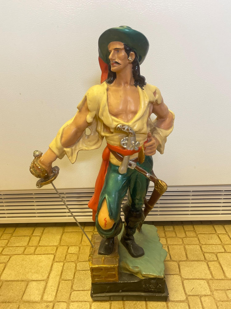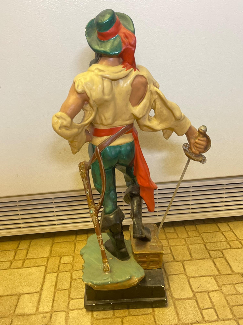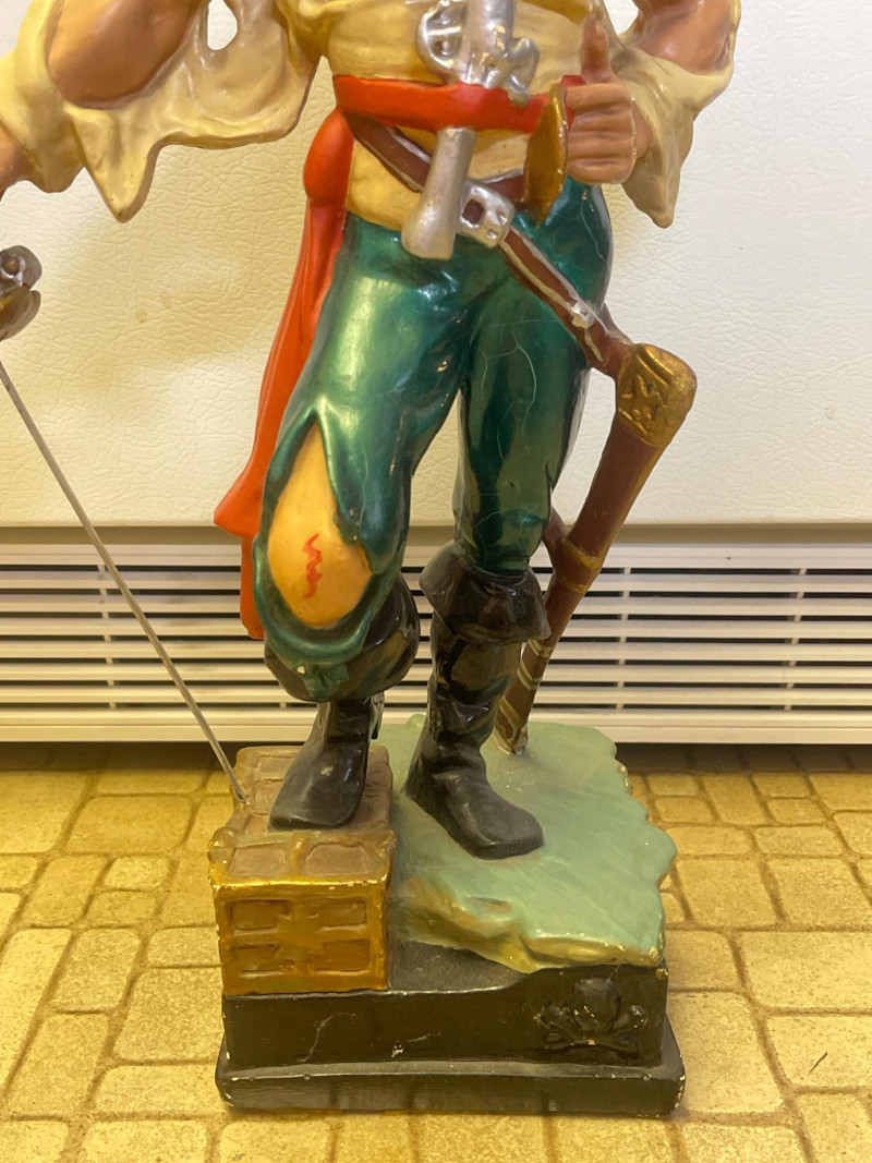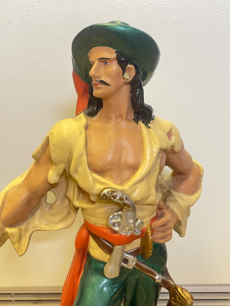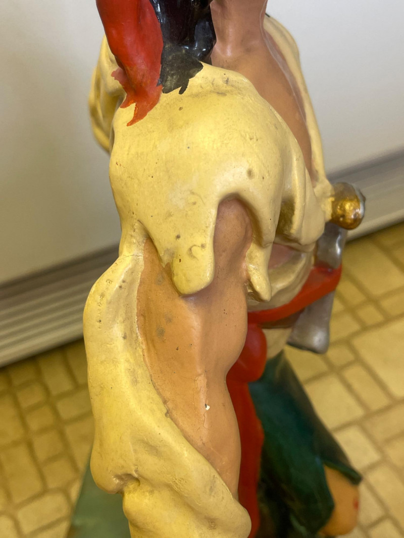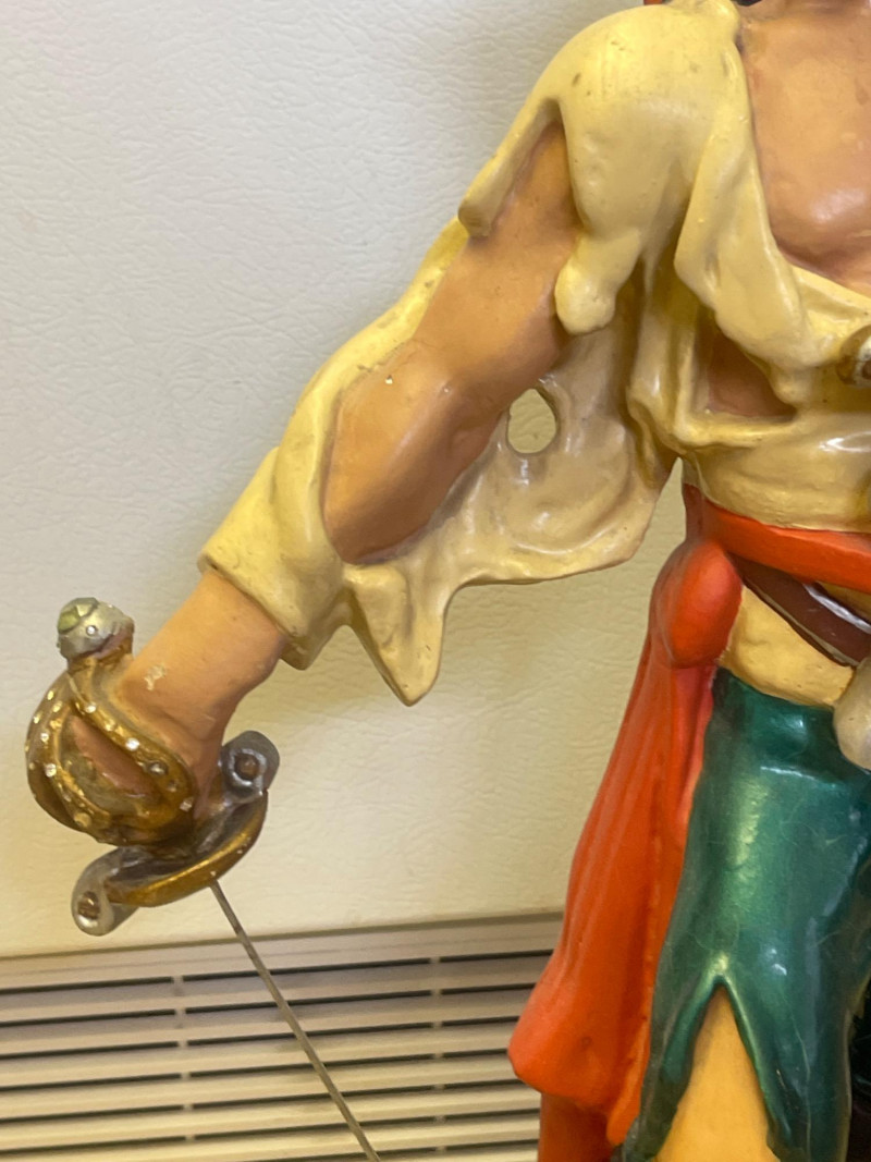 Striking 18-inch Pirate Statue - A Bold Decorative Piece Capture the spirit of adventure with this impressive 18-inch tall pirate statue. Though the material is unknown, this figure boasts a charismatic pose with a sword in hand, exuding the daring allure of a classic swashbuckler. The statue is vividly painted, featuring a dramatic ensemble of a yellow shirt, green pants, and a flowing red sash, under a dashing green hat. Please note, the statue shows signs of age with several cracks and chips in the paint, adding a rugged authenticity to its appearance. This piece is ideal for collectors who appreciate nautical themes or anyone looking to add a touch of bold flair to their decor.