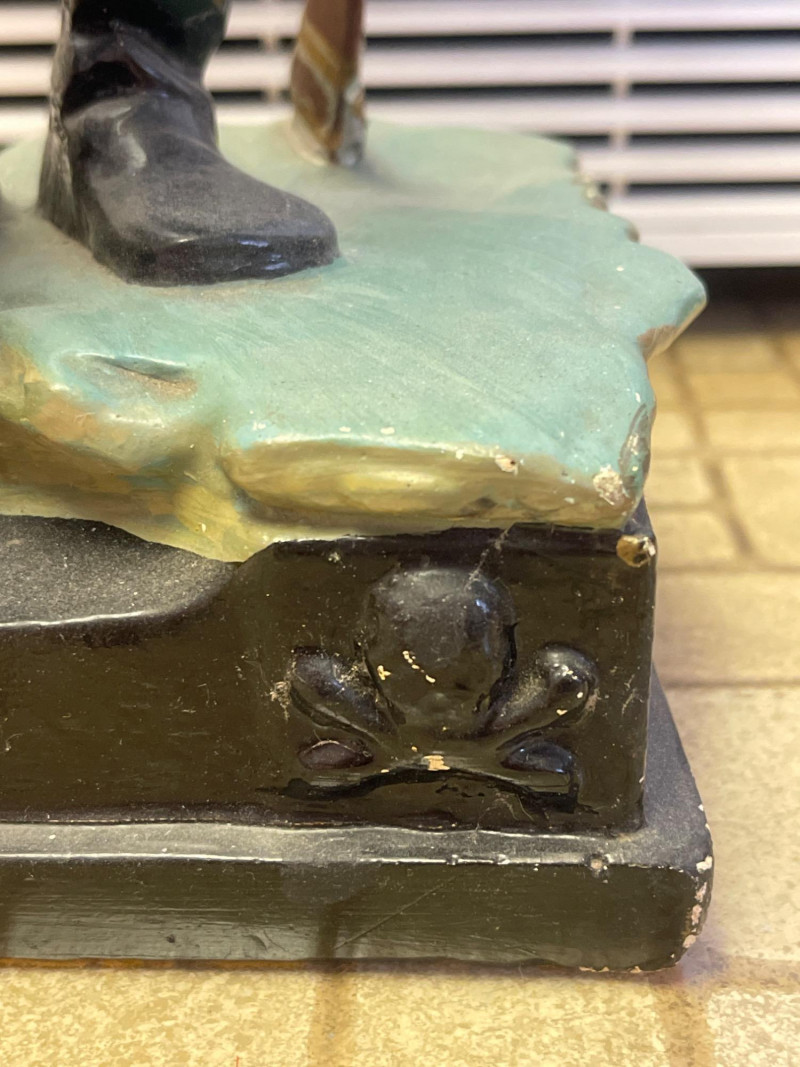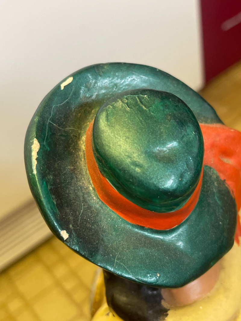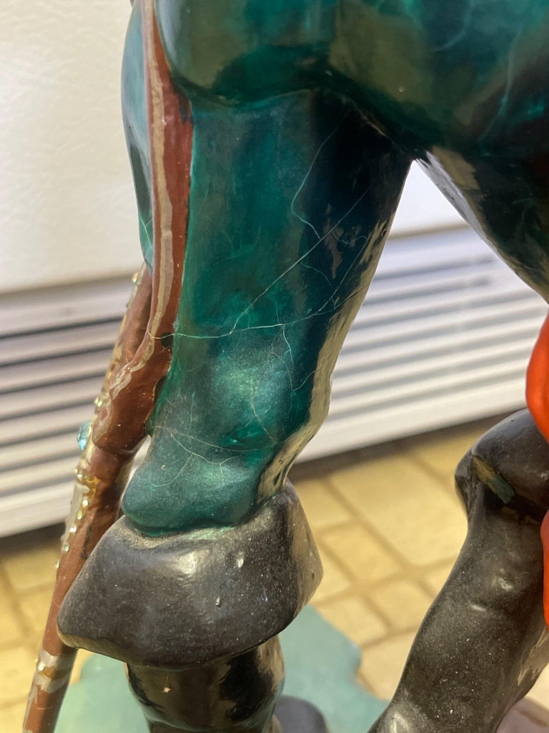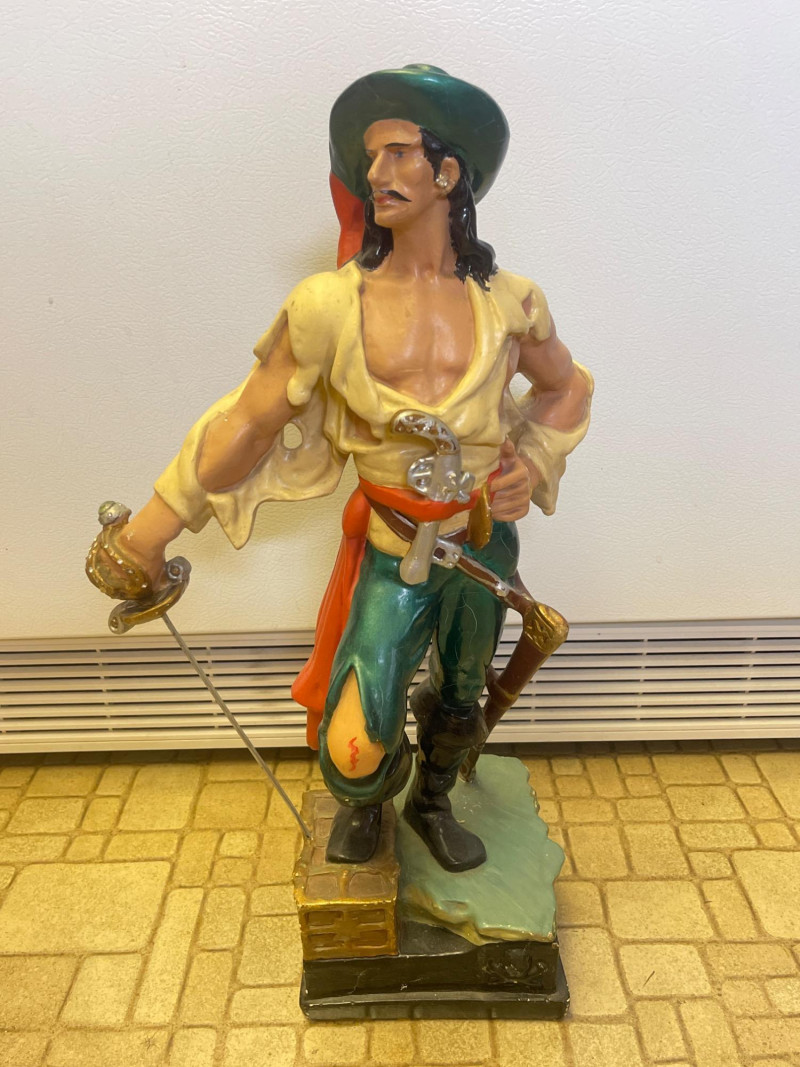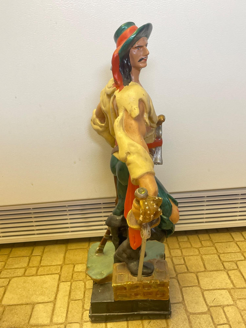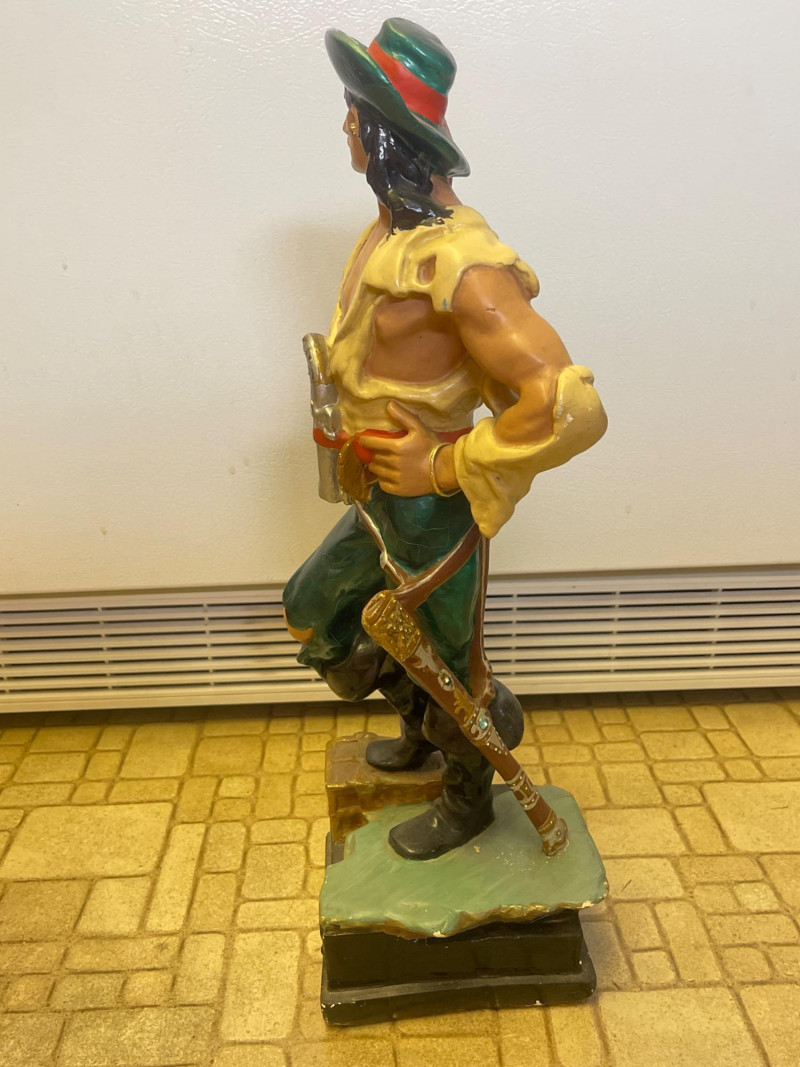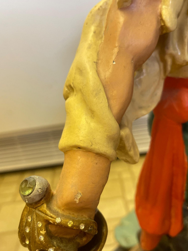 Striking 18-inch Pirate Statue - A Bold Decorative Piece Capture the spirit of adventure with this impressive 18-inch tall pirate statue. Though the material is unknown, this figure boasts a charismatic pose with a sword in hand, exuding the daring allure of a classic swashbuckler. The statue is vividly painted, featuring a dramatic ensemble of a yellow shirt, green pants, and a flowing red sash, under a dashing green hat. Please note, the statue shows signs of age with several cracks and chips in the paint, adding a rugged authenticity to its appearance. This piece is ideal for collectors who appreciate nautical themes or anyone looking to add a touch of bold flair to their decor.