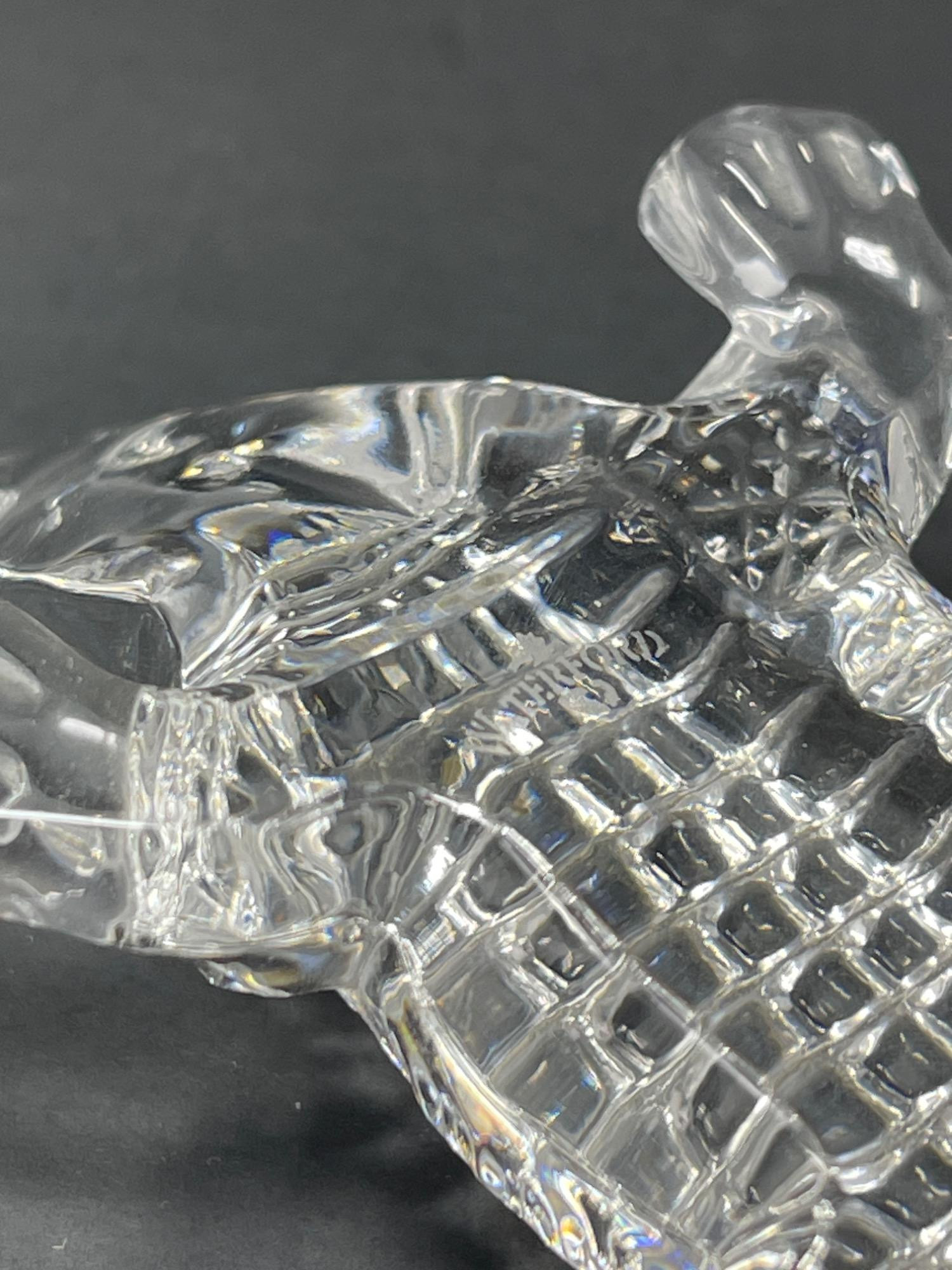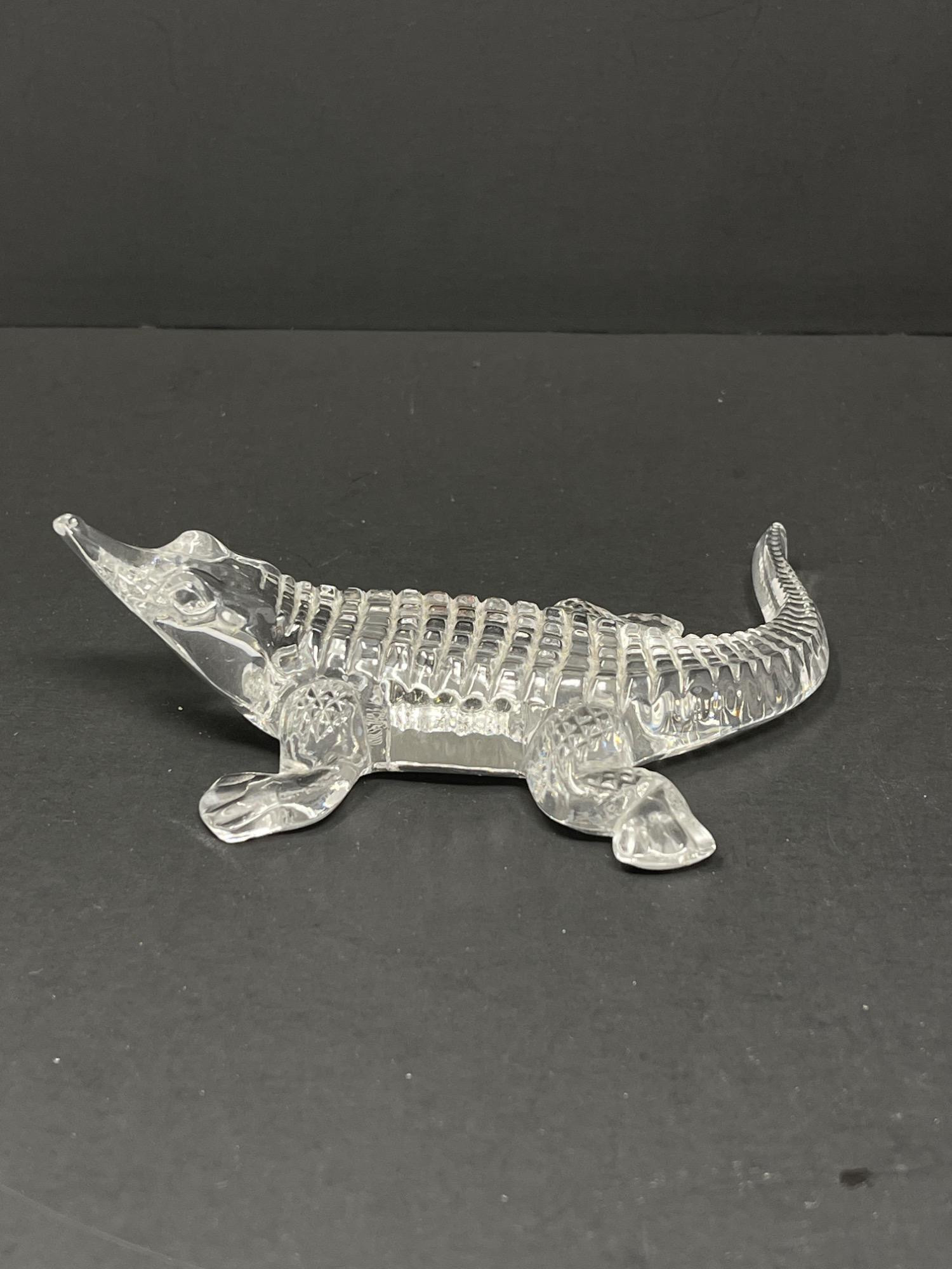 Waterford Crystal Alligator Figurine Embrace the exceptional craftsmanship of Waterford with this stunning crystal alligator figurine. Expertly handcrafted with the precision and quality Waterford is renowned for, this figurine captures the intricate details of an alligator's scales and features in sparkling crystal. Each facet reflects light beautifully, making this piece not only a striking display item but also a testament to the art of fine crystal glassmaking. Perfect for collectors of high-end crystal or enthusiasts of wildlife sculptures, this alligator adds a touch of elegance and wild charm to any setting.