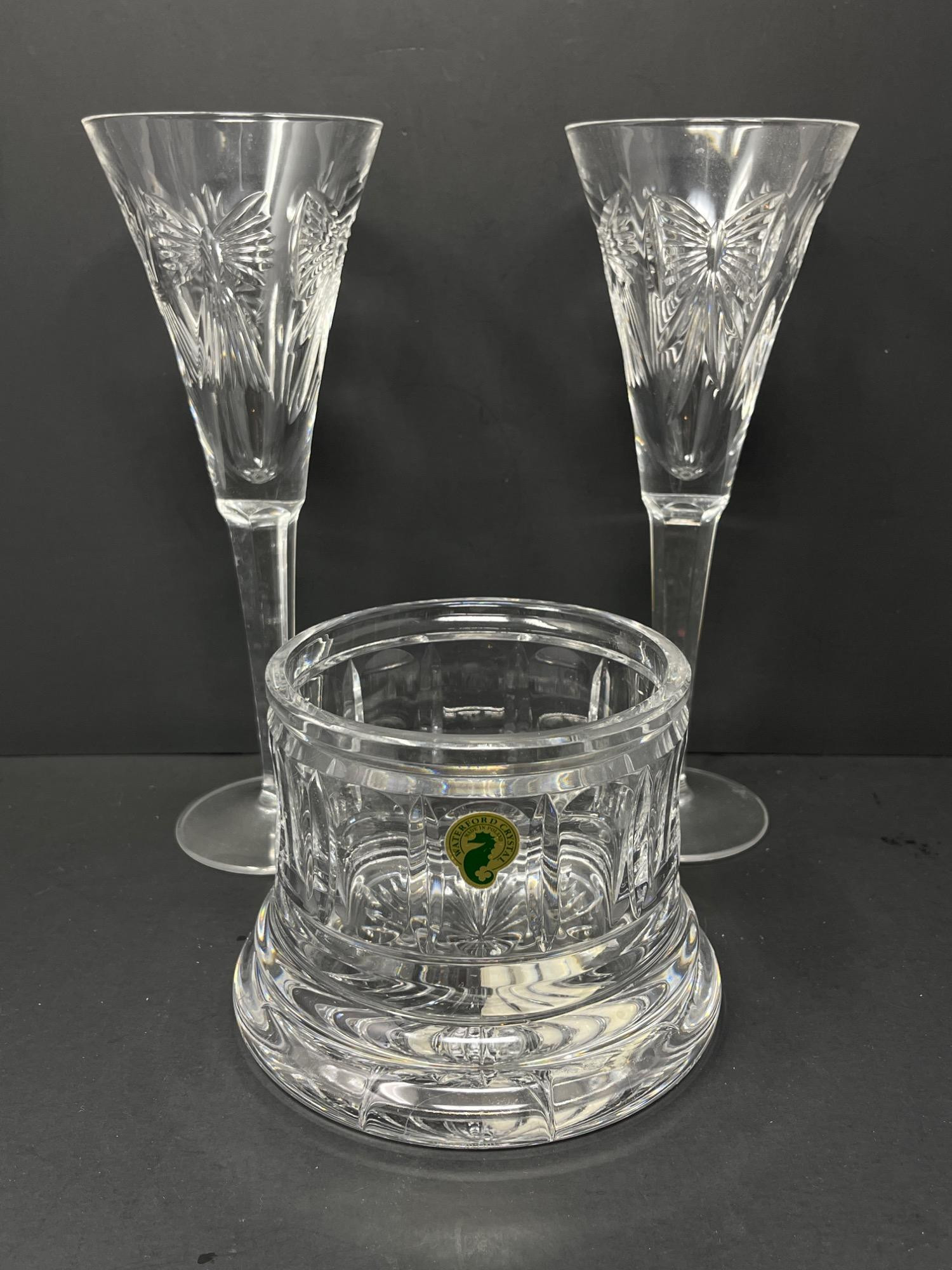 Lot # 33 - Waterford Crystal Millennium Series Fluted Champagne Glasses + Coaster