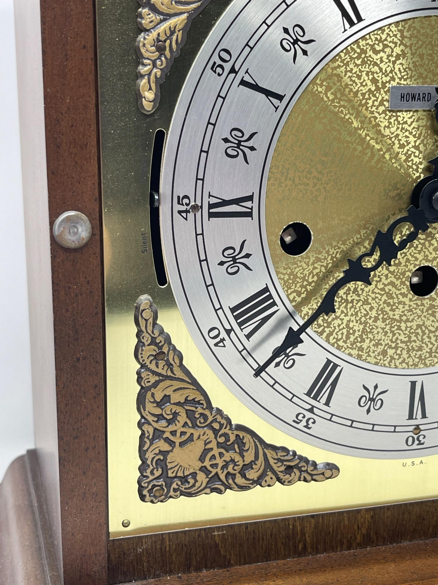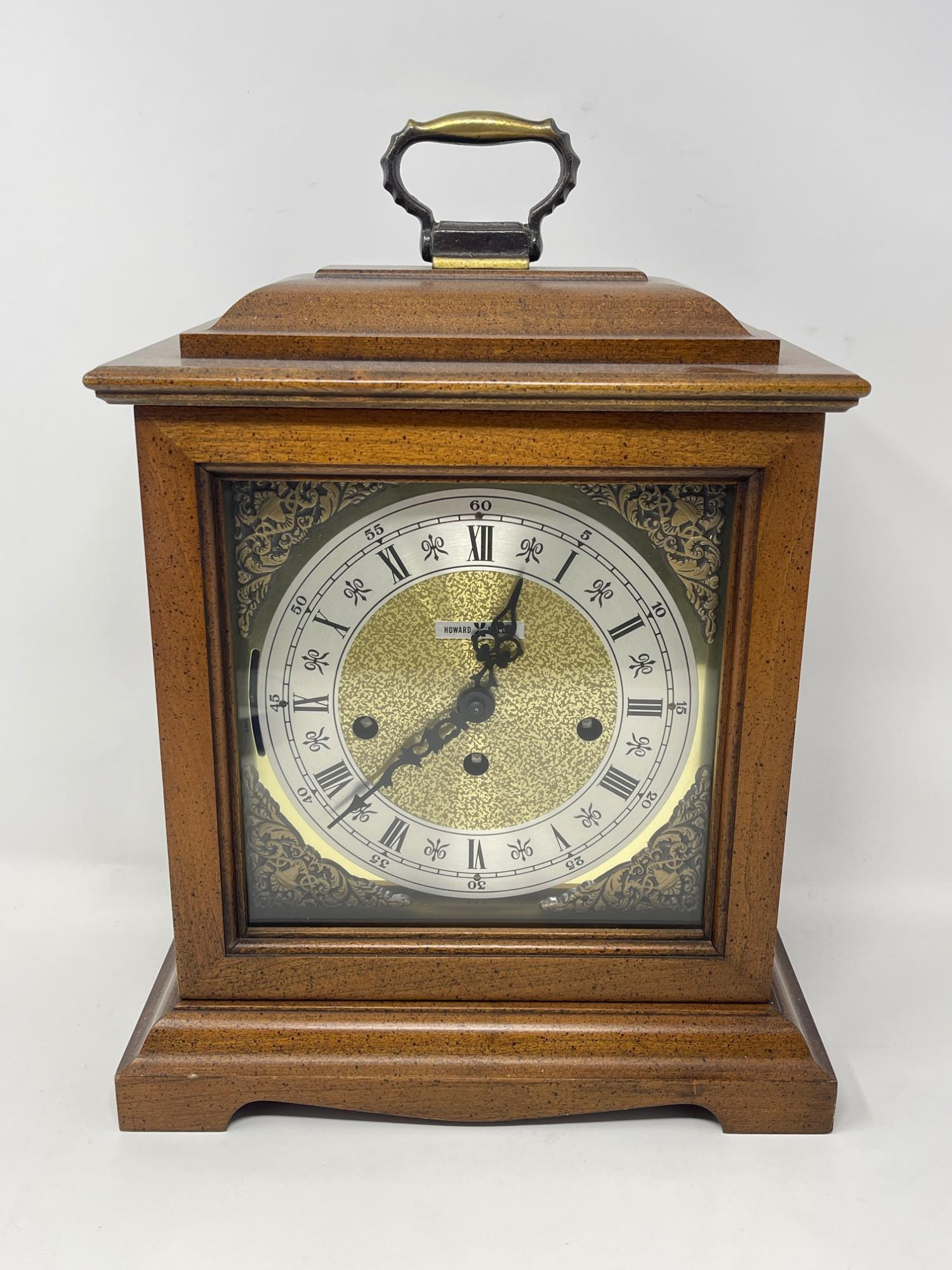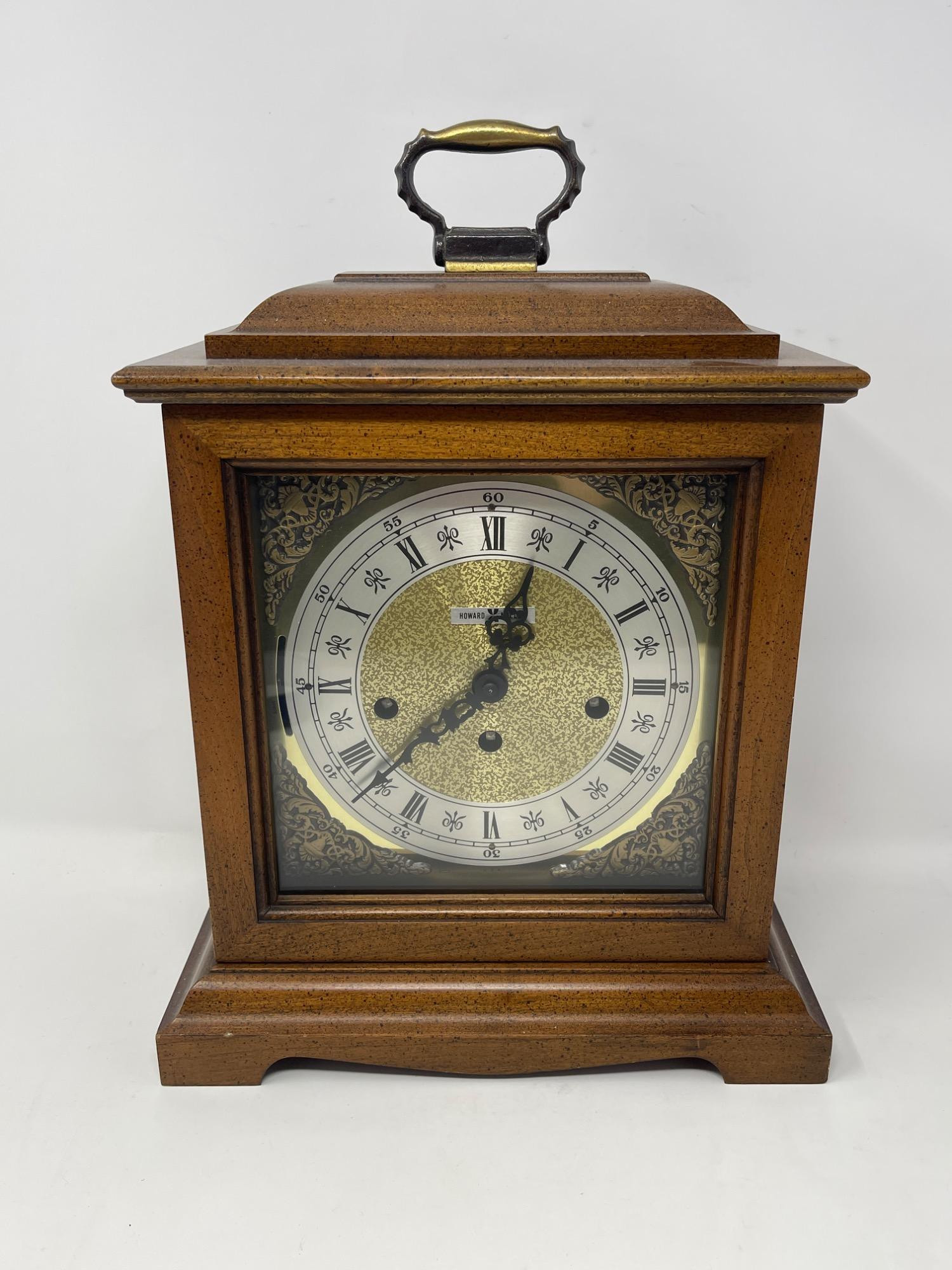 Howard Miller Traditional Mantel Clock - Elegant Wood & Brass Design This Howard Miller mantel clock combines timeless elegance with classic design, perfect for adding a touch of sophistication to any room. Crafted with a rich wooden casing and featuring a brass handle and intricate face detailing, this clock is both functional and decorative. The roman numerals and ornate hands against the golden background make it easy to read and aesthetically pleasing. Ideal for collectors of fine timepieces or as a distinguished gift, this Howard Miller clock promises reliability and style in one exquisite package. Condition: Minor scuffs and stains. NOT currently function.