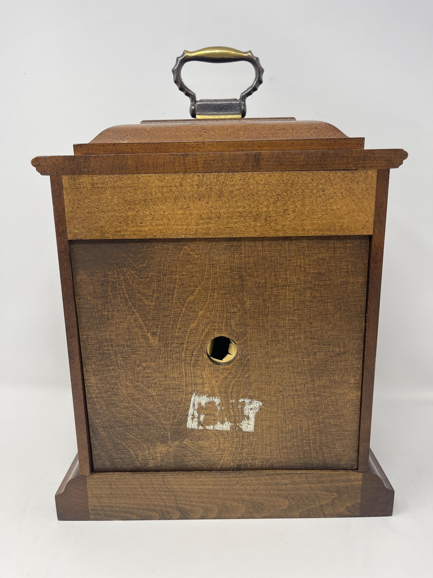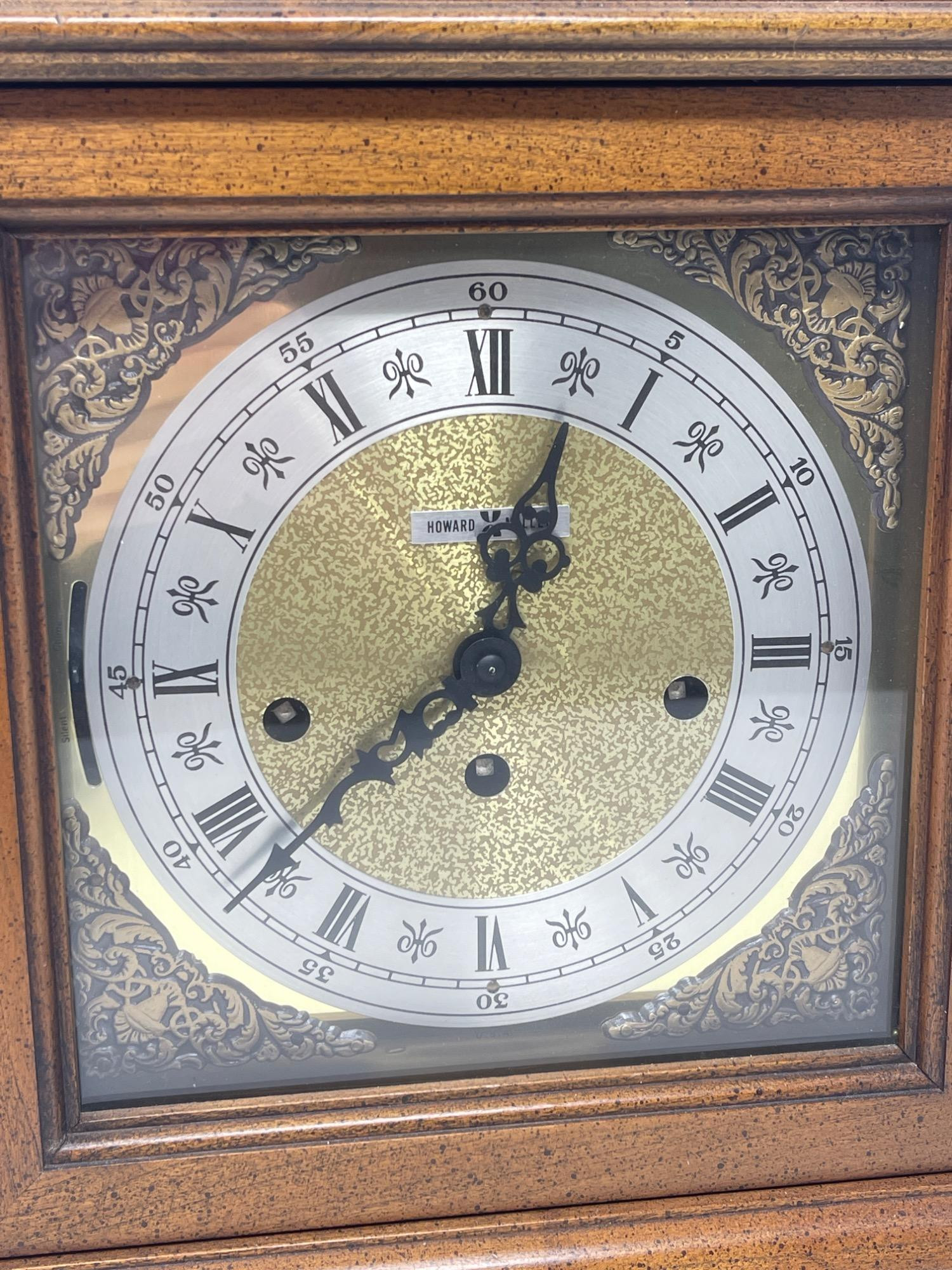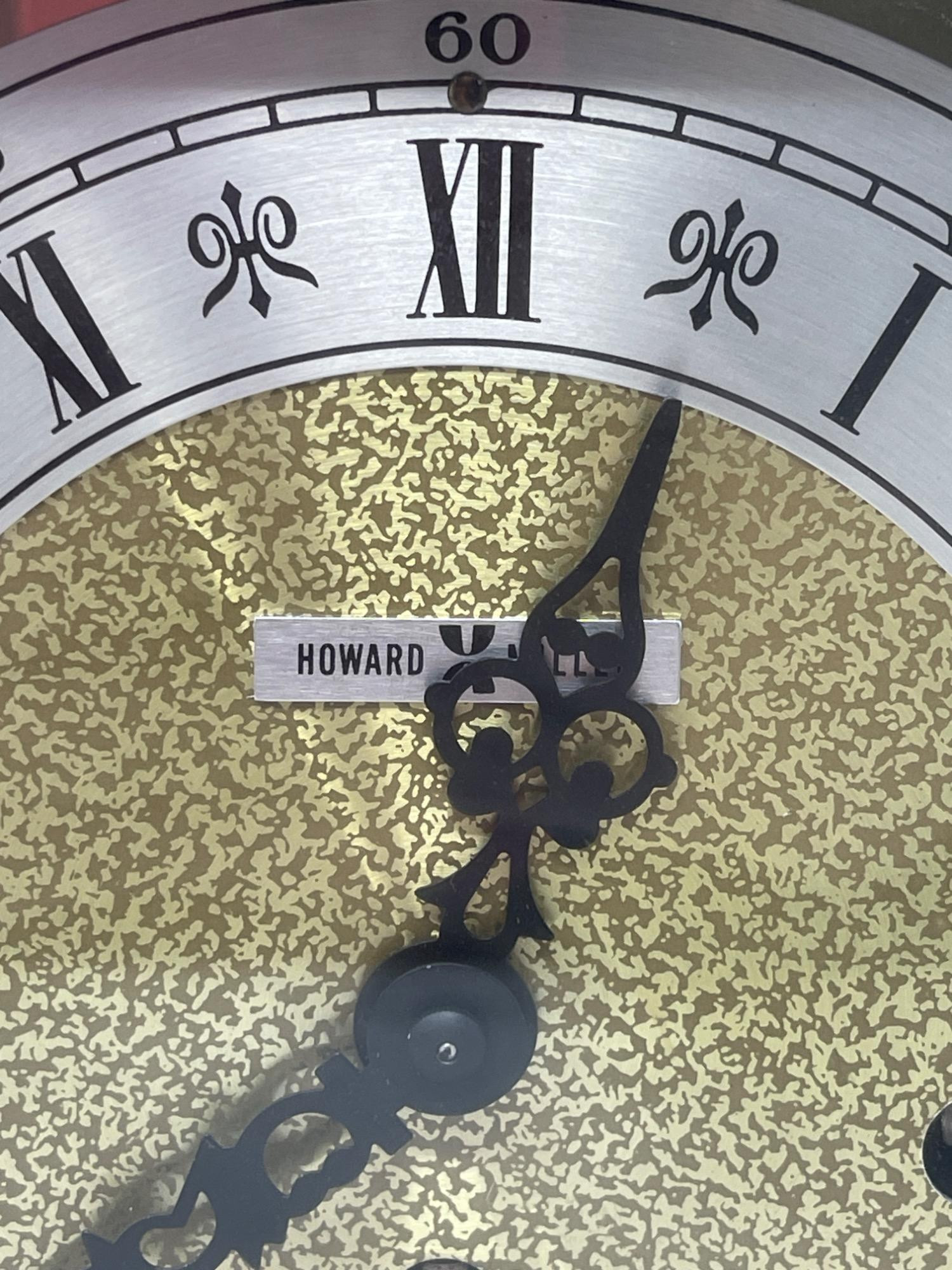 Howard Miller Traditional Mantel Clock - Elegant Wood & Brass Design This Howard Miller mantel clock combines timeless elegance with classic design, perfect for adding a touch of sophistication to any room. Crafted with a rich wooden casing and featuring a brass handle and intricate face detailing, this clock is both functional and decorative. The roman numerals and ornate hands against the golden background make it easy to read and aesthetically pleasing. Ideal for collectors of fine timepieces or as a distinguished gift, this Howard Miller clock promises reliability and style in one exquisite package. Condition: Minor scuffs and stains. NOT currently function.