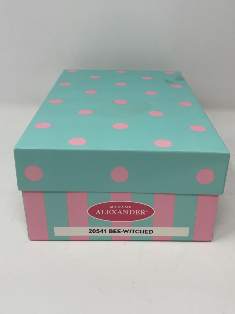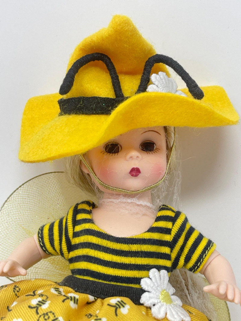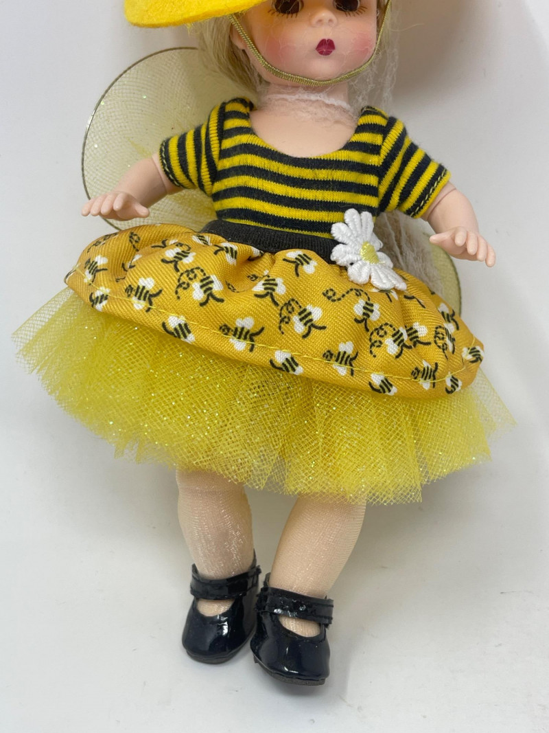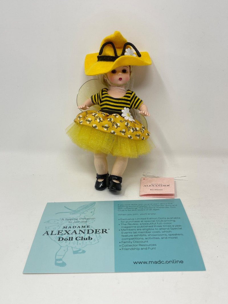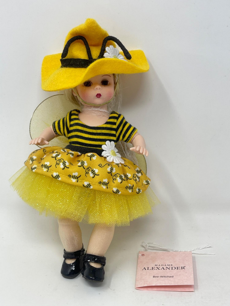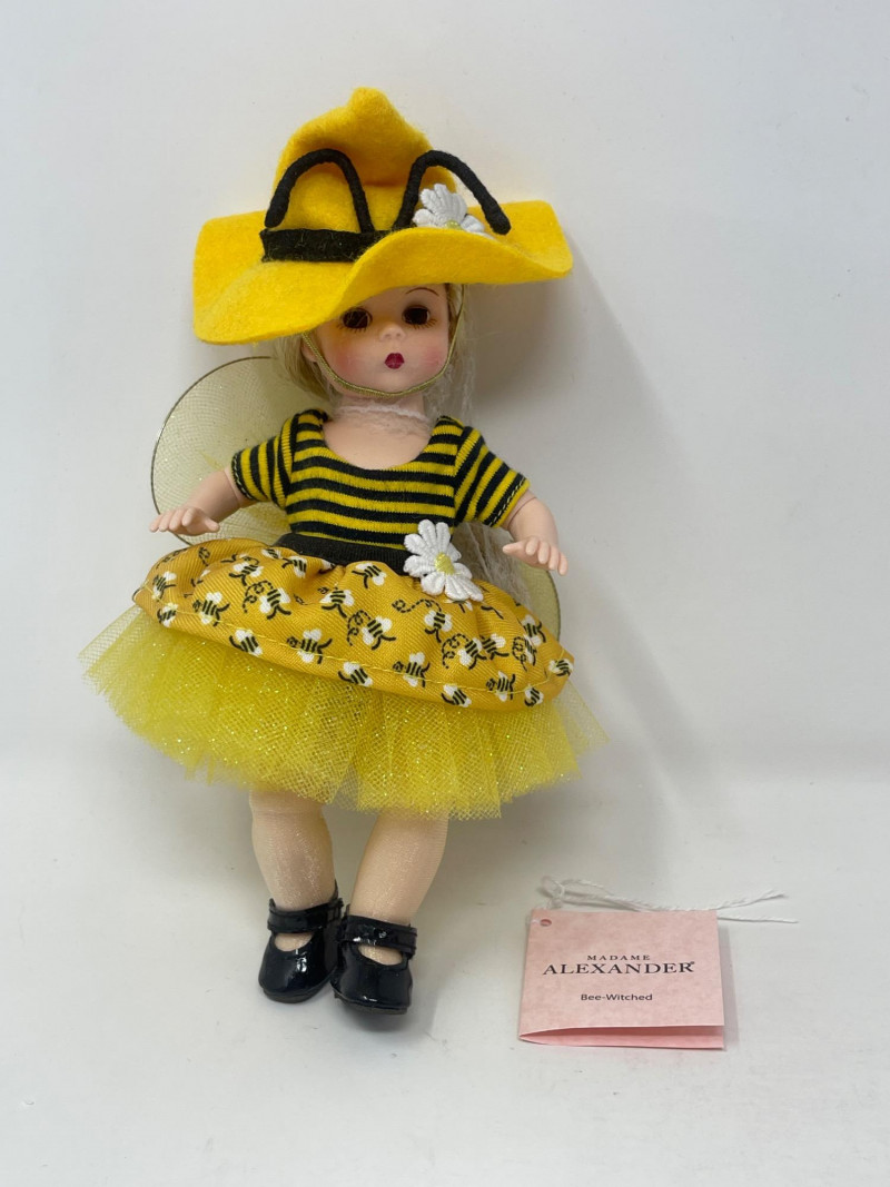 Madame Alexander 'Bee-Witched' Collectible Doll, 2022 Delight in the charm of the 2022 Madame Alexander 'Bee-Witched' doll, a playful and enchanting addition to any collection. Dressed in a striking yellow and black ensemble complete with a whimsical bee-themed tulle skirt and a bold yellow hat, this doll captures the creative spirit of Madame Alexander's renowned craftsmanship. Standing with vibrant detail and exquisite design, this collectible is perfect for enthusiasts of unique dolls and makes a wonderful gift. It comes with original packaging and documentation, ensuring its value and authenticity.