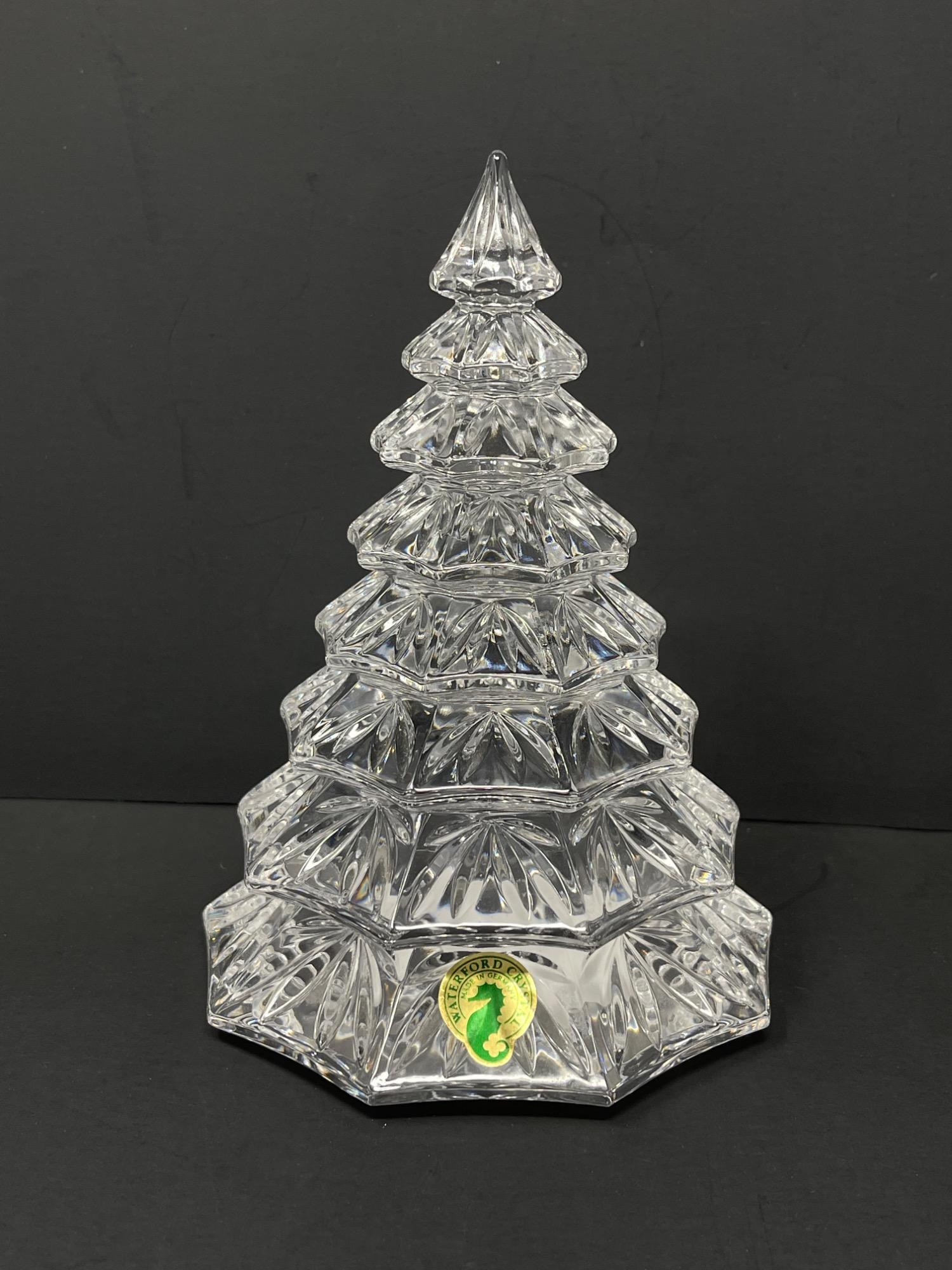 Elegant Waterford Crystal Christmas Tree - 6.5 Inches High Celebrate the season with this exquisite Waterford Crystal Christmas Tree, standing 6.5 inches tall. This finely crafted tree is a stunning display of craftsmanship, featuring intricate cuts that capture and reflect light beautifully, adding a sparkling ambiance to any holiday decor. With its classic design and high-quality crystal, this piece is a perfect addition to your festive decorations or as a cherished gift for someone special. Embodying the elegance and quality Waterford is known for, this crystal Christmas tree makes a timeless treasure in any collection.
