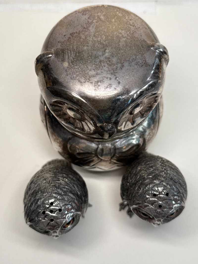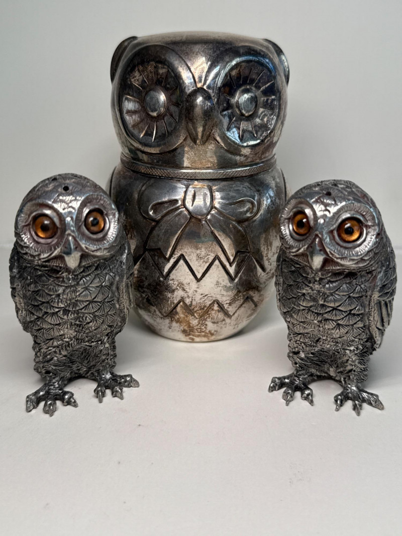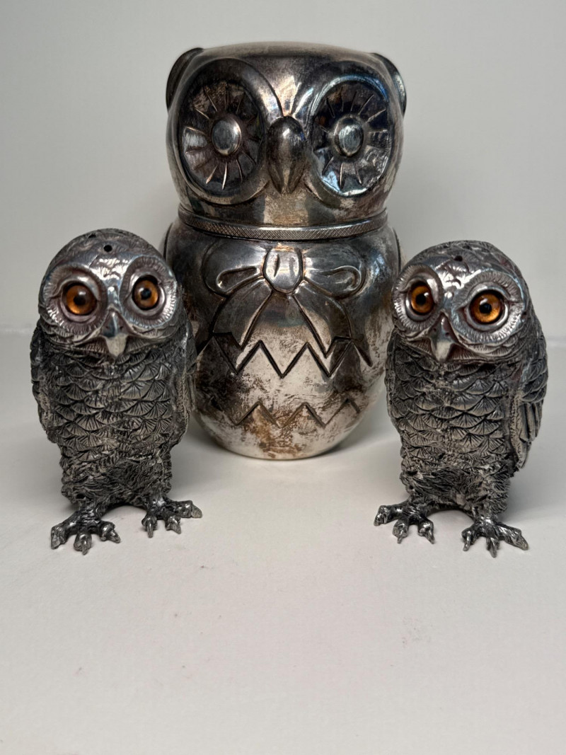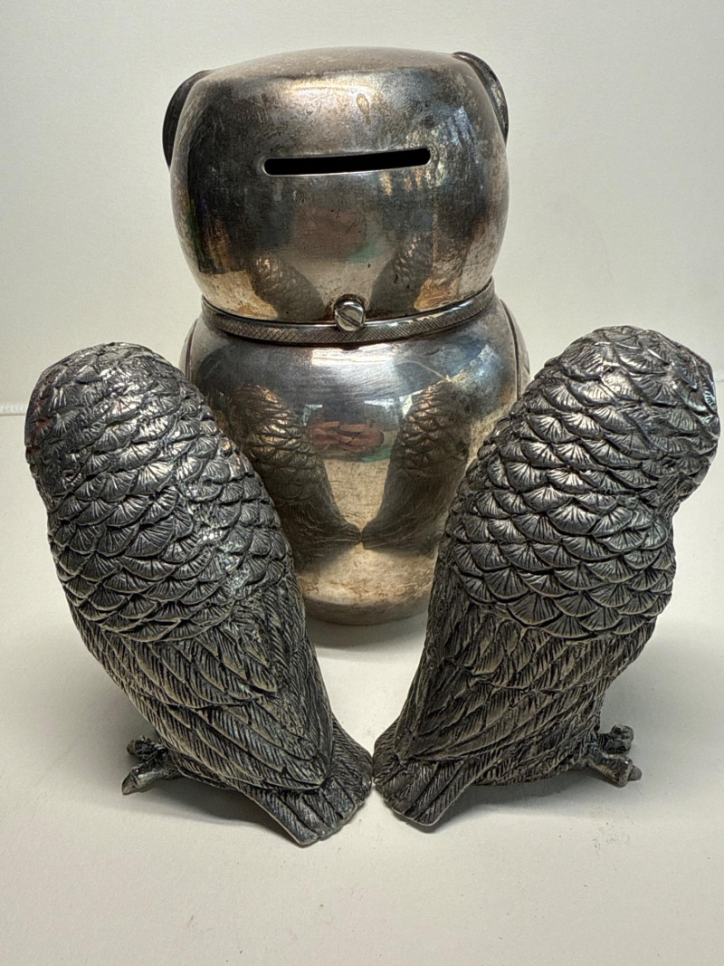 Lot # 39 - Vintage 1968 Silverplate Owl Bank + Matching Salt & Pepper Shakers