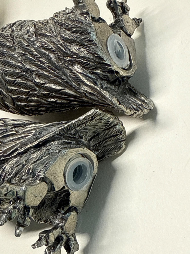 Vintage 1968 Silverplate Owl Bank + Matching Salt & Pepper Shakers Delve into the charm of vintage decor with this unique set featuring a 1968 silverplate owl bank paired with matching owl salt and pepper shakers. The owl bank, measuring 5.5 inches tall and 3.5 inches wide, offers a delightful mix of functionality and whimsy with its detailed feather texture and classic design. Accompanying it are the intricately designed salt and pepper shakers, each standing 3.75 inches tall and 2 inches wide, perfect for adding a touch of vintage flair to your dining setting. This set not only serves as a functional household item but also as a collectible piece that captures the nostalgic essence of the past. Bank: 3.5" W x 5.5" H Shakers: 2" W x 3.75" H