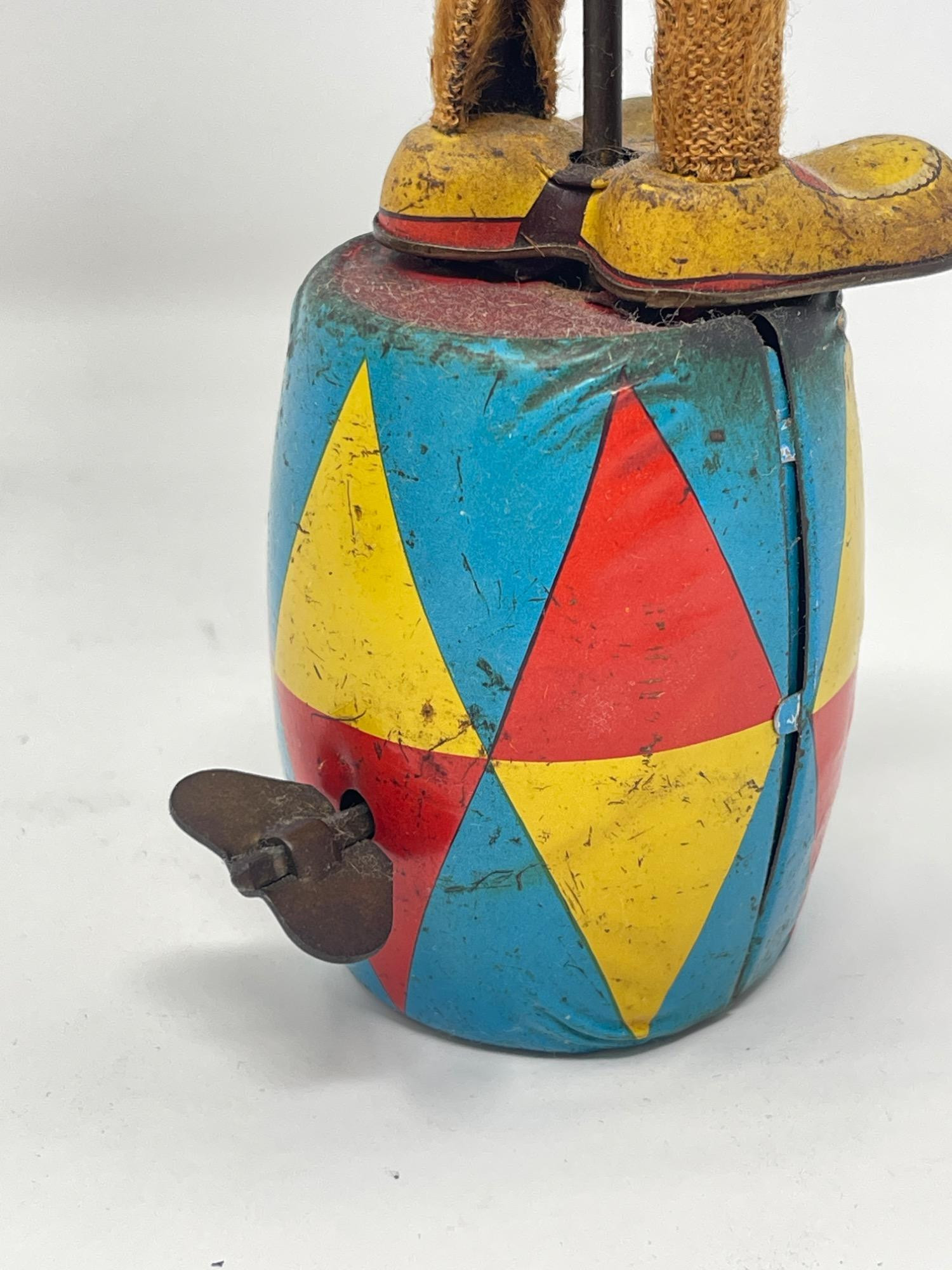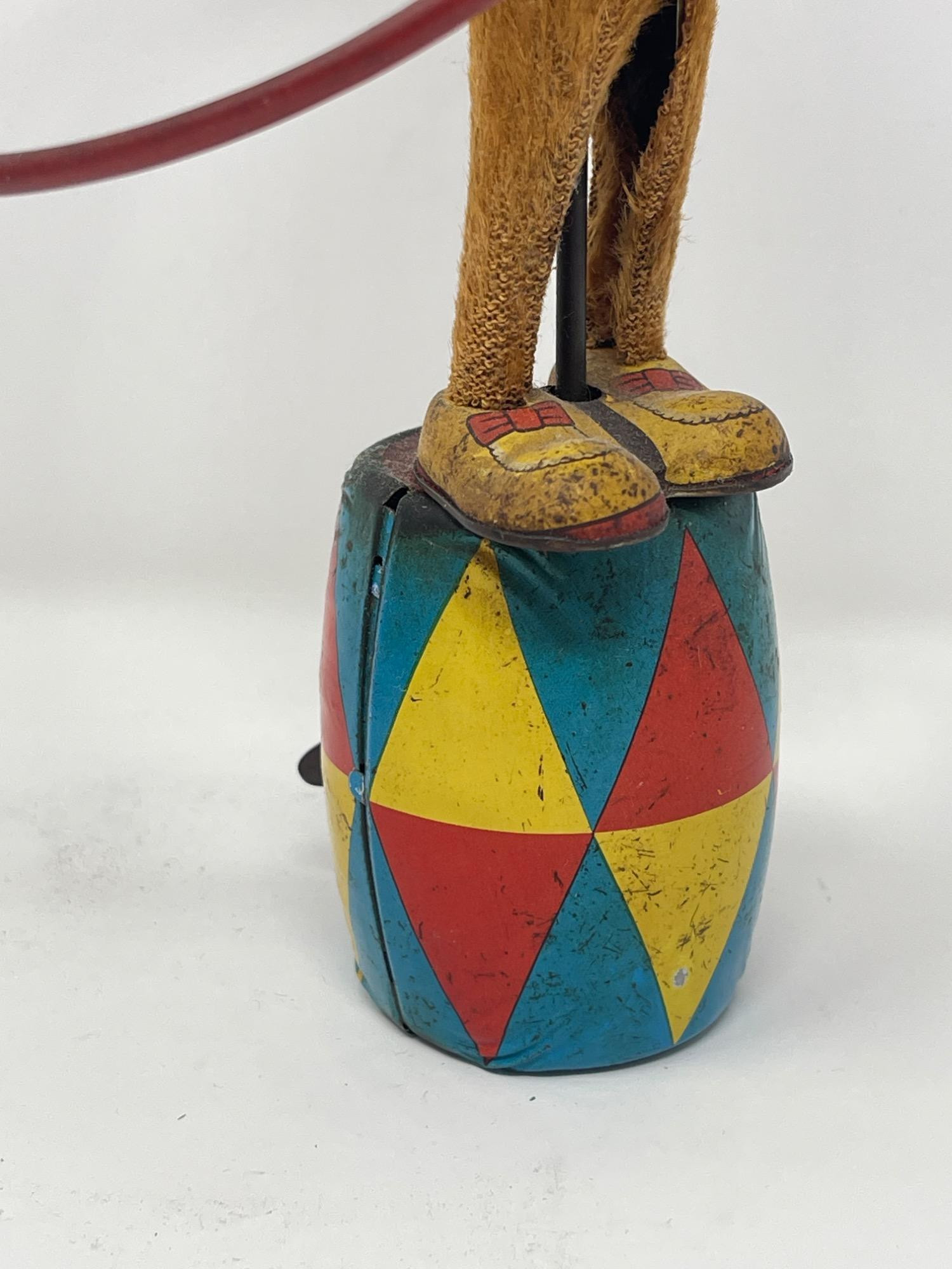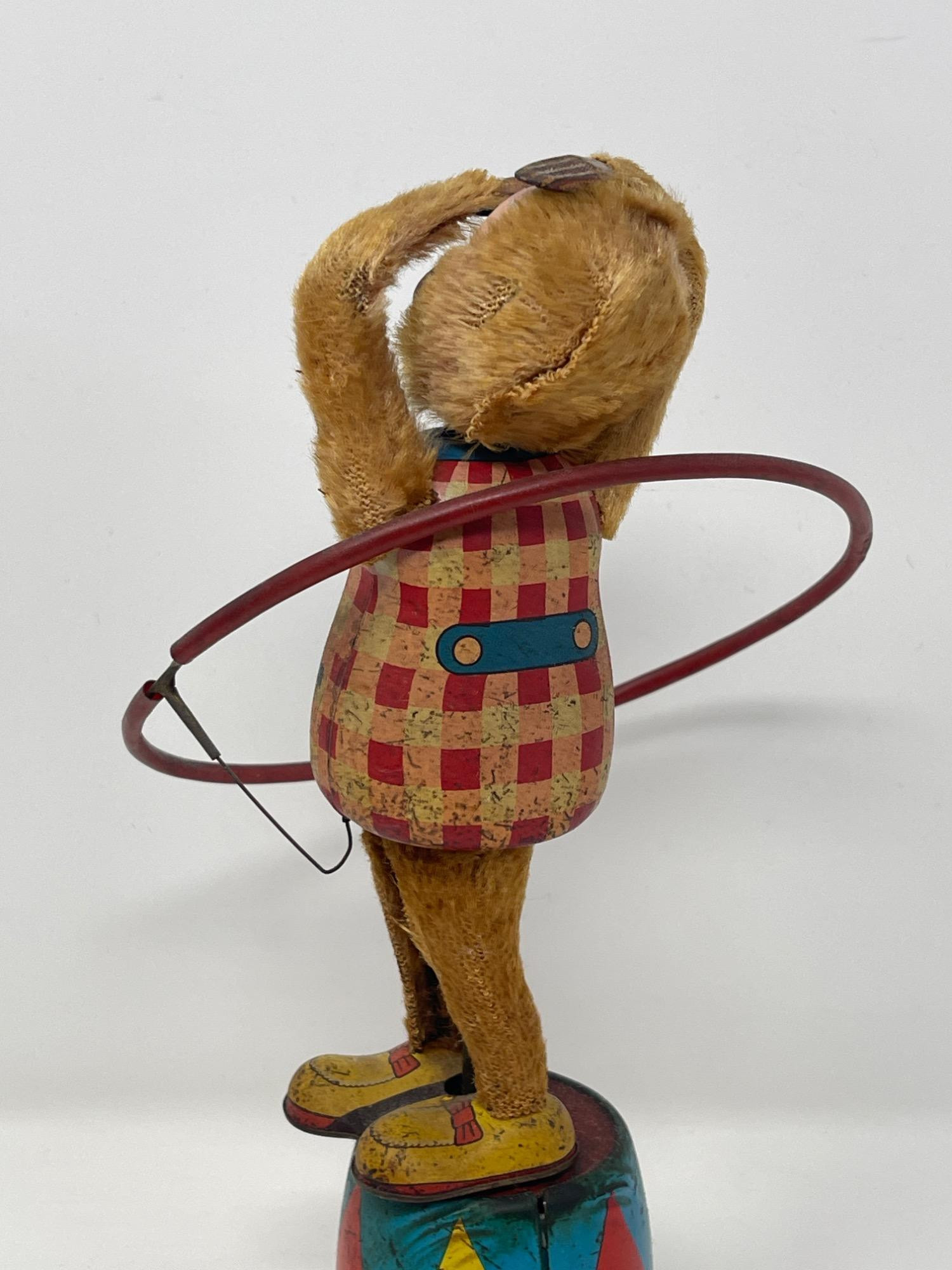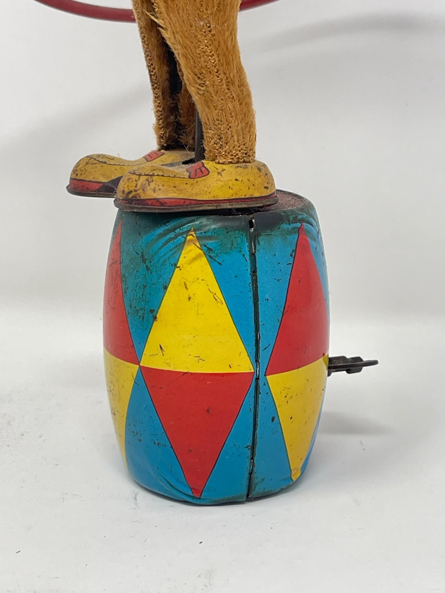 Tim the Mechanical Hula Hoop Monkey - Vintage Collectible Toy Meet Tim, the mechanical hula hoop monkey, a delightful and engaging collectible from a bygone era. Dressed in a vibrant checkered tunic and perched atop a colorful geometric pedestal, Tim brings a nostalgic circus theme to life. This unique mechanical toy enchants as he skillfully twirls his hula hoop, showcasing the charming mechanics of vintage toys. Ideal for collectors or as a whimsical decorative piece, Tim exemplifies the craftsmanship and playful design of historical playthings, making him a must-have for any collection of classic toys or circus memorabilia.