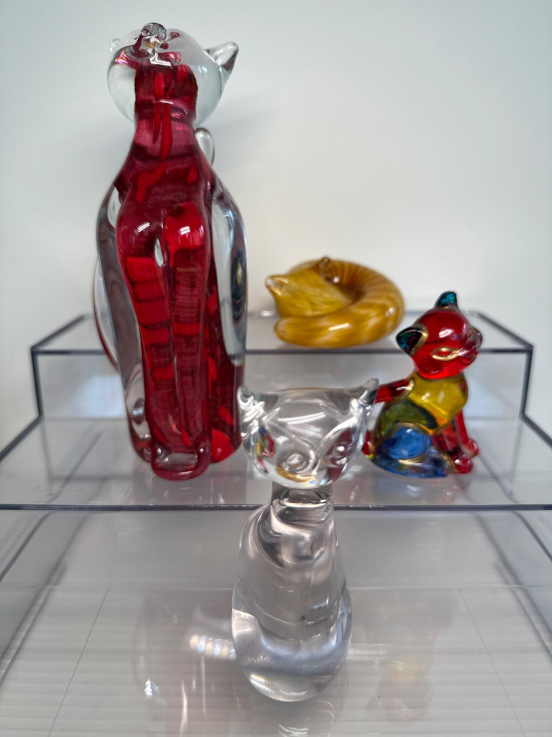 Art Glass Cat Collection: Zecchin, Jaros & Vintage Figurines - Signed. These are a collection of vibrant and eclectic glass figurines: Zecchin Multi-Color Glass: An exquisite small piece, standing 3.2 inches tall and 2.2 inches long, featuring a colorful design typical of Zecchin's artistic glasswork. Sleeping Kitty: A charming clear glass kitty, measuring 3 inches in diameter and 1.5 inches in height, perfect for cat lovers and collectors of minimalist art. Vintage Clear Glass: A simple yet elegant clear glass sculpture, 4.2 inches tall and 2.5 inches long. Jaros Red and Clear Cat: A striking figure from Jaros Glass Works, it stands 7 inches tall with a width of 3 inches and a length of 3 inches, made in the Czech Republic and known for its vibrant red and clear glass craftsmanship.