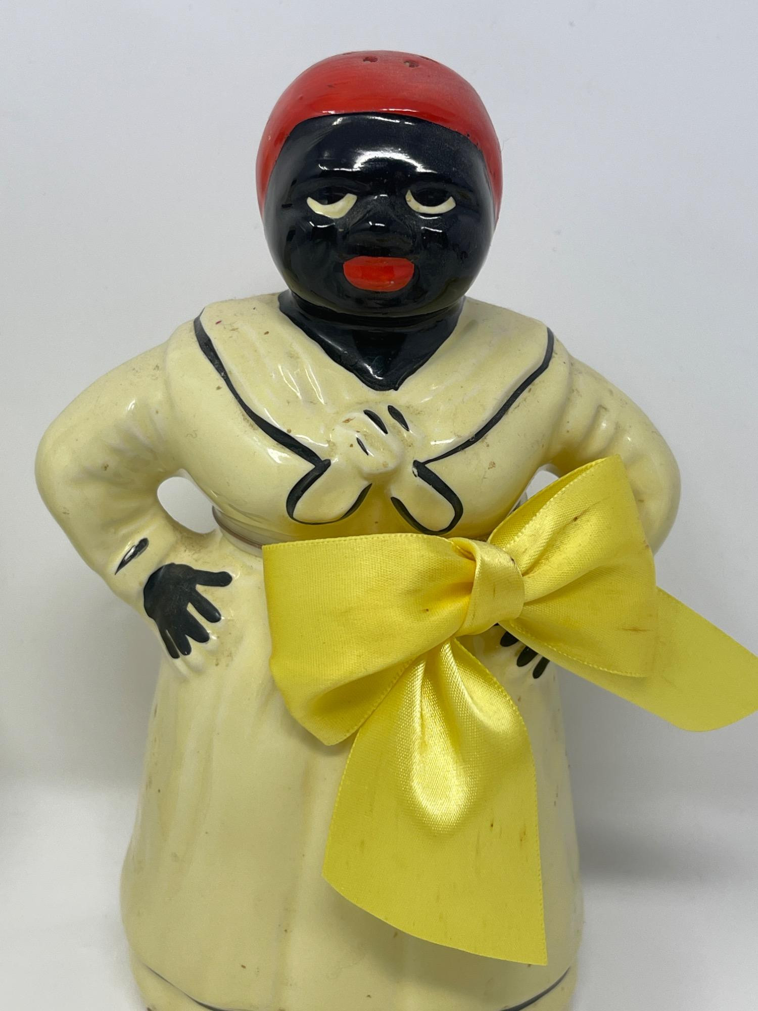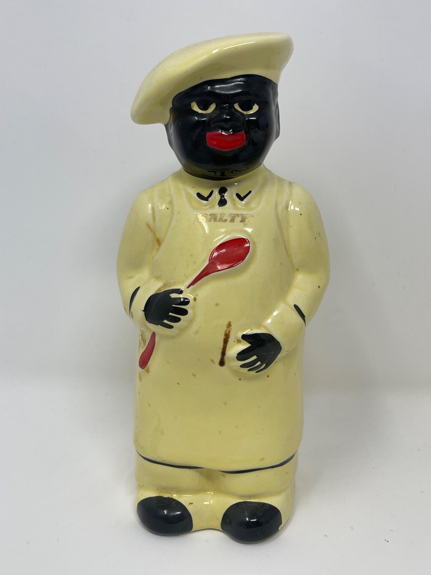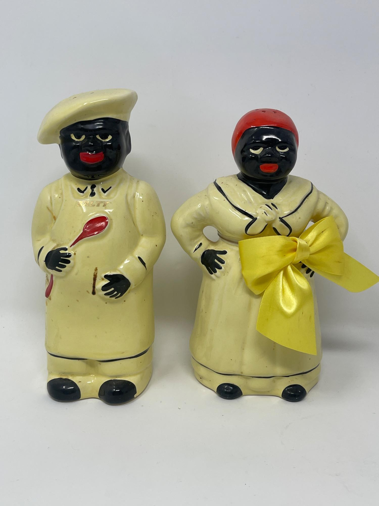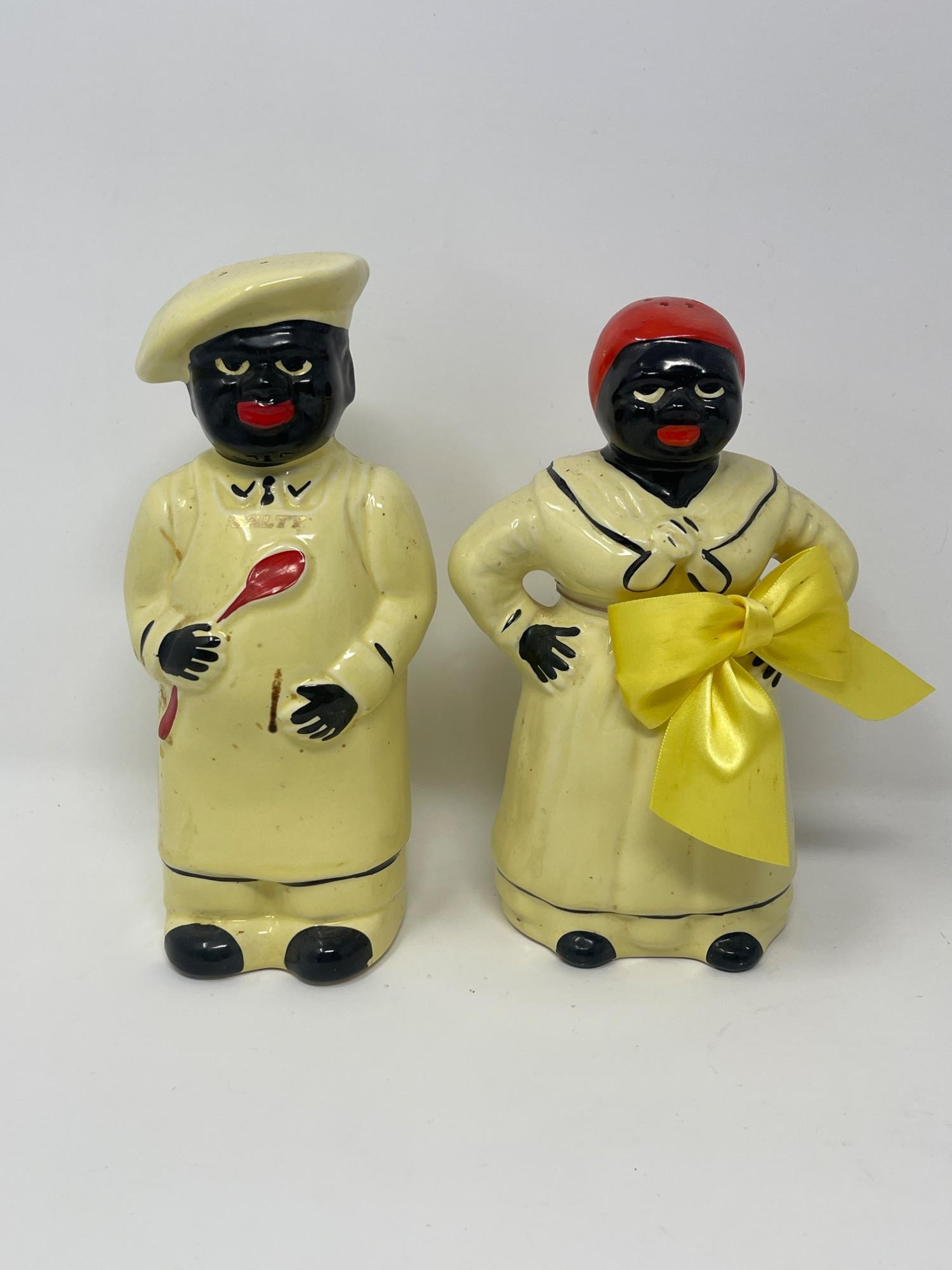 Vintage c. 1950 "Salty" & "Peppy" Black Americana Salt & Pepper Shaker Step back in time with this captivating Vintage c. 1950 'Salty and Peppy' salt and pepper shaker set, featuring African American chef figures. Each shaker stands between 7 and 7.5 inches tall. Uniquely designed with charming details and vibrant colors, reflecting the distinctive style of the era. These collectibles not only serve as functional kitchen accessories but also as pieces of Americana that offer a glimpse into the past cultural history.