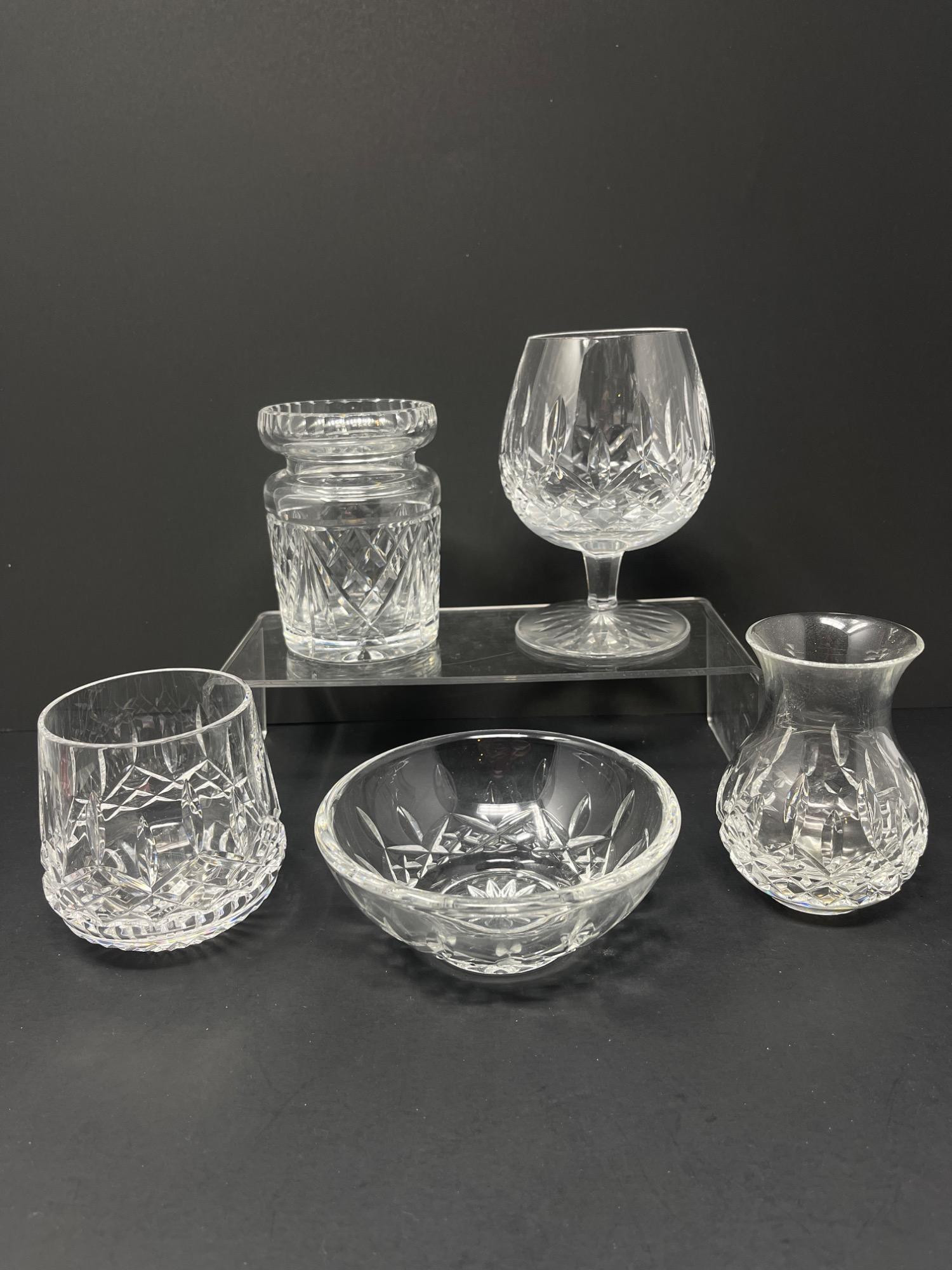 Assorted Waterford Crystal Collection: Vase, Bowl, Glass & More Elevate your dining and entertainment experience with this exquisite assortment of Waterford crystal pieces. This set includes a striking decanter, a pair of robust glasses, an alluring bowl, and an elegant small pitcher, each piece meticulously crafted with the classic Waterford cuts that catch and reflect light beautifully. Known for its exceptional quality and clarity, Waterford crystal makes any occasion feel special.