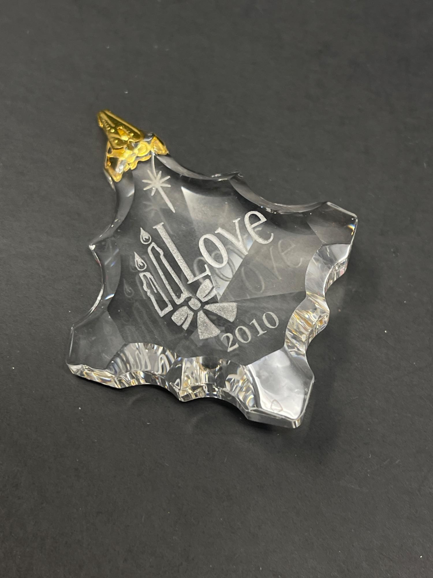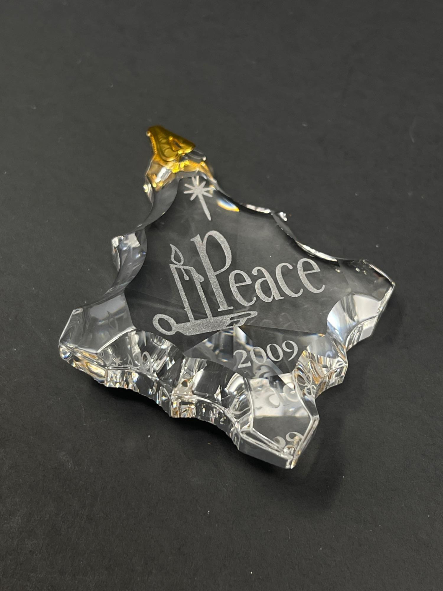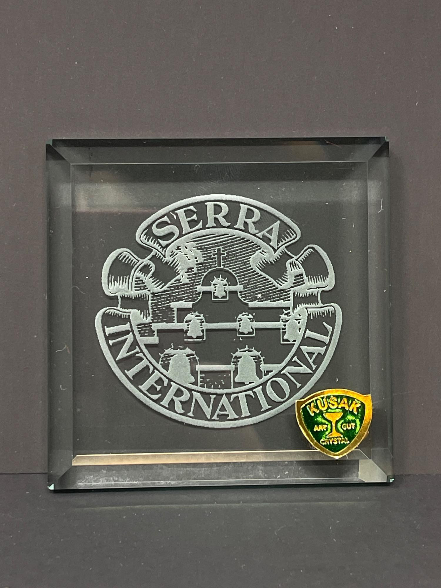 Kusak Crystal Anniversary Ornaments & Serra International Plaque Celebrate milestones with this exquisite collection from Kusak Crystal, featuring beautifully crafted anniversary ornaments for 95th, 96th, and 100th years, each engraved with words of 'Joy', 'Peace', and 'Love'. These ornaments are complemented by a finely etched Serra International plaque, detailed with the organization’s emblem, all showcased in pristine condition. Each crystal piece reflects the light with brilliance, highlighting the meticulous artistry and elegance Kusak Crystal is known for. This collection is perfect for collectors of commemorative items or as a gift to cherish the spirit of significant achievements. The accompanying Serra International plaque, also crafted by Kusak, adds a dignified touch, ideal for displaying in offices, libraries, or personal collections.