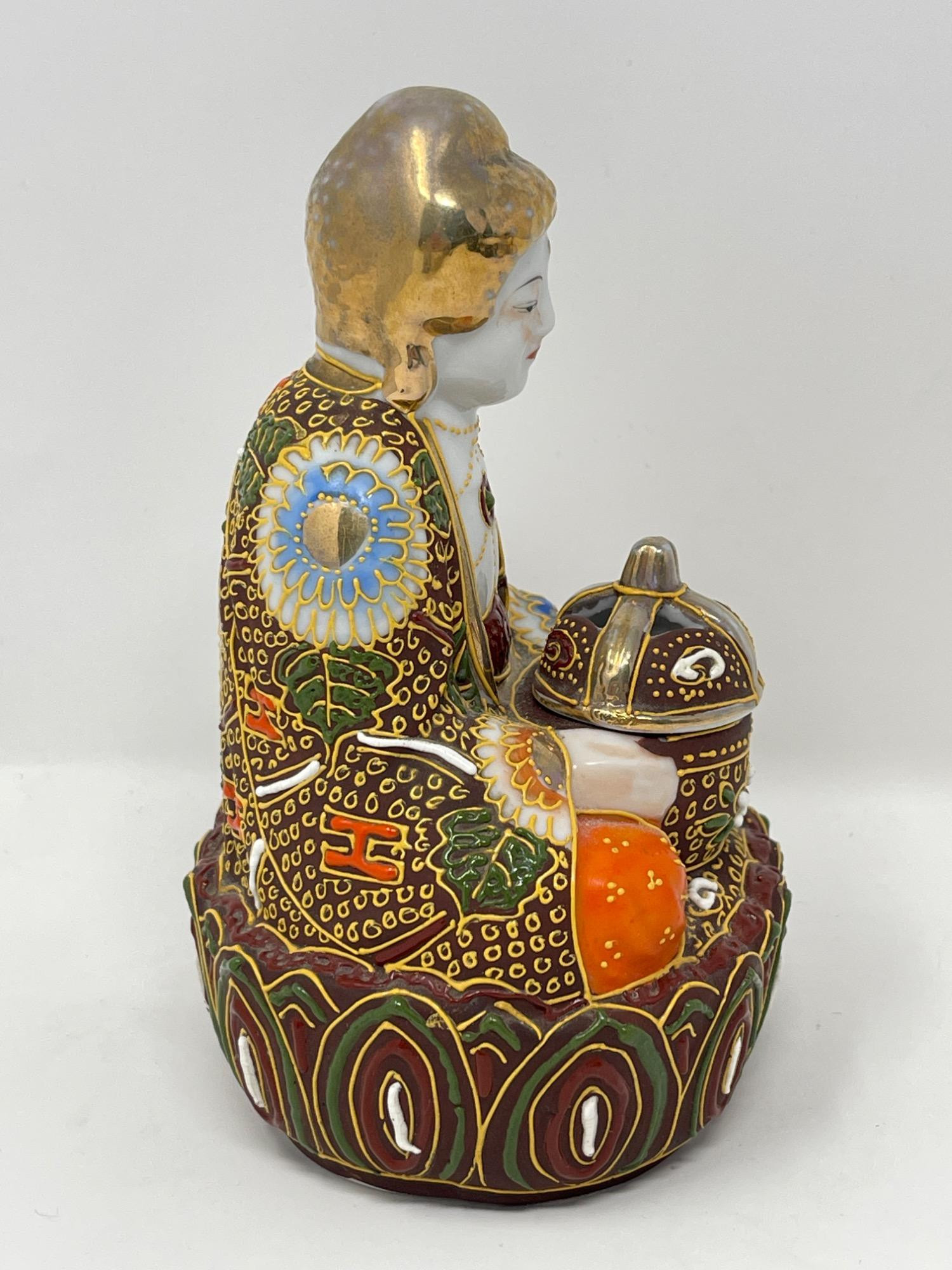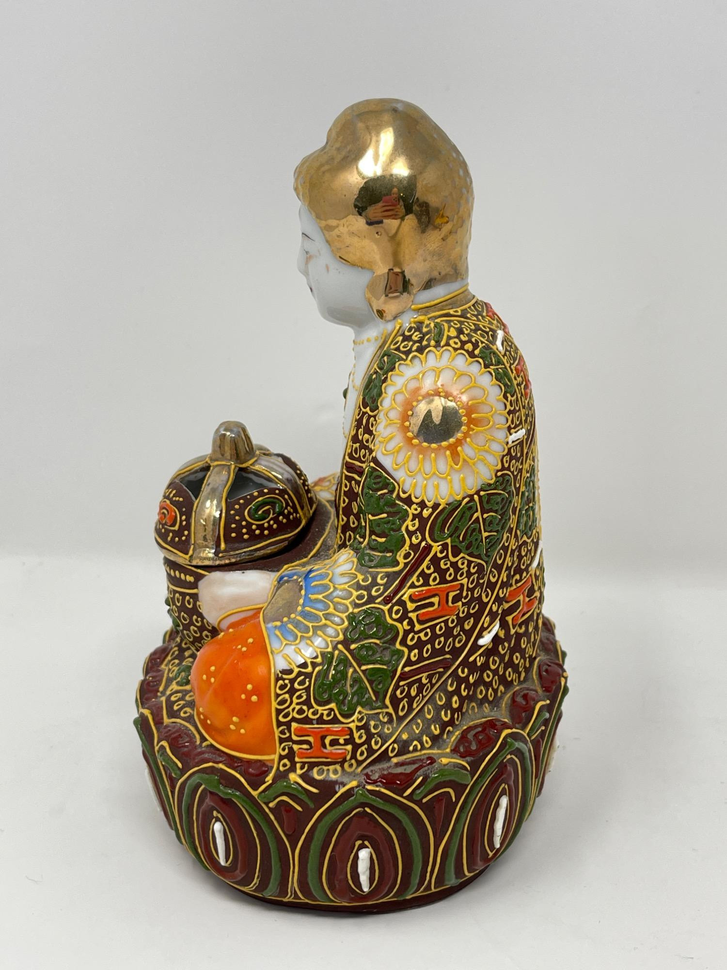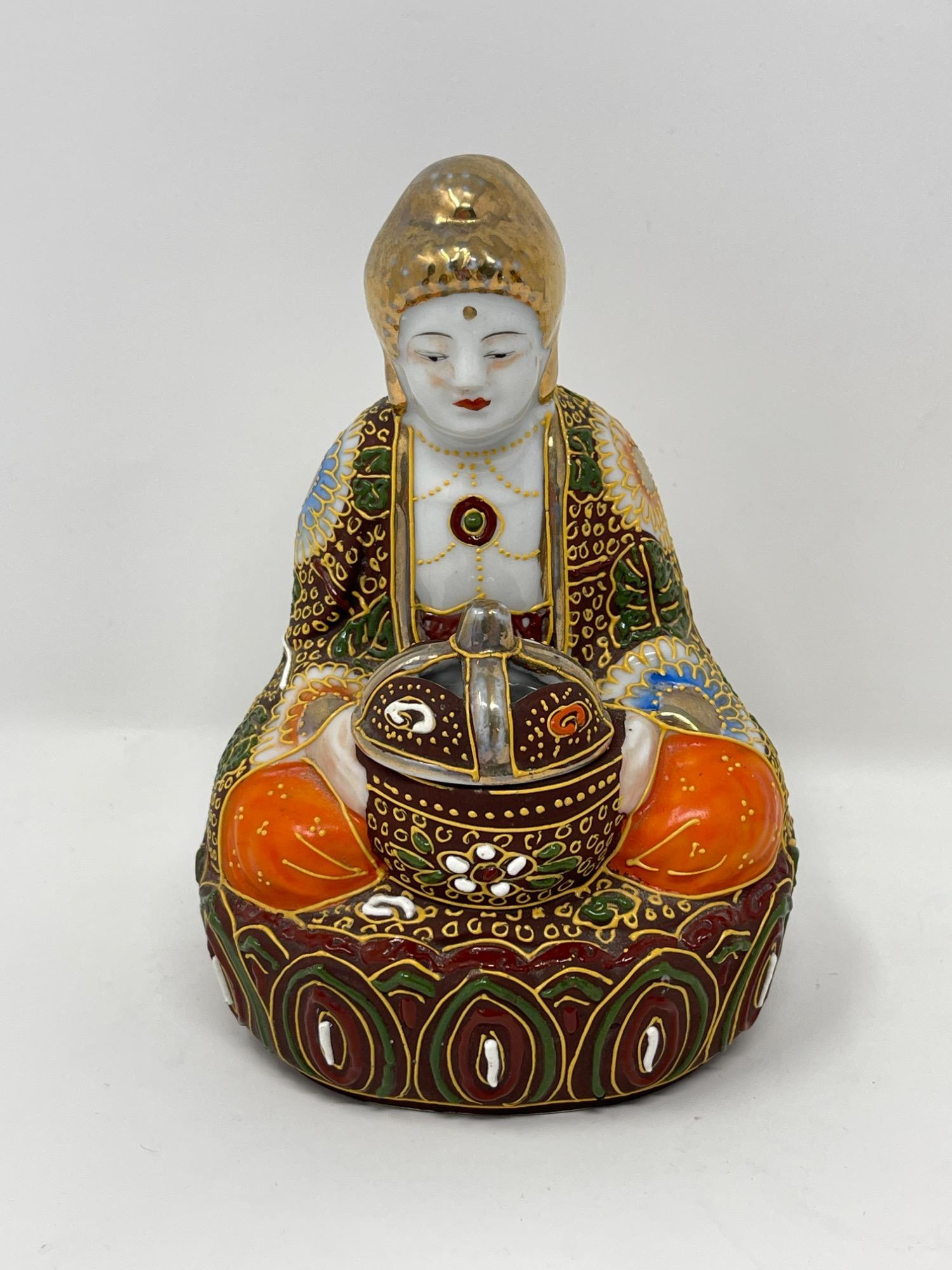 Tiger Art Panel & Hand-Painted Porcelain Buddha Incense Burner Enhance your collection with this pairing of Asian-inspired artistry, featuring a Tiger Art Panel and a Hand-Painted Porcelain Buddha Incense Burner. The art panel, measuring 9 x 15 inches, vividly captures a tiger amidst a traditional Japanese bamboo landscape, rendered in striking detail and bold colors. This piece is a stunning representation of Japanese artistic tradition and brings a dynamic element to any room. Accompanying the panel is a beautifully crafted Buddha incense burner, standing 6 inches tall. This porcelain figurine is intricately painted, displaying rich colors and ornate patterns that epitomize elegance and serenity. As a functional incense burner, it adds both aromatic and visual tranquility to your space.