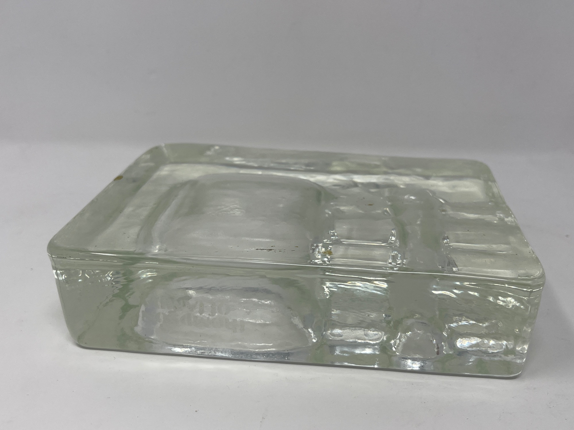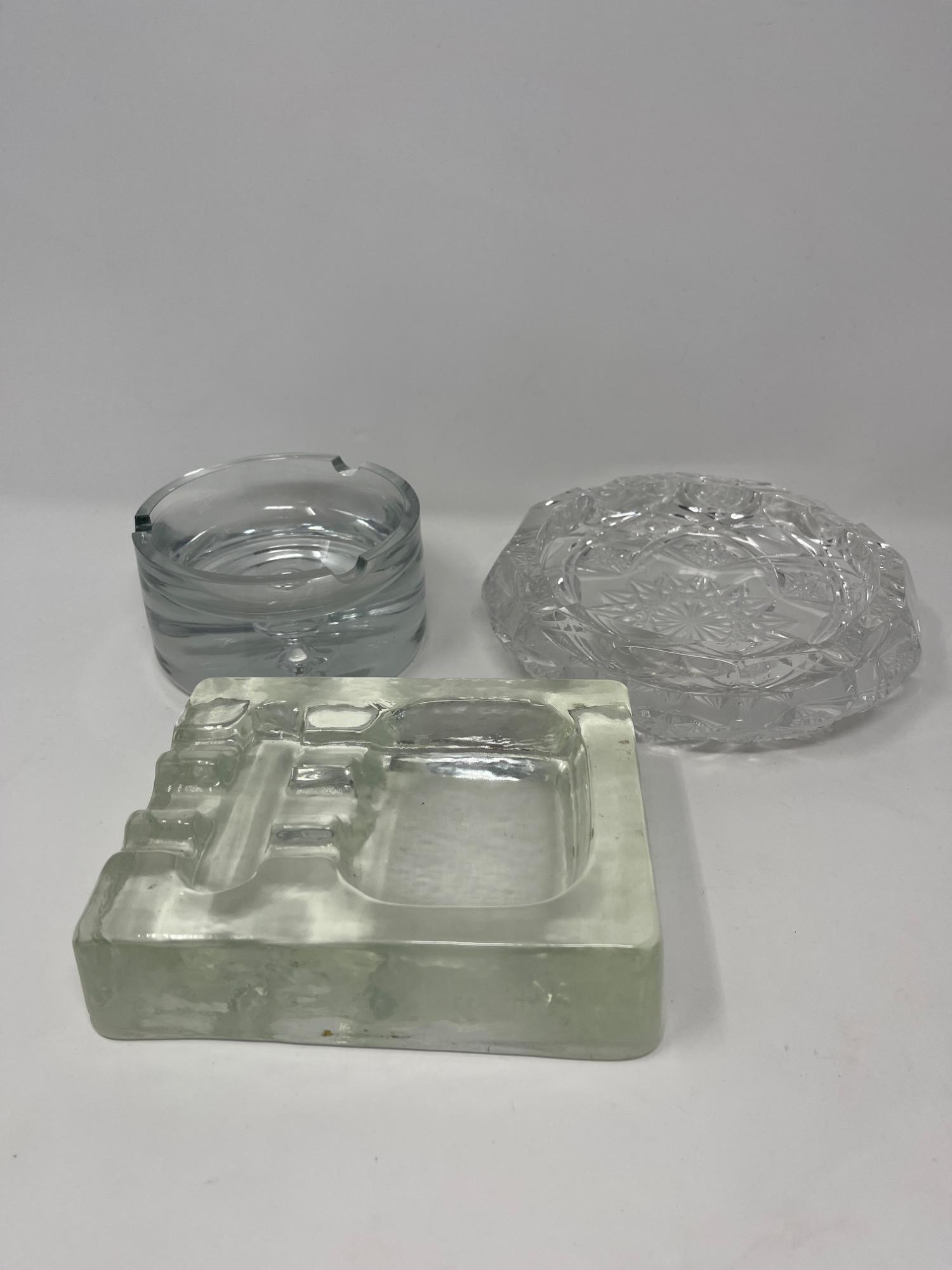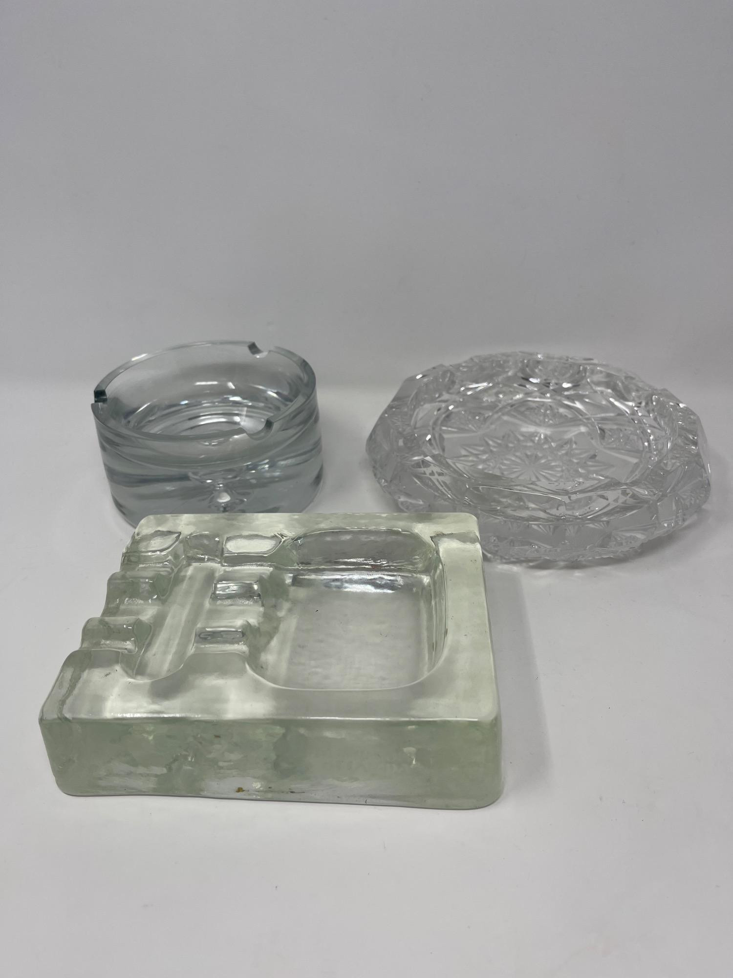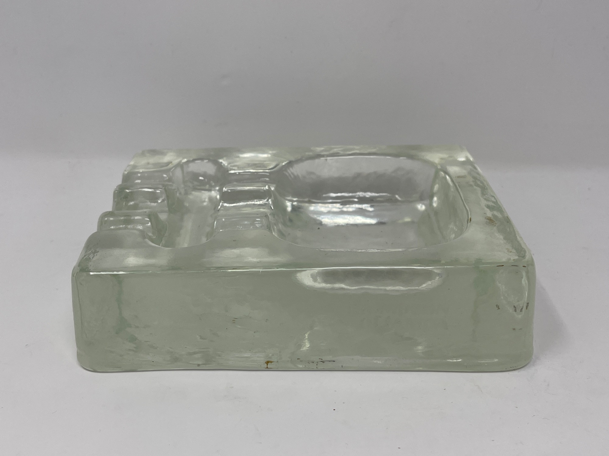 Vintage 1960s Blenko Art Glass Thompson of Tampa Ashtrays + 2 More 4.5-7.5” W Step back in time with this distinctive collection of vintage ashtrays, featuring a 1960s Blenko art glass piece known for its bold design and quality craftsmanship. This collection also includes a robust Thompson of Tampa heavy cigar ashtray, exemplifying classic mid-century style and utility. Both pieces reflect the era's aesthetic with their unique shapes and clear glass finishes. In addition, the lot includes two more traditional glass ashtrays, each showcasing intricate patterns that catch the light beautifully. Whether used for their original purpose or repurposed as decorative pieces, these ashtrays add a touch of retro flair to any setting.