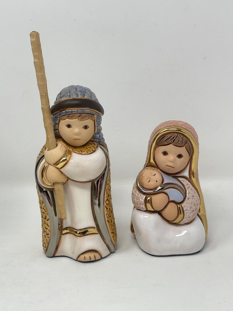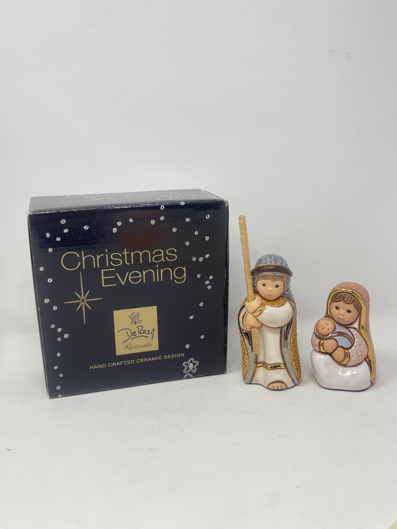 De Rosa "Christmas Evening" Mary & Joseph Figurines This is a sweet set of Mary and Joseph figurines from De Rosa Rinconada. These hand-crafted ceramic pieces are beautifully detailed and painted. Mary measures approximately 3.25 inches tall, and Joseph stands at about 4.25 inches. The set comes with its original "Christmas Evening" box. A lovely addition to your holiday decor or De Rosa collection.