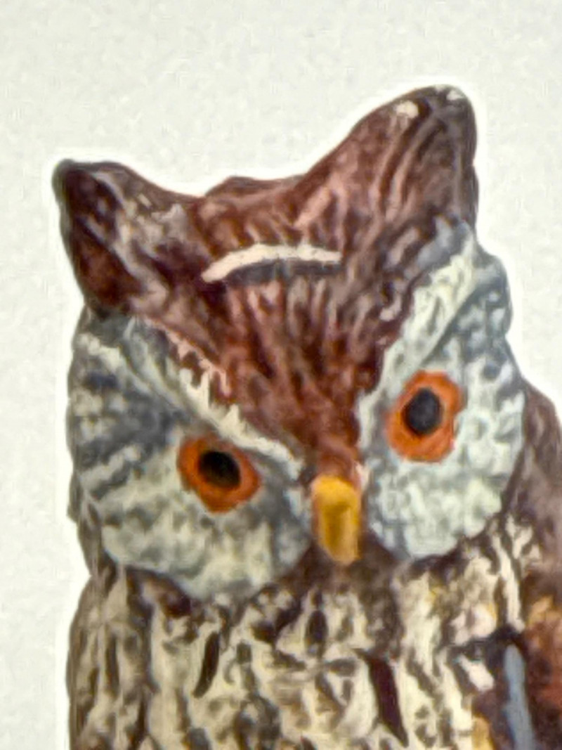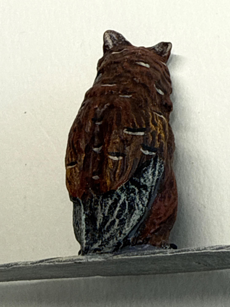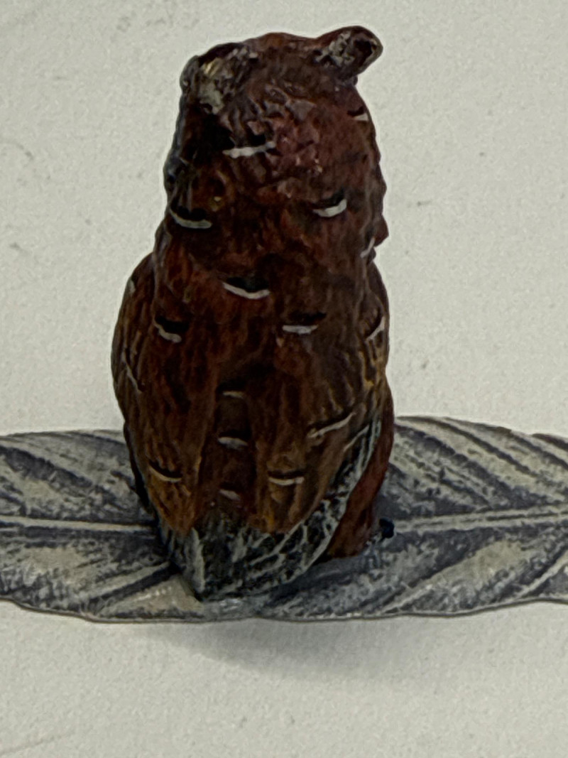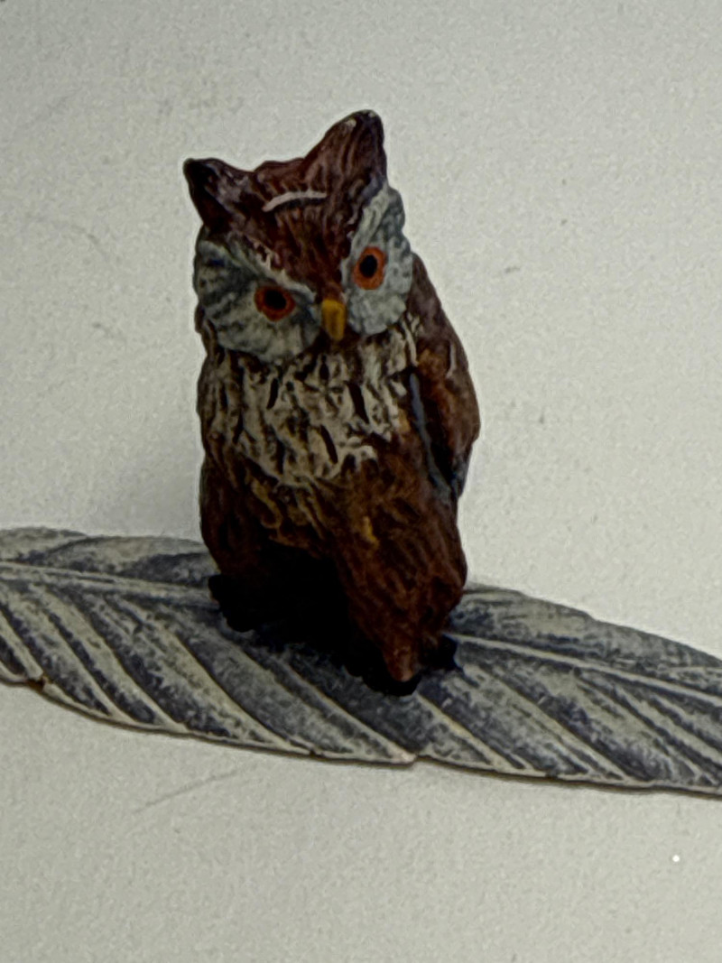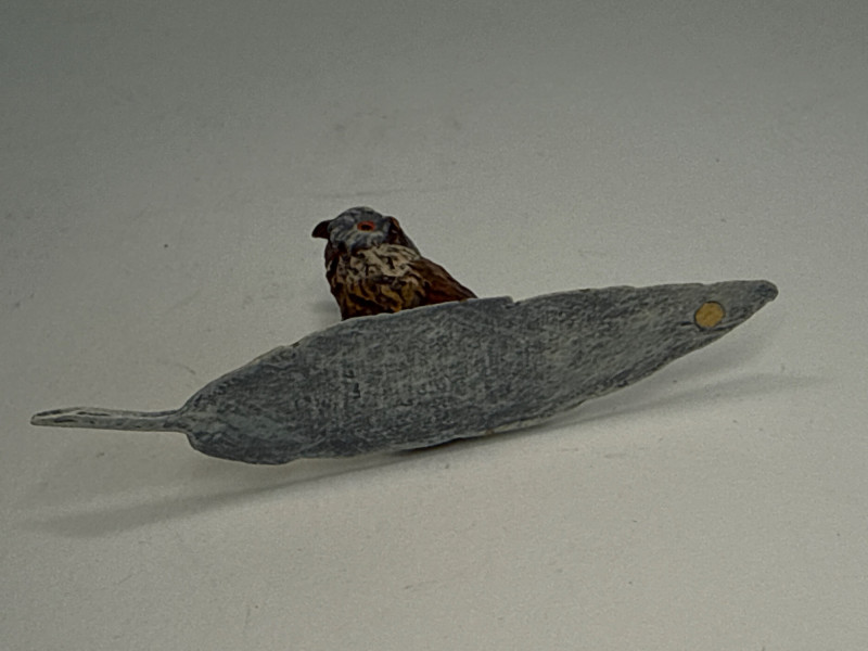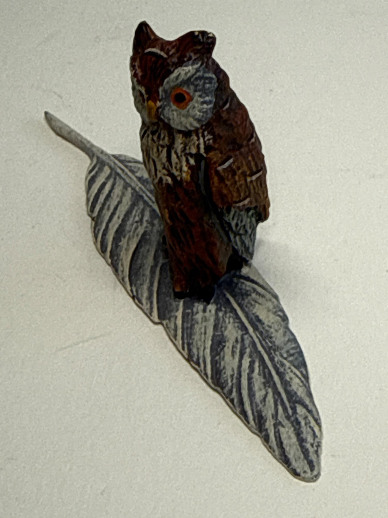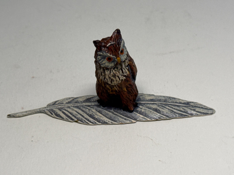 Vintage Franz Bergman Owl on Feather Sculpture "Discover the charm of this Vintage Franz Bergman sculpture, featuring an owl perched on a feather. Measuring 3.5 inches long by 1.5 inches tall, this piece captivates with its detailed design and rich, textured finish, which may be indicative of cold painted techniques often used in historic pieces. The owl's vibrant eyes and expressive posture make it a standout addition to any collection. A perfect blend of artistry and mystery, this figurine invites admiration and speculation alike.