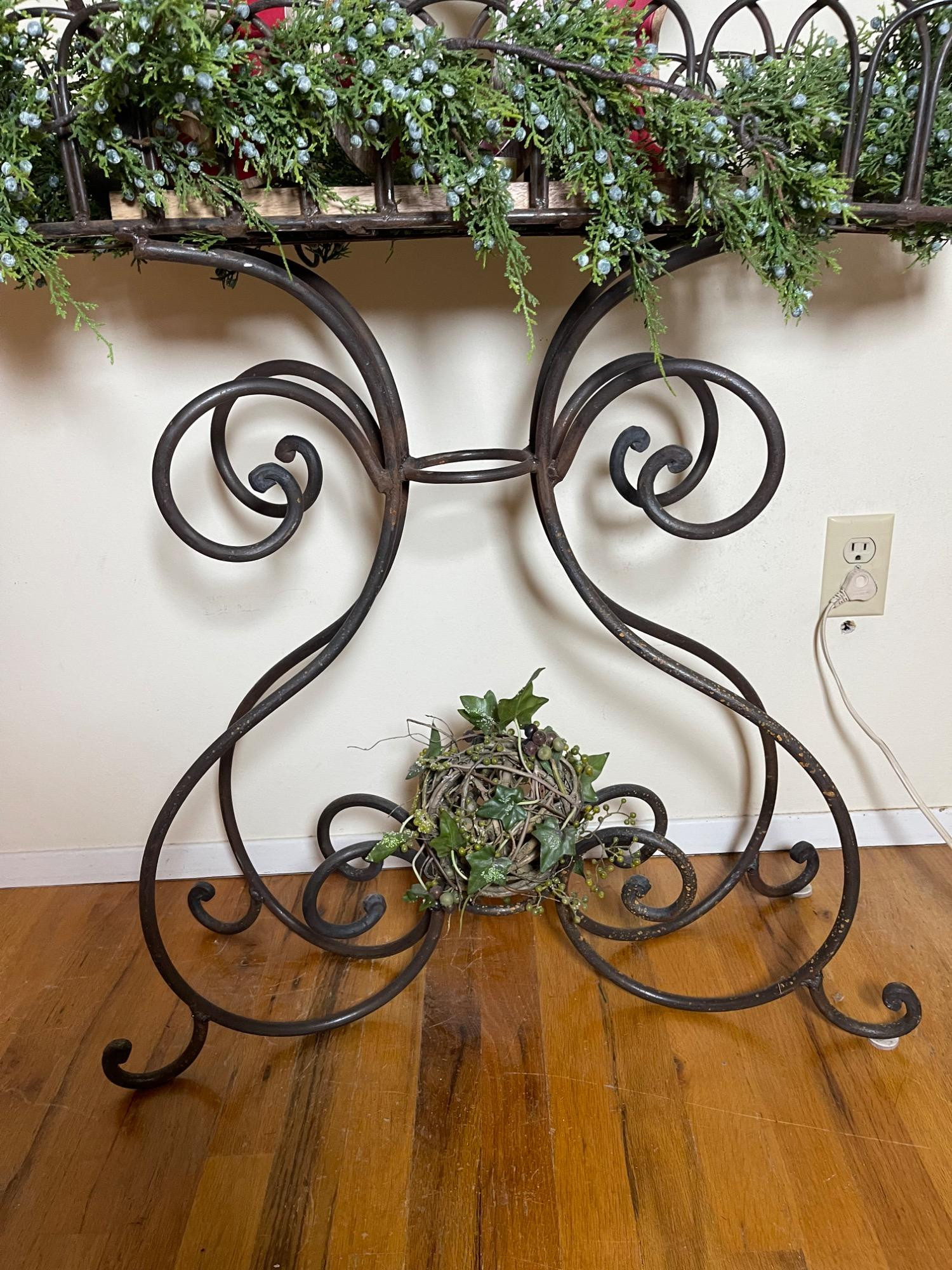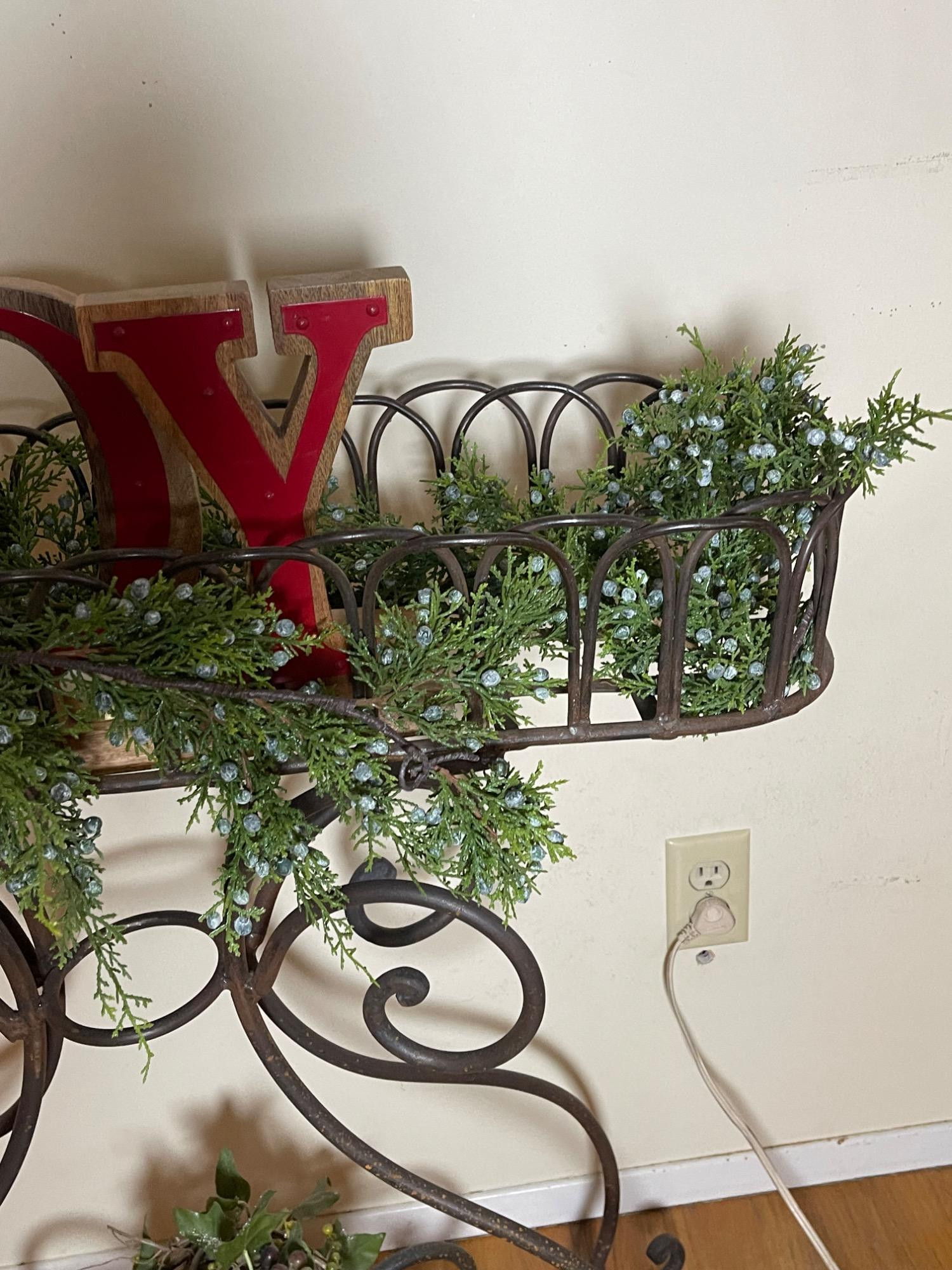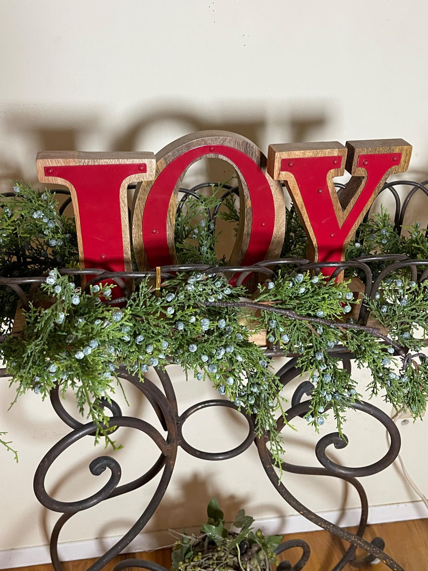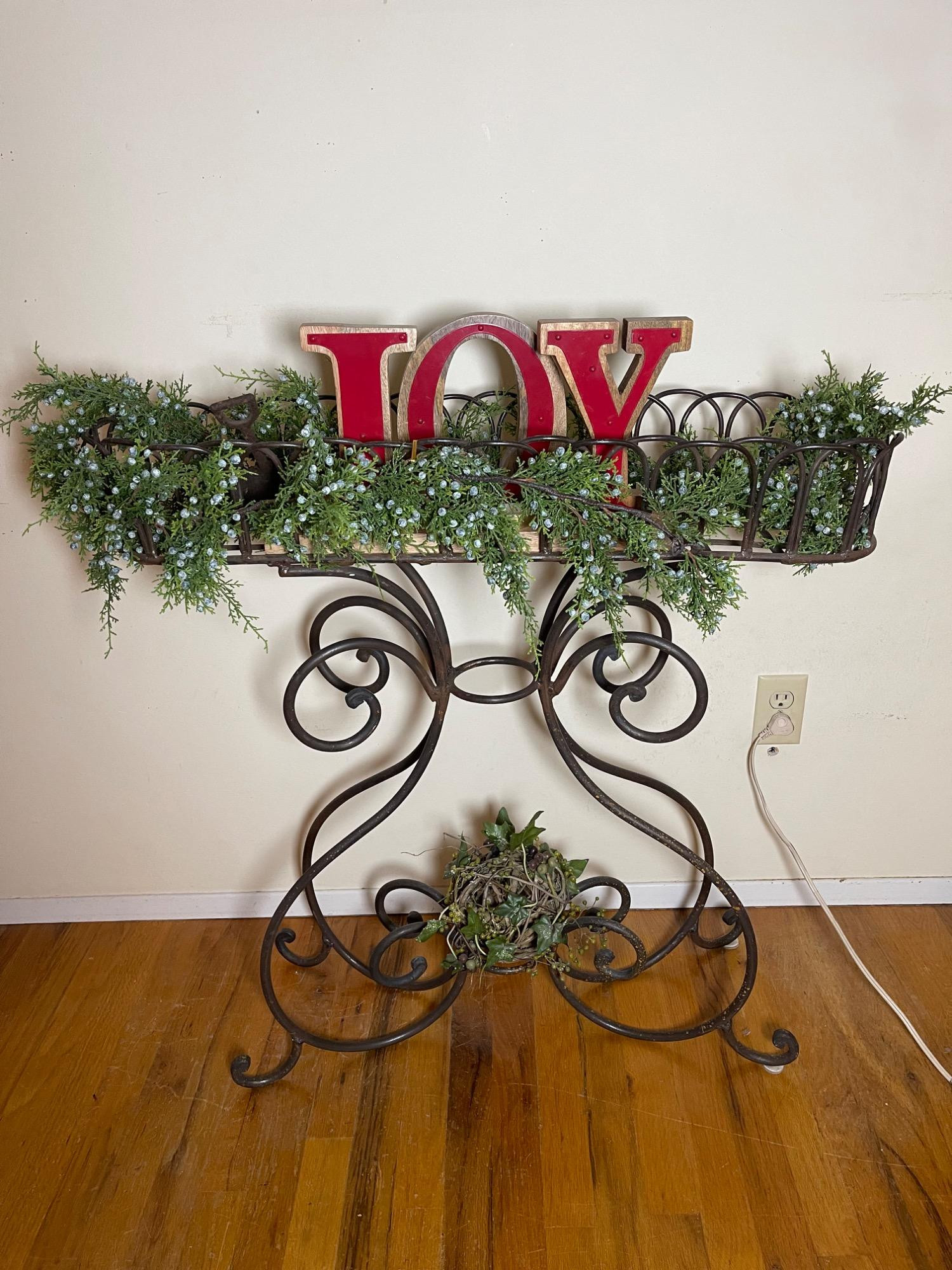 Lot # 81 - Festive "JOY" Wrought Iron Planter Stand w/ Seasonal Decorations