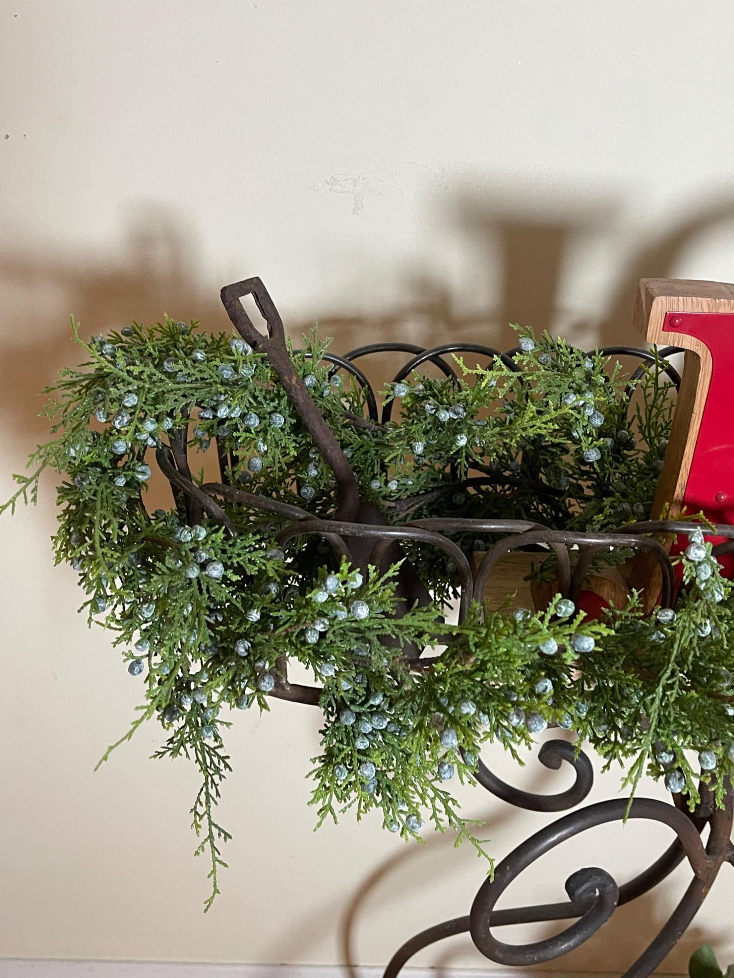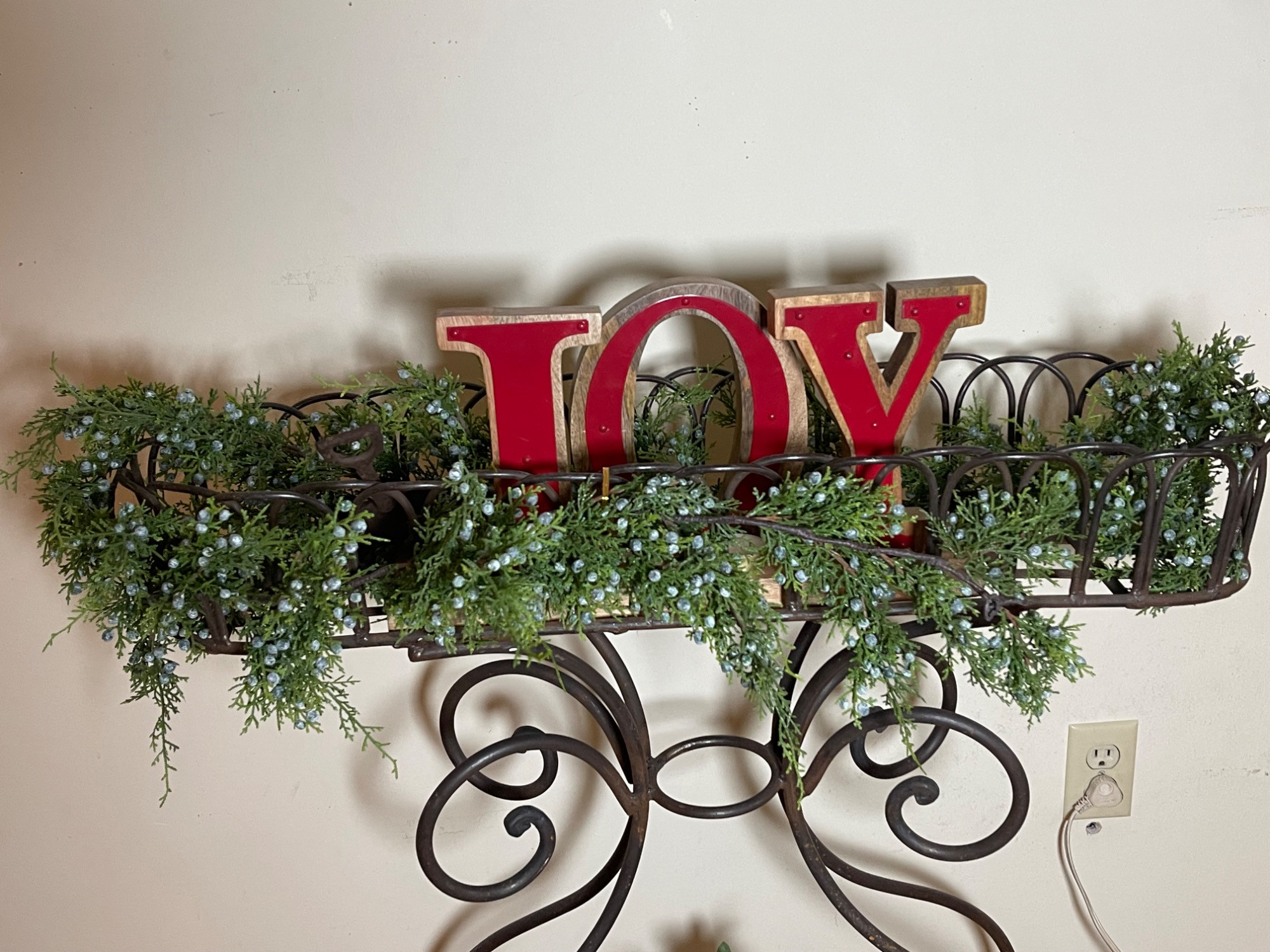 Festive "JOY" Wrought Iron Planter Stand w/ Seasonal Decorations Elevate your holiday decor with this exquisite wrought iron planter stand, artfully adorned with a vibrant "JOY" sign and lush seasonal greenery. The elegant scrolls of the stand provide a classic touch, while the bright red and green embellishments capture the spirit of the season. Perfect for adding a warm, festive touch to any space, this piece blends timeless design with cheerful holiday charm.