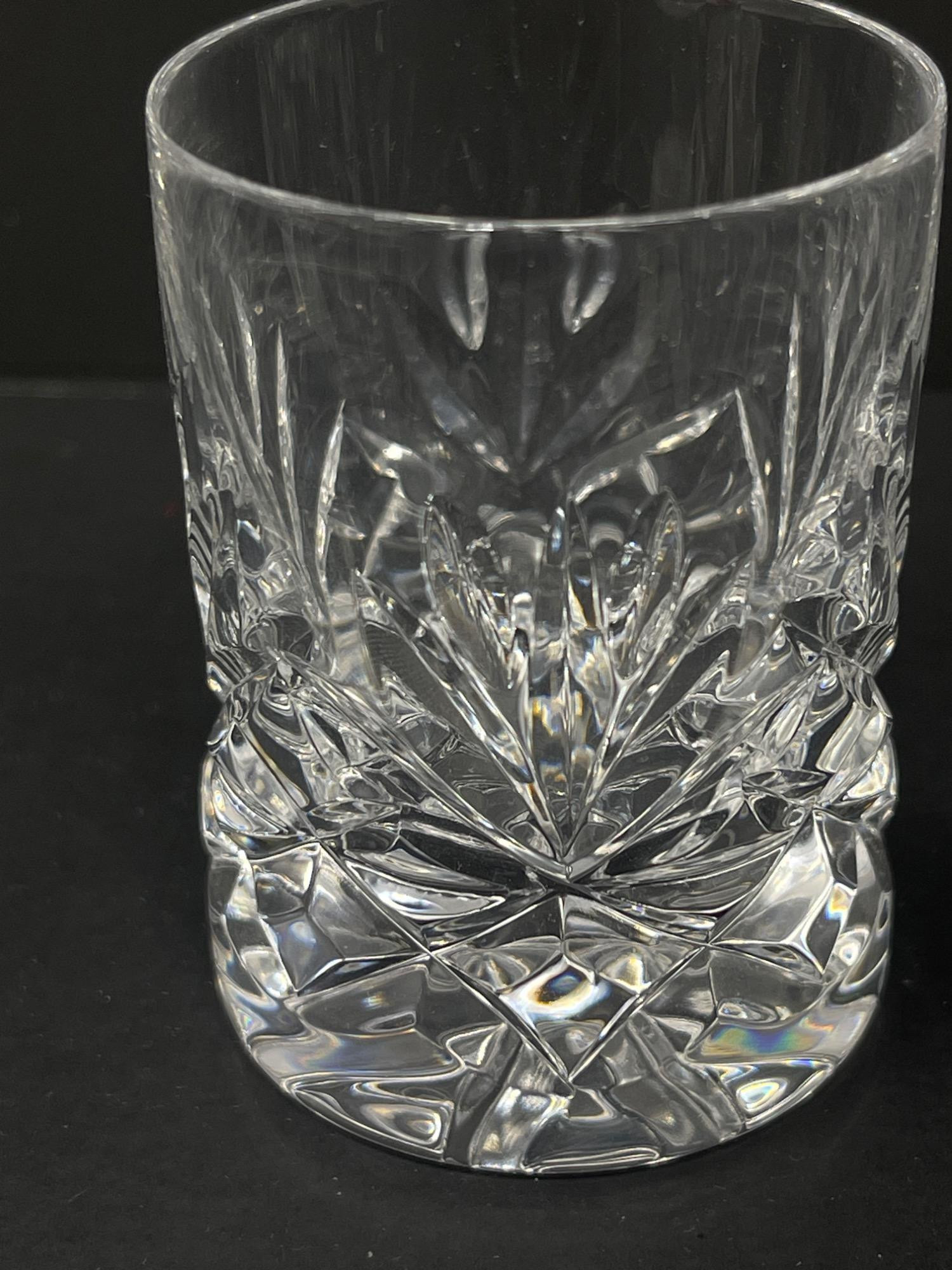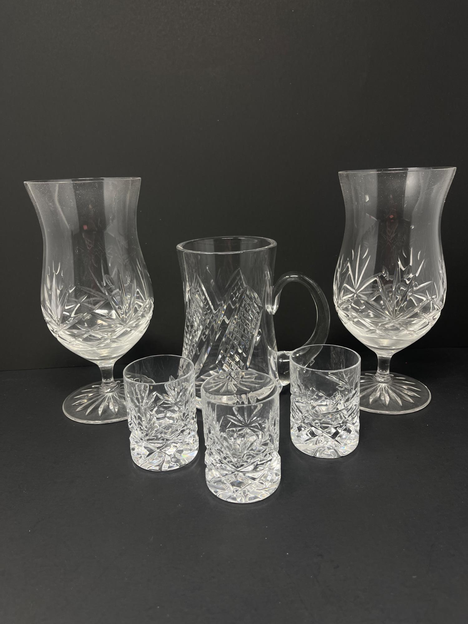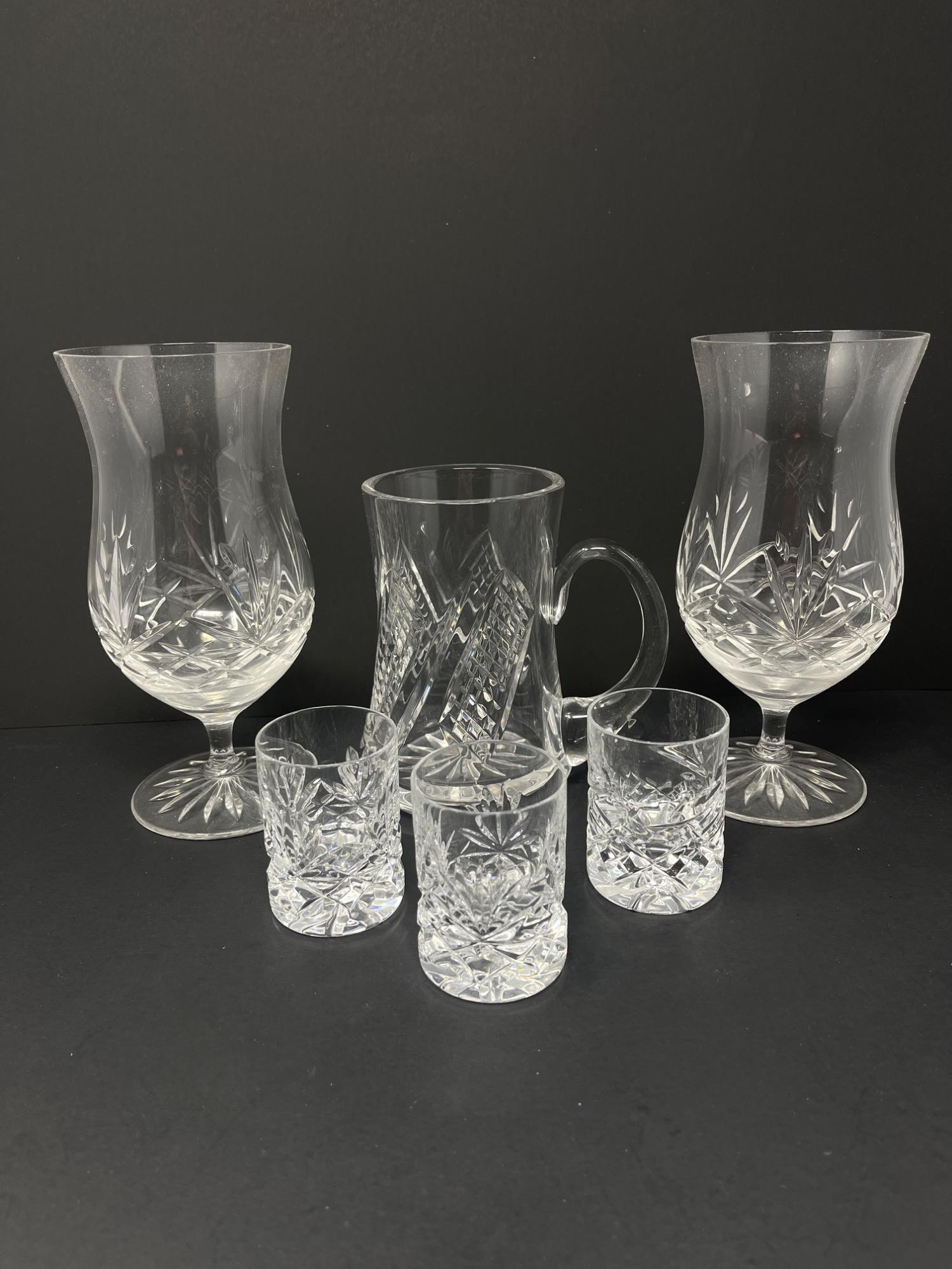 Cash's Crystal Glassware Collection w/ Mug, Stems, & Glasses + 2.75-7.5” H Elevate your home bar or dining collection with this exquisite set of Cash's Crystal glassware. This set showcases the pristine clarity and intricate detailing that Cash's is renowned for. It includes a versatile mug, perfect for serving refreshing beverages, two elegant footed juice stems, three sturdy whiskey glasses for savoring spirits, and a unique small crystal piece looking like a wine/perfume stopper. Each piece reflects light beautifully, making every occasion feel special.