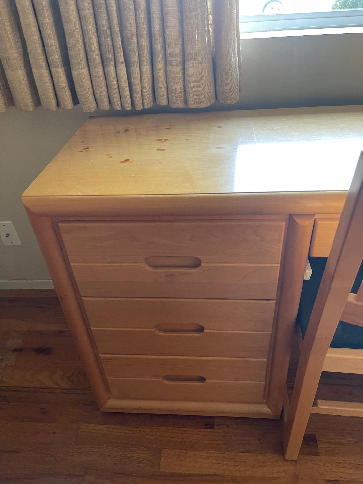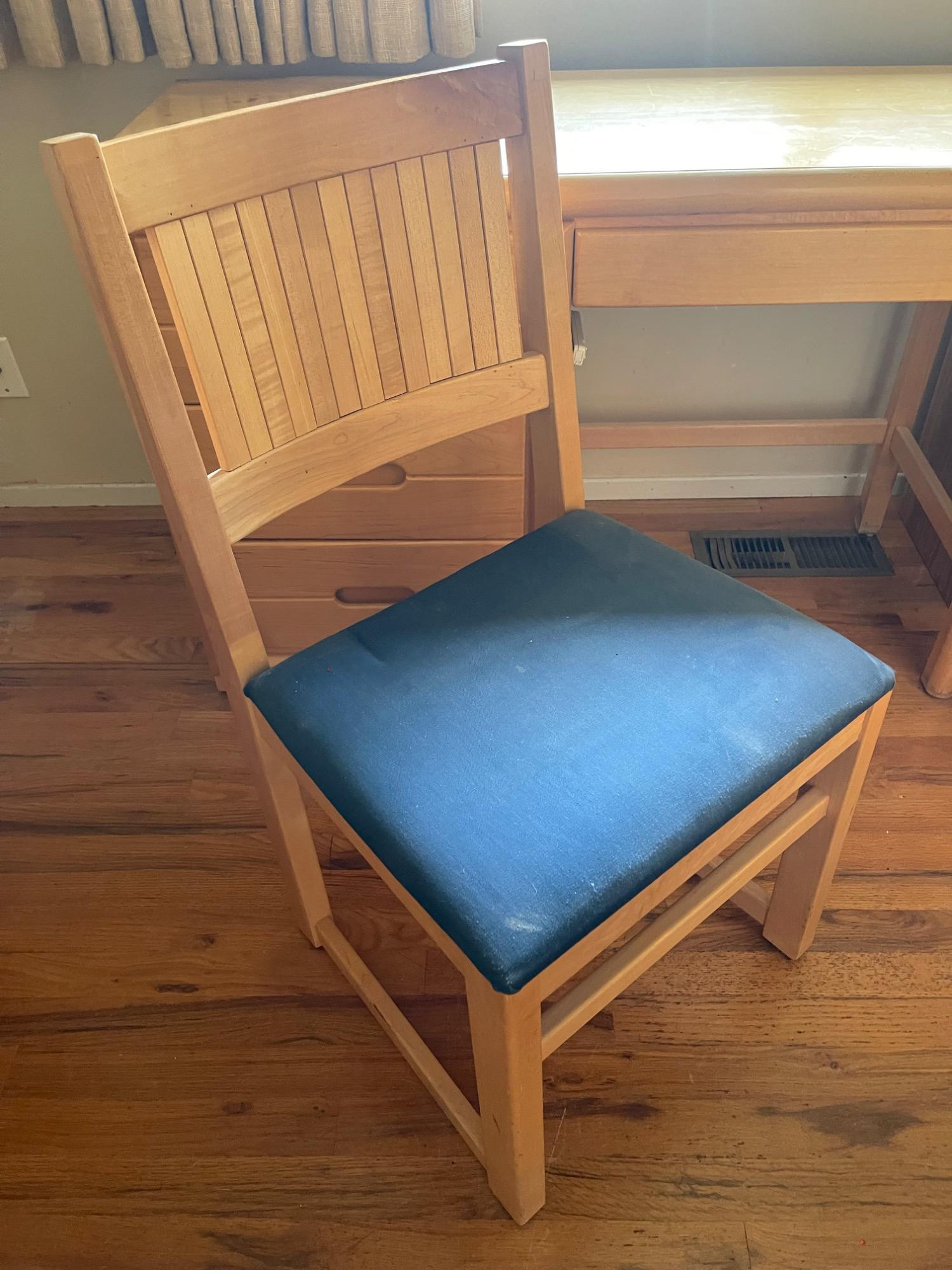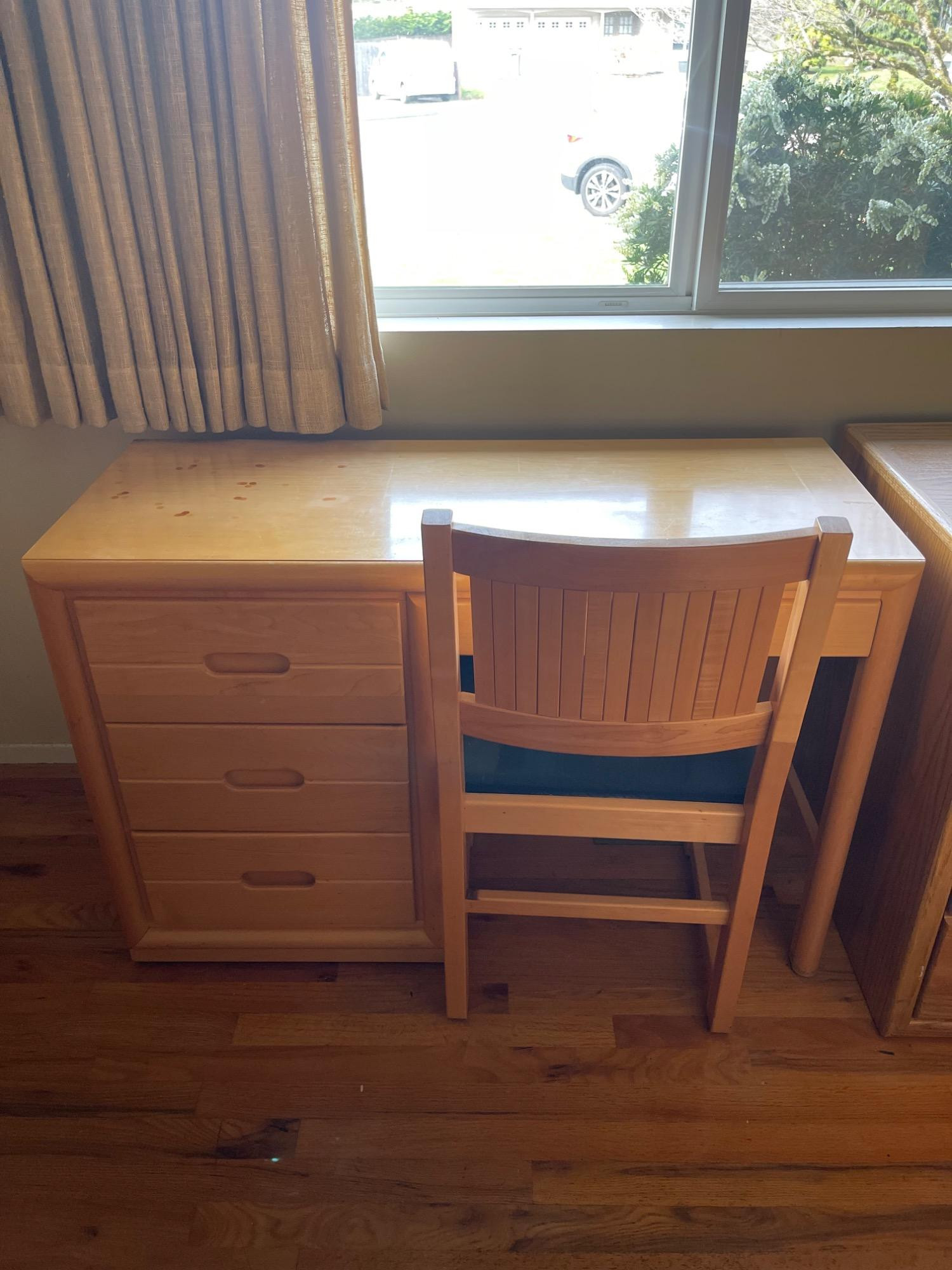 Classic Wooden Desk and Chair Set w/ Multiple Drawers Enhance your workspace with this classic wooden desk and chair set, designed for both functionality and aesthetic appeal. The desk features a broad top, perfect for various activities from writing to computer work, complemented by four smoothly operating drawers that offer substantial storage space for all your office essentials. The warm, light wood finish adds a touch of natural charm to any setting, whether it's a study or a home office. Paired with a matching chair, which boasts a comfortable blue upholstered seat and a sturdy backrest, this set promises comfort and style during extended work sessions. Condition: Multiple scratches, scuffs and stains to both chair and desk. Please see photos. Bidding on this lot is an agreement that: (1.) You will have at least 2 capable, able-bodied persons to lift and load at a minimum. (2.) You will bring a hand truck and/or any other tools needed to remove this item. If these steps are not followed your item will be forfeited and no refund given.