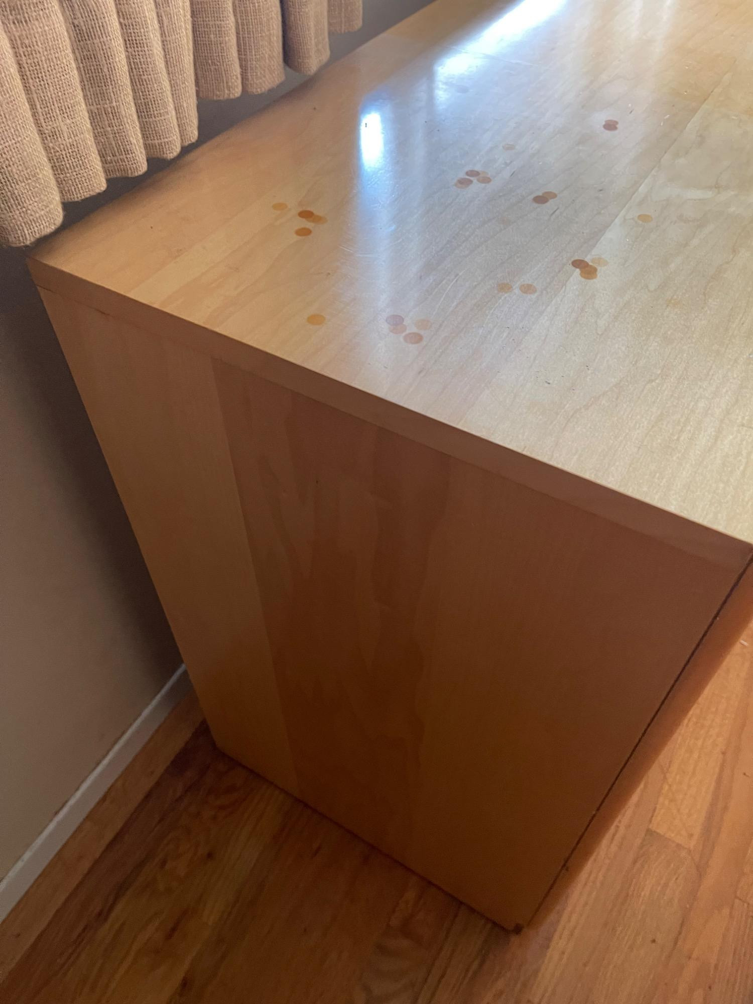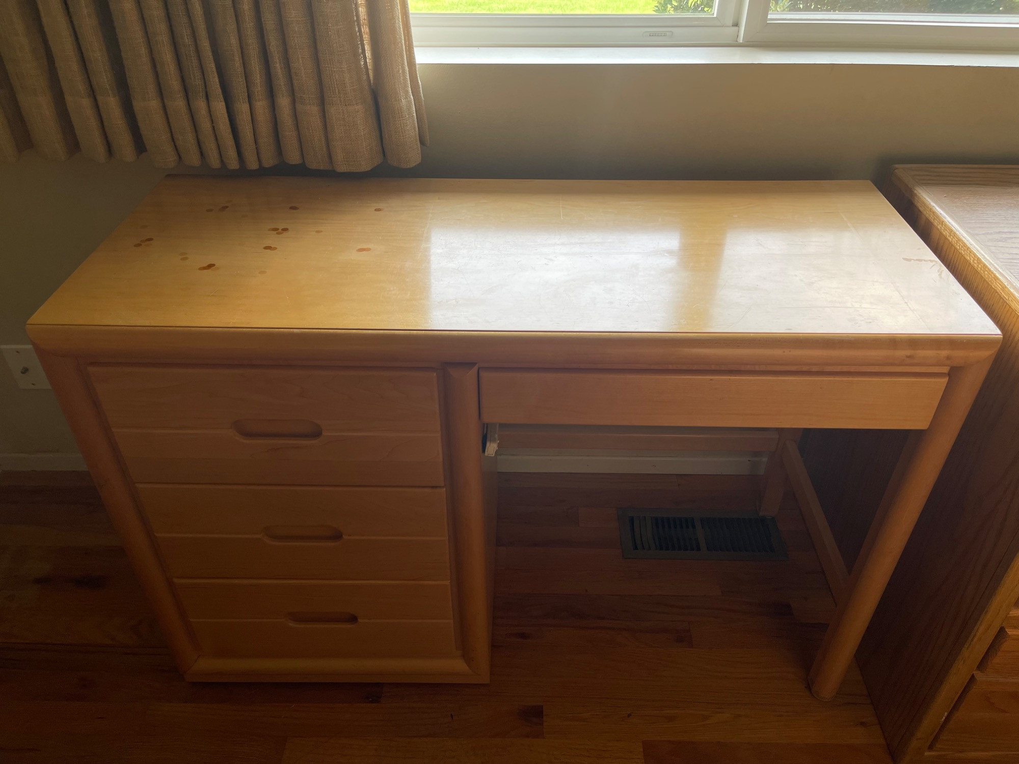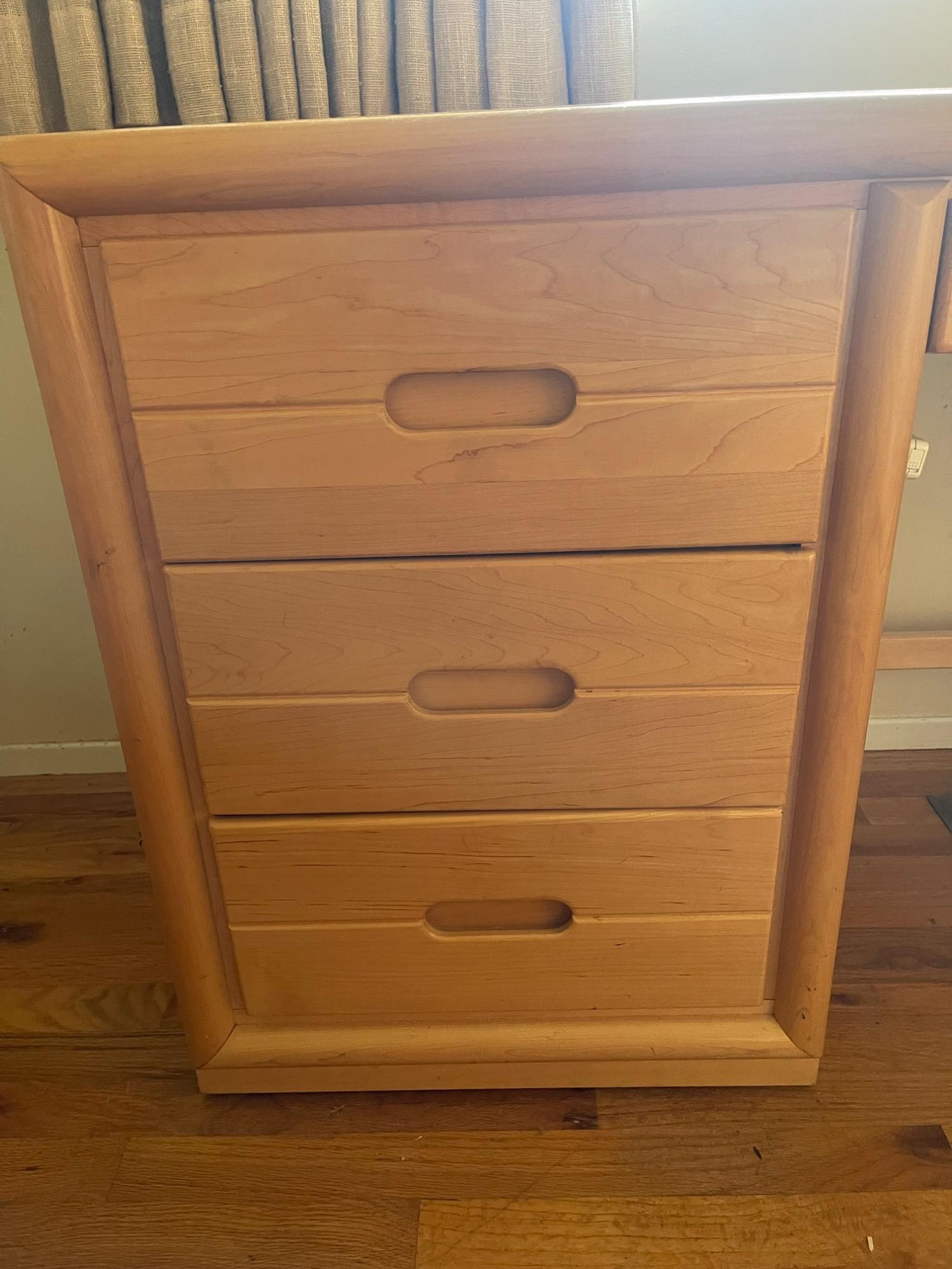Classic Wooden Desk and Chair Set w/ Multiple Drawers Enhance your workspace with this classic wooden desk and chair set, designed for both functionality and aesthetic appeal. The desk features a broad top, perfect for various activities from writing to computer work, complemented by four smoothly operating drawers that offer substantial storage space for all your office essentials. The warm, light wood finish adds a touch of natural charm to any setting, whether it's a study or a home office. Paired with a matching chair, which boasts a comfortable blue upholstered seat and a sturdy backrest, this set promises comfort and style during extended work sessions. Condition: Multiple scratches, scuffs and stains to both chair and desk. Please see photos. Bidding on this lot is an agreement that: (1.) You will have at least 2 capable, able-bodied persons to lift and load at a minimum. (2.) You will bring a hand truck and/or any other tools needed to remove this item. If these steps are not followed your item will be forfeited and no refund given.
