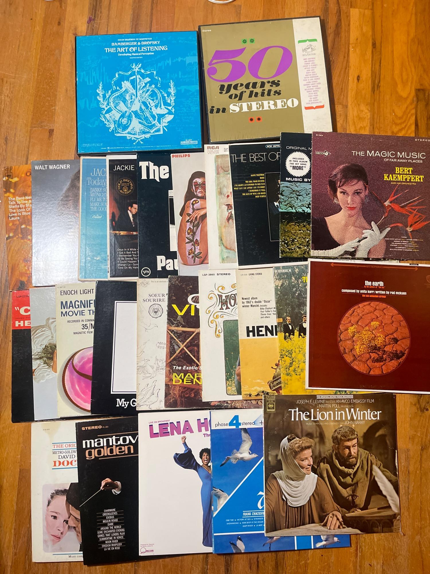 Eclectic Collection of Vintage Vinyl Records Dive into the rich sounds of the past with this eclectic collection of vintage vinyl records, spanning various genres and eras. Each album in this selection represents a unique piece of music history, from classical and movie soundtracks to jazz and popular hits. Highlights include "The Art of Listening," "50 Years of Hits in Stereo," and "The Magic Music of Bert Kaempfert." This collection also features rare finds like "The Lion in Winter" soundtrack and several collectors' edition albums, making it a treasure trove for enthusiasts and collectors alike.