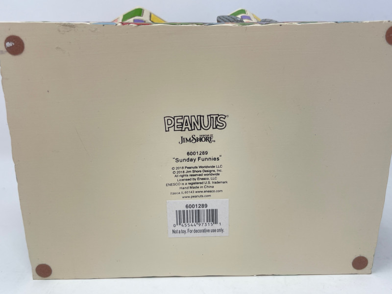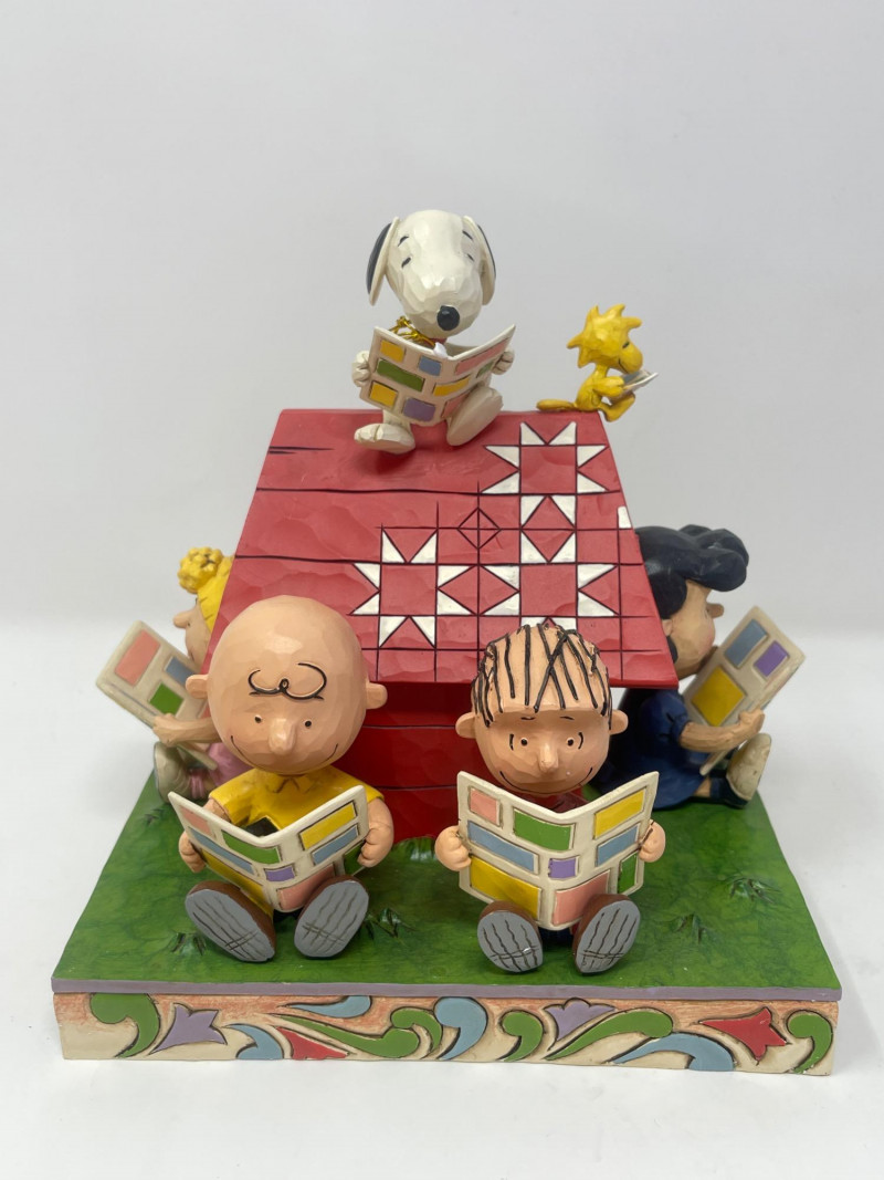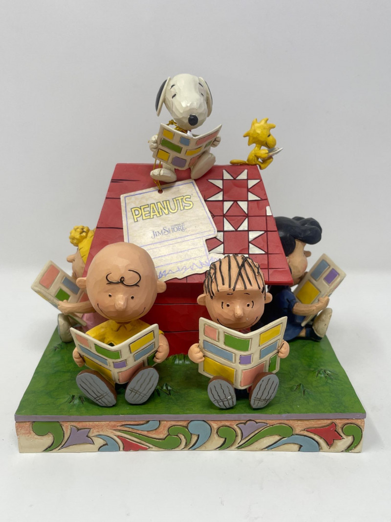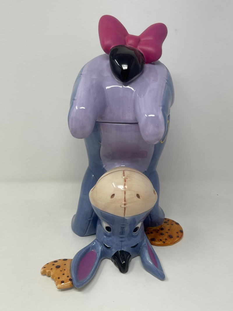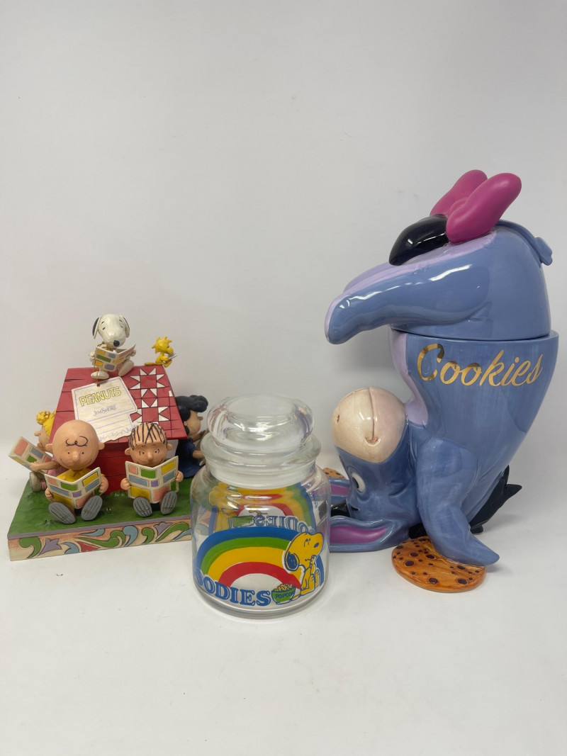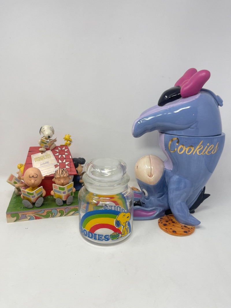 Enchanting Collectibles Set Featuring Peanuts & Disney Characters Immerse yourself in the whimsical world of nostalgia with this charming collection of collectibles, spotlighting cherished characters from Peanuts and Disney. This delightful set includes Jim Shore's 'Sunday Funnies' Figurine: A vividly painted, Peanuts-themed piece showcasing beloved characters, rendered with Jim Shore's signature attention to detail. Standing 7 inches tall, this figurine comes complete with its original box and mold, making it a prized collectible for any fan. Eeyore Cookie Jar from The Bradford Exchange: This endearing cookie jar features Eeyore in an adorable upside-down pose, combining the whimsy of Disney's character with functional design. At 12 inches tall, it includes a Certificate of Authenticity, marking it as a limited edition item. Snoopy 'Goodies' Jar: Standing 5.5 inches tall, this jar is perfect for storing treats or small keepsakes. Adorned with a bright and colorful rainbow and the iconic Snoopy, it brings joy and a touch of nostalgia to any space. Details: Jim Shore Peanuts Figurine: Licensed by Enesco, meticulously crafted, intended for decorative use only. Eeyore Cookie Jar: Handcrafted with care instructions to ensure longevity; not suitable for microwave or dishwasher use. Snoopy 'Goodies' Jar: Features the artwork of Charles Schulz, adding authenticity and charm. Dimensions: Eeyore Cookie Jar: 12 inches in height. Jim Shore Peanuts Figurine: 7 inches in height. Snoopy 'Goodies' Jar: 5.5 inches in height.
