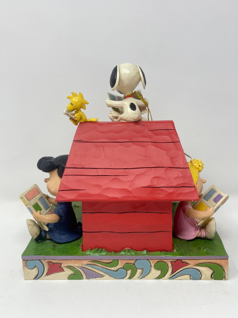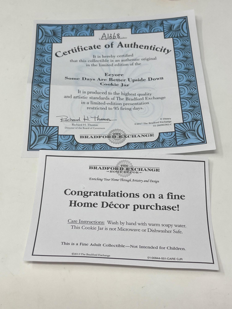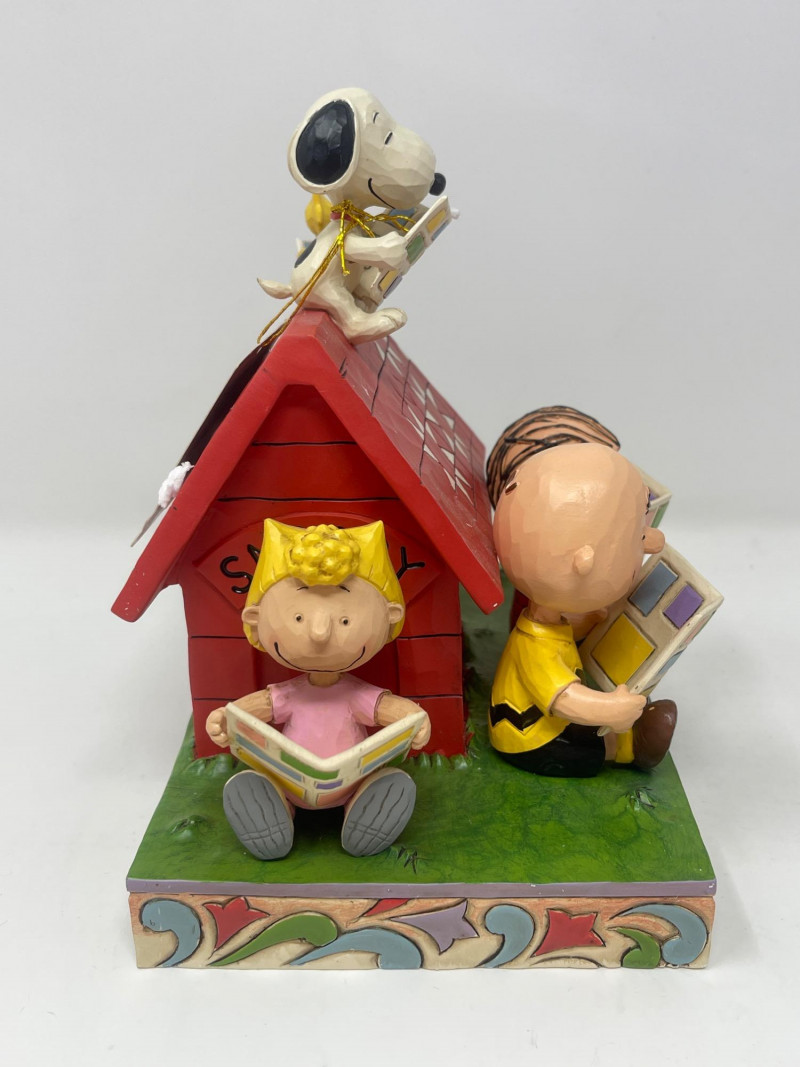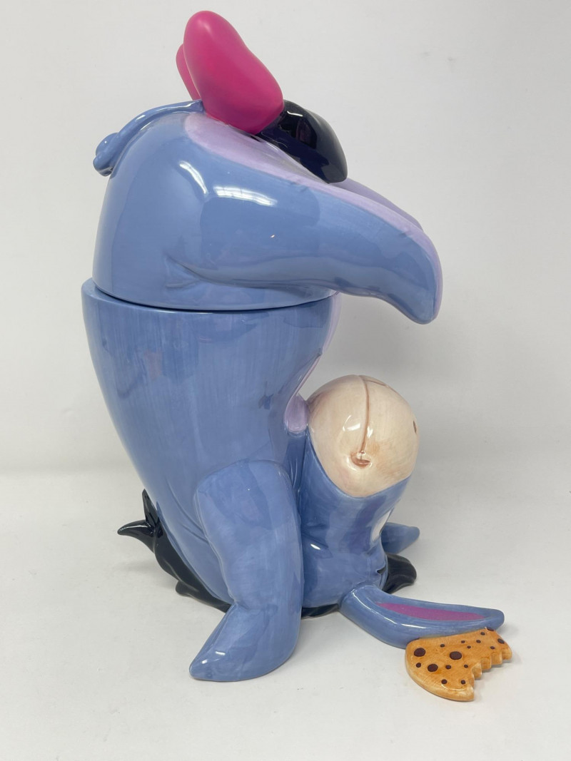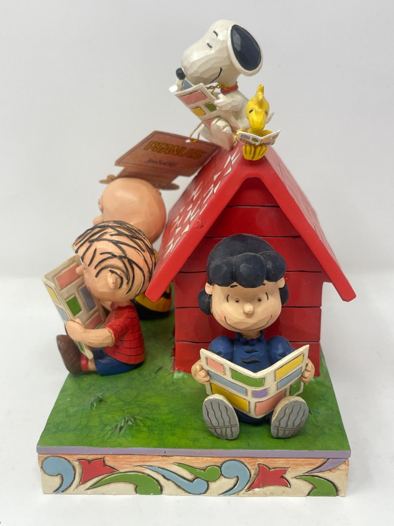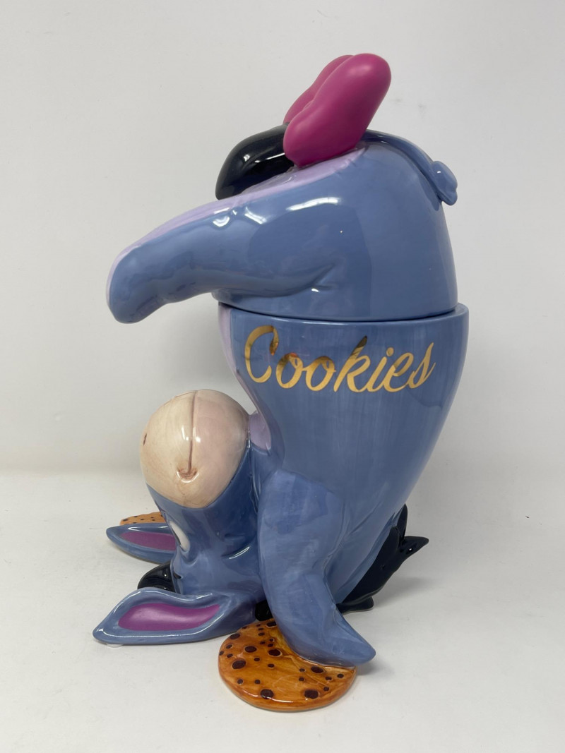 Enchanting Collectibles Set Featuring Peanuts & Disney Characters Immerse yourself in the whimsical world of nostalgia with this charming collection of collectibles, spotlighting cherished characters from Peanuts and Disney. This delightful set includes Jim Shore's 'Sunday Funnies' Figurine: A vividly painted, Peanuts-themed piece showcasing beloved characters, rendered with Jim Shore's signature attention to detail. Standing 7 inches tall, this figurine comes complete with its original box and mold, making it a prized collectible for any fan. Eeyore Cookie Jar from The Bradford Exchange: This endearing cookie jar features Eeyore in an adorable upside-down pose, combining the whimsy of Disney's character with functional design. At 12 inches tall, it includes a Certificate of Authenticity, marking it as a limited edition item. Snoopy 'Goodies' Jar: Standing 5.5 inches tall, this jar is perfect for storing treats or small keepsakes. Adorned with a bright and colorful rainbow and the iconic Snoopy, it brings joy and a touch of nostalgia to any space. Details: Jim Shore Peanuts Figurine: Licensed by Enesco, meticulously crafted, intended for decorative use only. Eeyore Cookie Jar: Handcrafted with care instructions to ensure longevity; not suitable for microwave or dishwasher use. Snoopy 'Goodies' Jar: Features the artwork of Charles Schulz, adding authenticity and charm. Dimensions: Eeyore Cookie Jar: 12 inches in height. Jim Shore Peanuts Figurine: 7 inches in height. Snoopy 'Goodies' Jar: 5.5 inches in height.