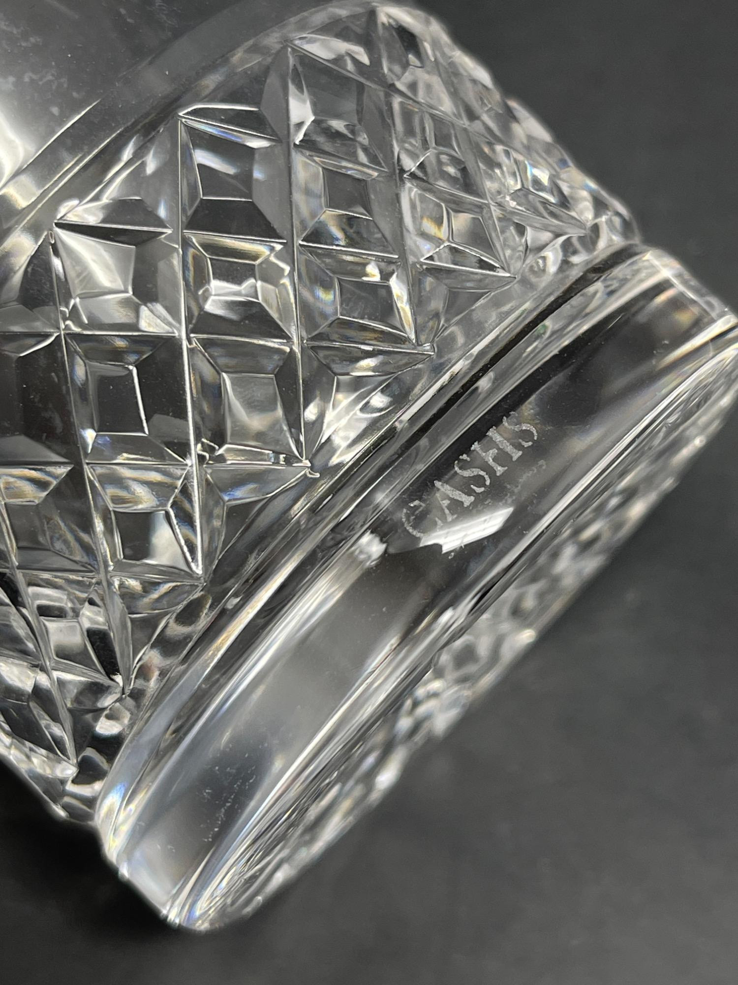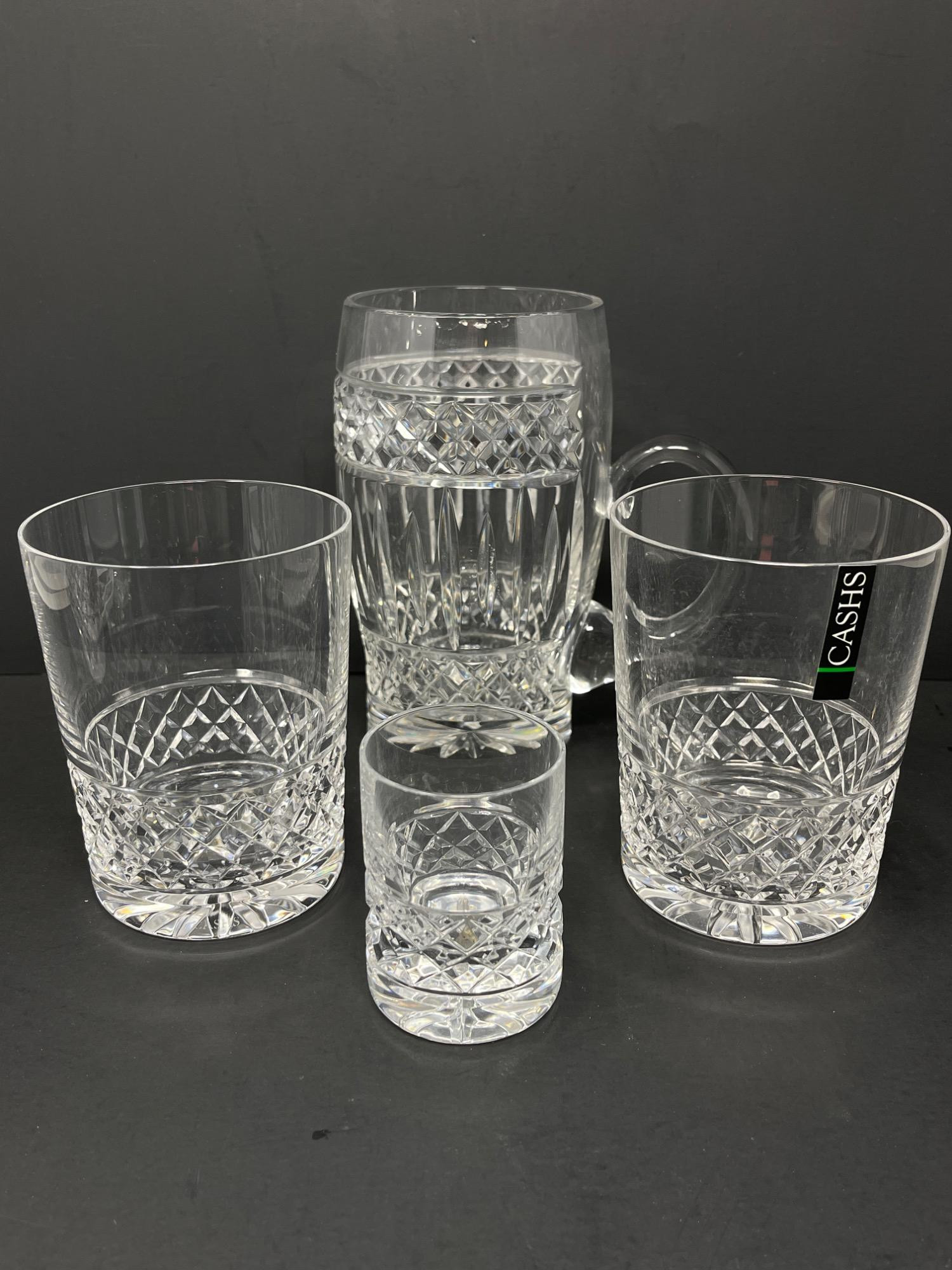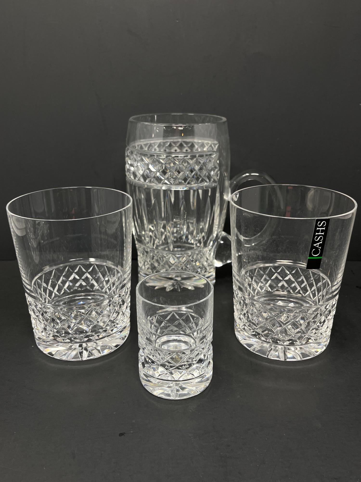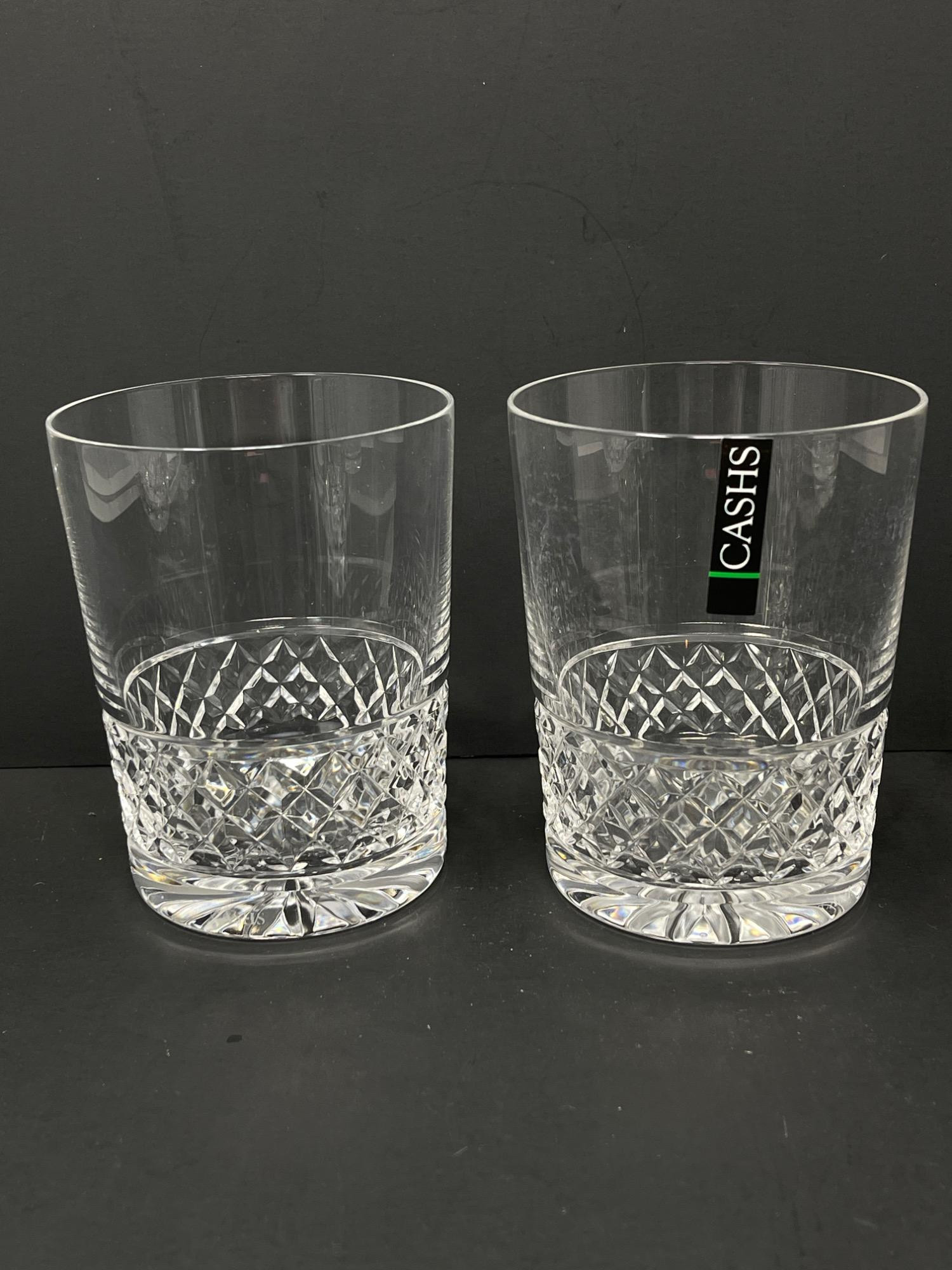 Exquisite Set of Cash's Crystal Glassware 2.75-6.25” H Indulge in the elegance of fine dining with this stunning set of Cash's crystal glassware. Known for their exceptional clarity and brilliant craftsmanship, these glasses are a testament to the prestigious Cash's reputation for luxury and quality. The set includes a variety of glass sizes, perfect for different beverages, from water and soft drinks to finer spirits and cocktails. Each piece is intricately cut with exquisite patterns that beautifully scatter light, making them not only practical for use but also magnificent display pieces.
