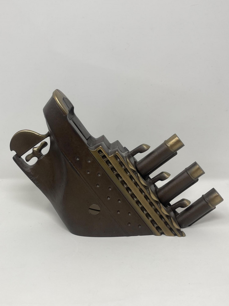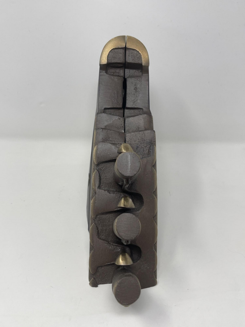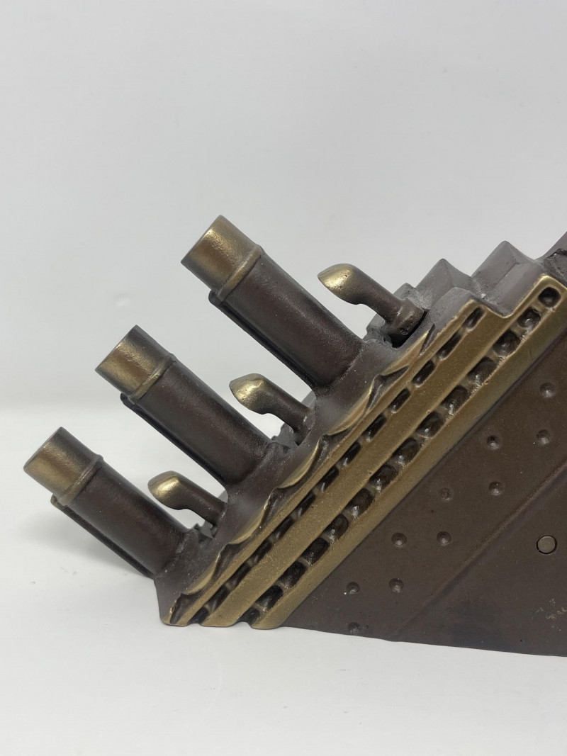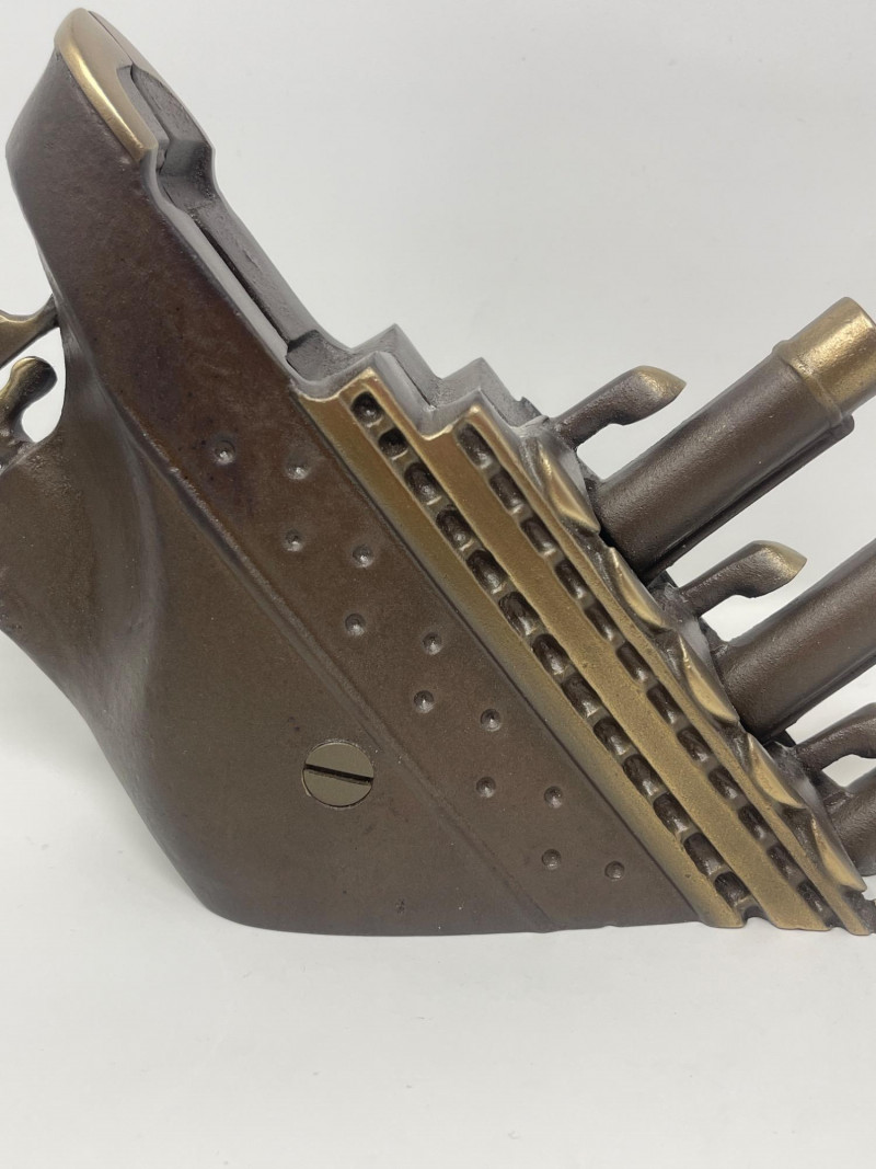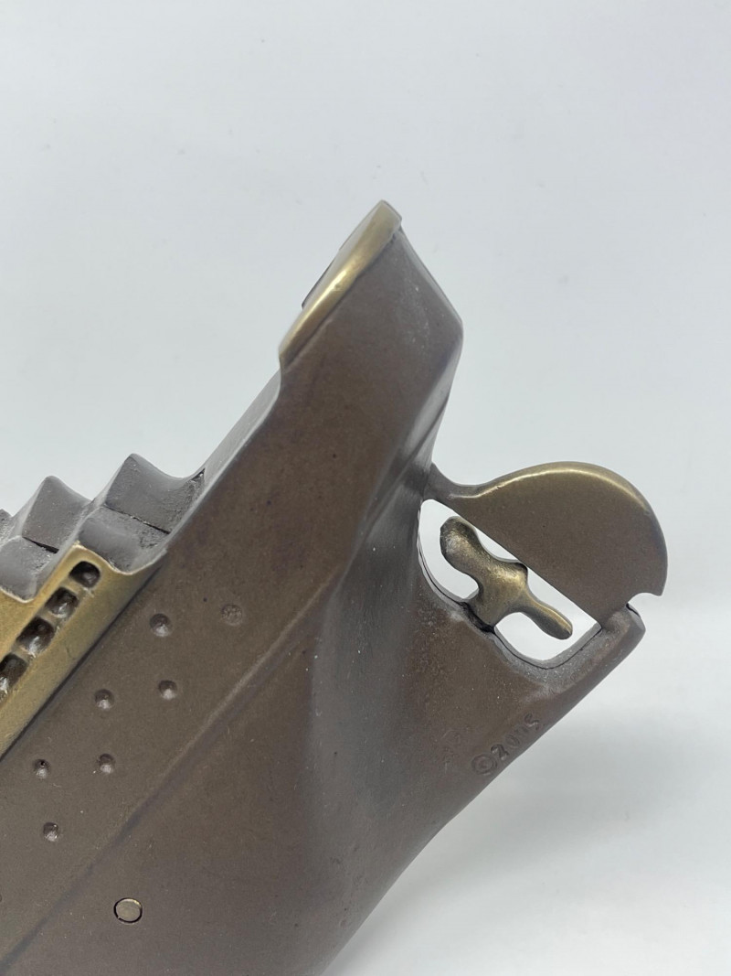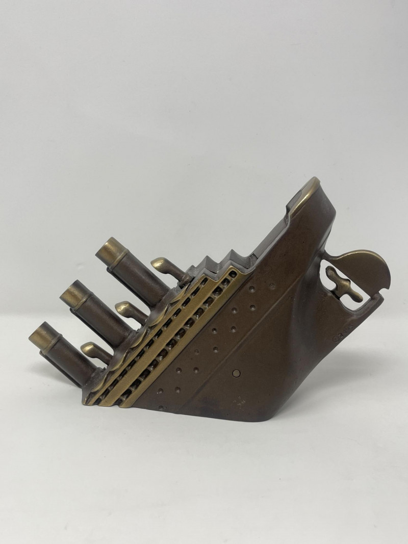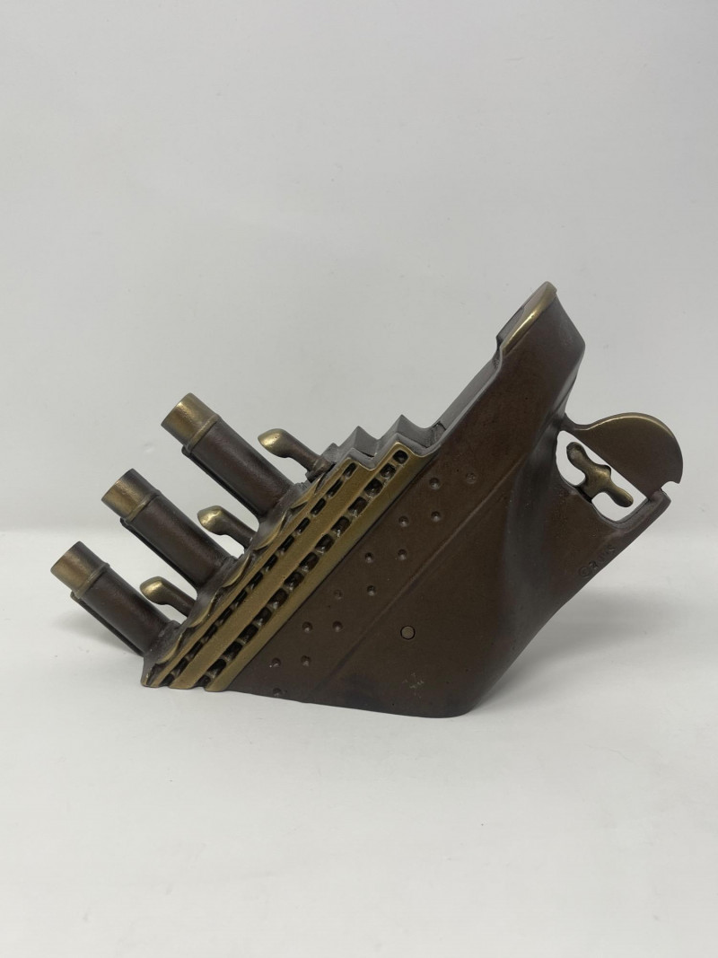 Solid Bronze Sand-Cast Titanic Coin Bank w/ Italian Navy Motto Plaque Uncover a unique blend of historical maritime legacy and functional art with this solid bronze sand-cast Titanic coin bank, complemented by a brass plaque bearing the spirited old motto of the Italian Navy, "Torpedo the Dam! Full Speed Astern." Measuring 9 inches wide and 6 inches high, this meticulously crafted coin bank represents the iconic Titanic in stunning detail. It is perfect for collectors, maritime enthusiasts, or anyone who appreciates the rich intersection of history and craftsmanship. Dimensions: 9 inches wide by 6 inches high, suitable for various display settings like offices, studies, or living rooms. Scott Nelles In his foundry and studio located in northern Michigan, Nelles is inspired by the natural world and the creatures in it. His little bronze animals have been a favorite for many years. Inspiration is also derived from his childhood in the Detroit area. On visits to foundries and steel mills with his father, who was a manufacturer’s representative, he was fascinated by the industrial process and the objects it produced. The toys he creates depict automobiles, ships, boats, airplanes and robots, all intended to thrill boys and girls of all ages. Using the timeless methods of sand casting and hand finishing, he creates objects of beauty, strength and whimsy.