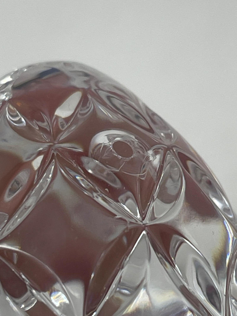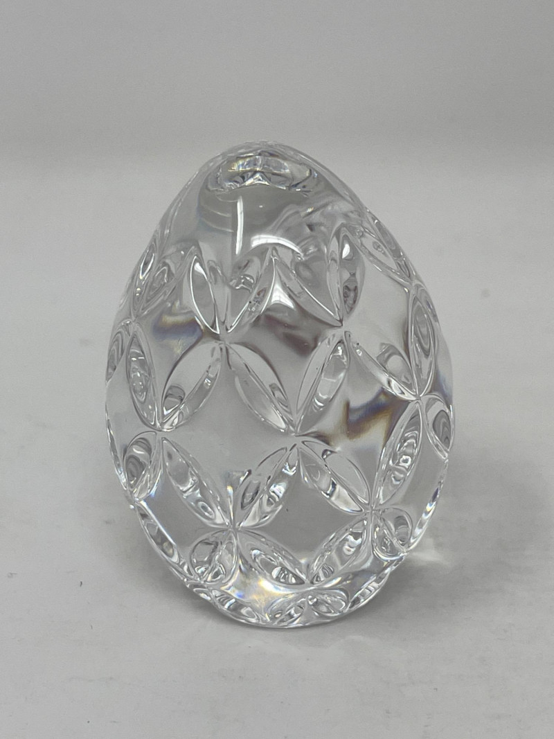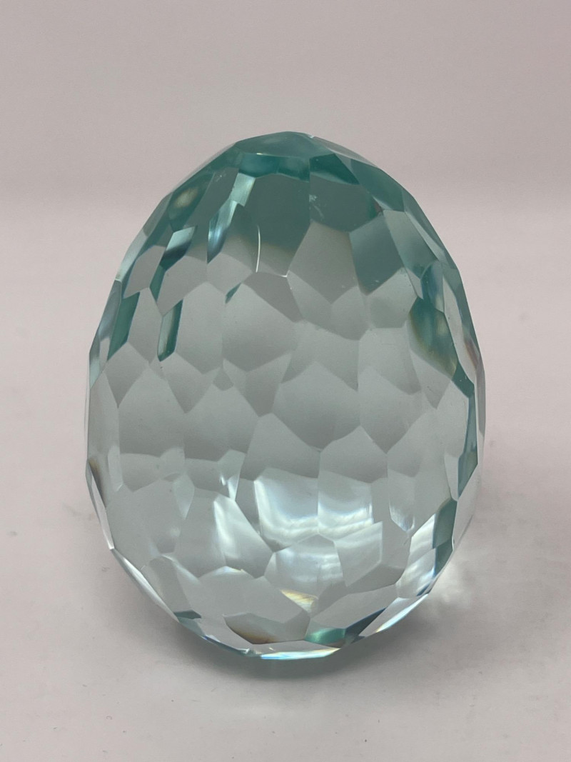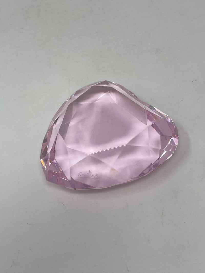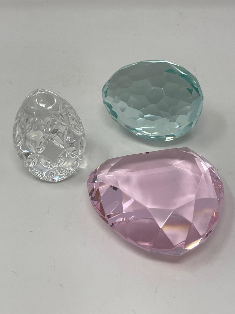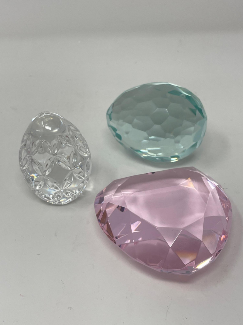 Rosenthal Heart & Waterford Egg w/ Decorative Blue Egg Elevate your décor with this refined collection of crystal pieces, featuring the branded elegance of a Rosenthal pink heart and a Waterford clear egg, complemented by a charming unmarked blue egg. Each item is crafted to showcase its unique attributes, from subtle colors to intricate light reflections, making them perfect for display or as a luxurious addition to any crystal enthusiast's collection. Features: Rosenthal Pink Heart (3" Length): A symbol of elegance, this pink crystal heart is beautifully crafted with the distinctive Rosenthal signature, perfect for adding a touch of romance to any setting. Waterford Clear Egg (2.25" Tall): Despite a minor chip, this Waterford crystal egg maintains its clarity and luster, reflecting the high standards of Waterford's craftsmanship. The chip is minor and requires close inspection to be noticed, ensuring the piece retains much of its original charm. Unmarked Blue Egg (2.75" Length): This serene blue egg features a smooth, polished finish, adding a soothing element to the collection without the distinction of a brand, yet standing out with its pure elegance.