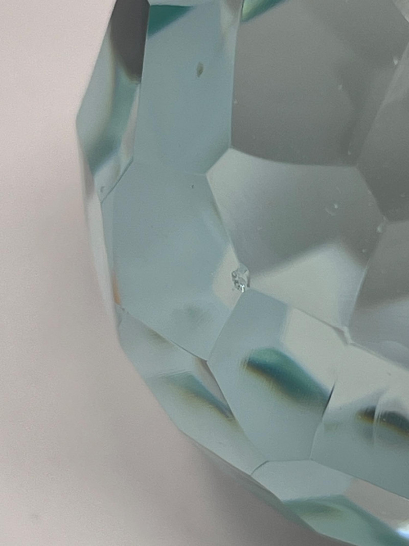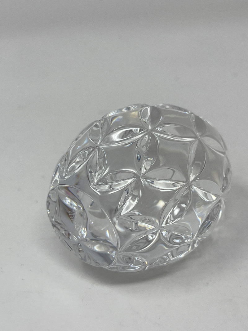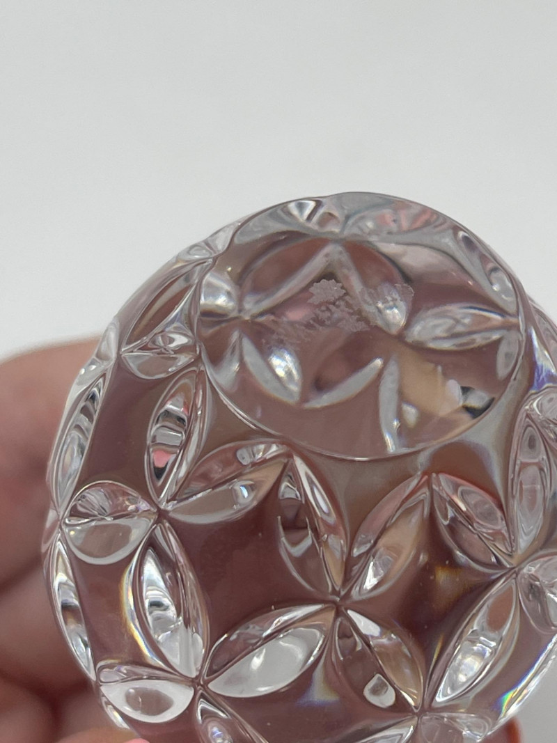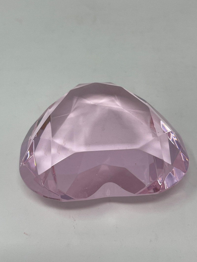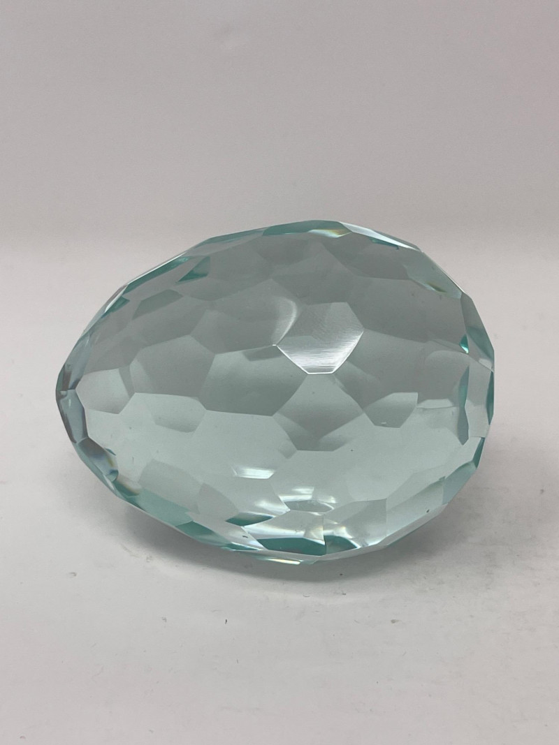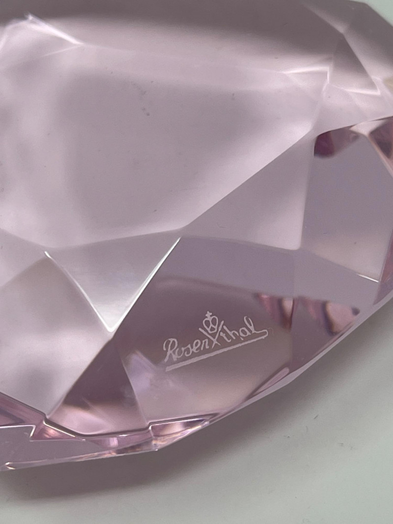 Rosenthal Heart & Waterford Egg w/ Decorative Blue Egg Elevate your décor with this refined collection of crystal pieces, featuring the branded elegance of a Rosenthal pink heart and a Waterford clear egg, complemented by a charming unmarked blue egg. Each item is crafted to showcase its unique attributes, from subtle colors to intricate light reflections, making them perfect for display or as a luxurious addition to any crystal enthusiast's collection. Features: Rosenthal Pink Heart (3" Length): A symbol of elegance, this pink crystal heart is beautifully crafted with the distinctive Rosenthal signature, perfect for adding a touch of romance to any setting. Waterford Clear Egg (2.25" Tall): Despite a minor chip, this Waterford crystal egg maintains its clarity and luster, reflecting the high standards of Waterford's craftsmanship. The chip is minor and requires close inspection to be noticed, ensuring the piece retains much of its original charm. Unmarked Blue Egg (2.75" Length): This serene blue egg features a smooth, polished finish, adding a soothing element to the collection without the distinction of a brand, yet standing out with its pure elegance.