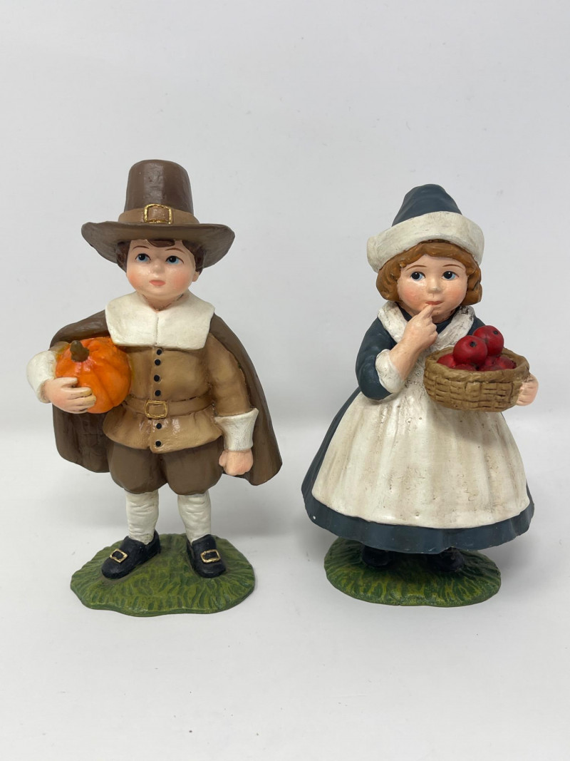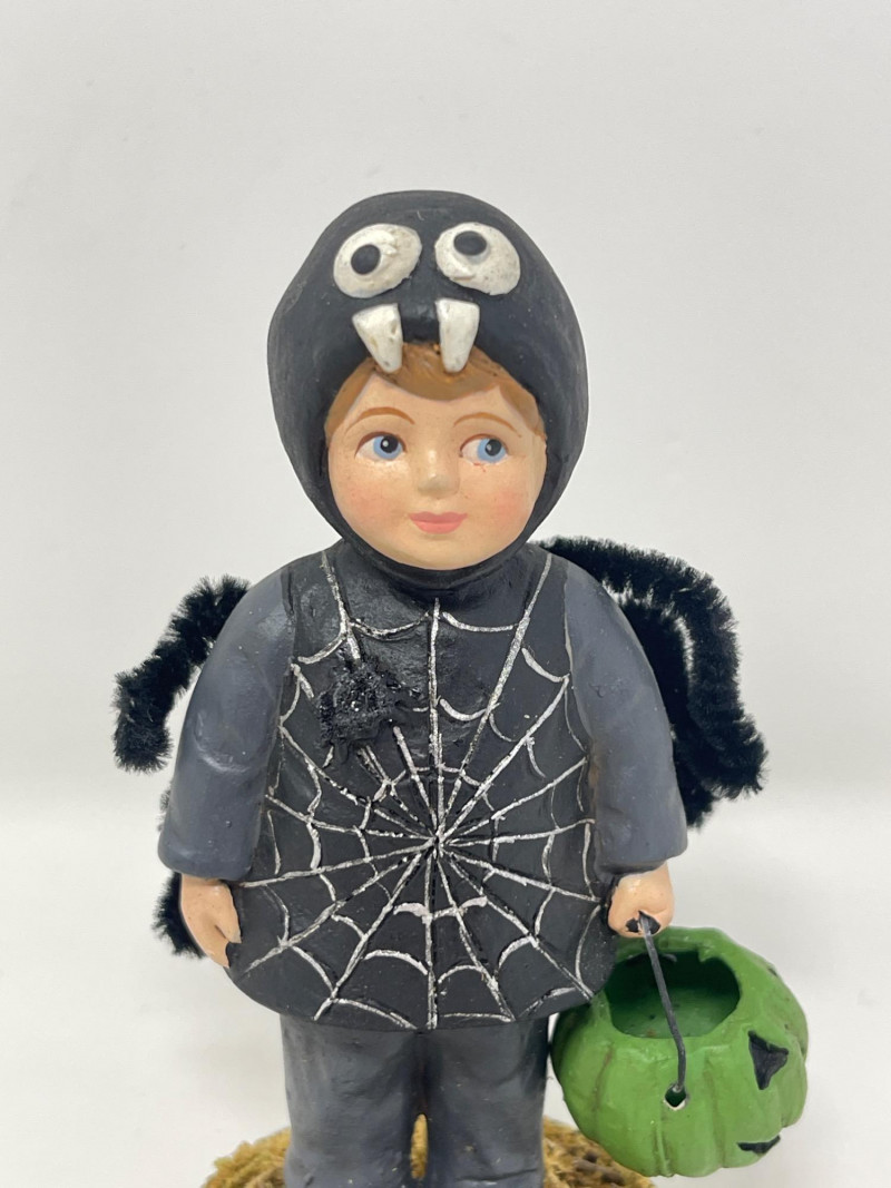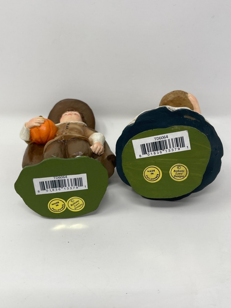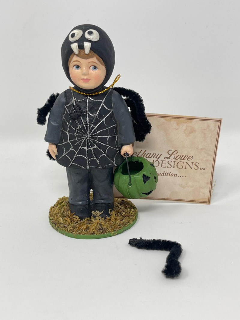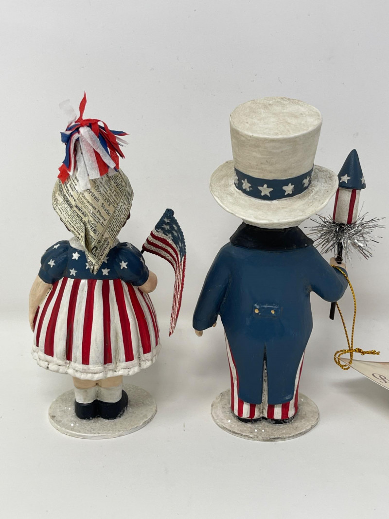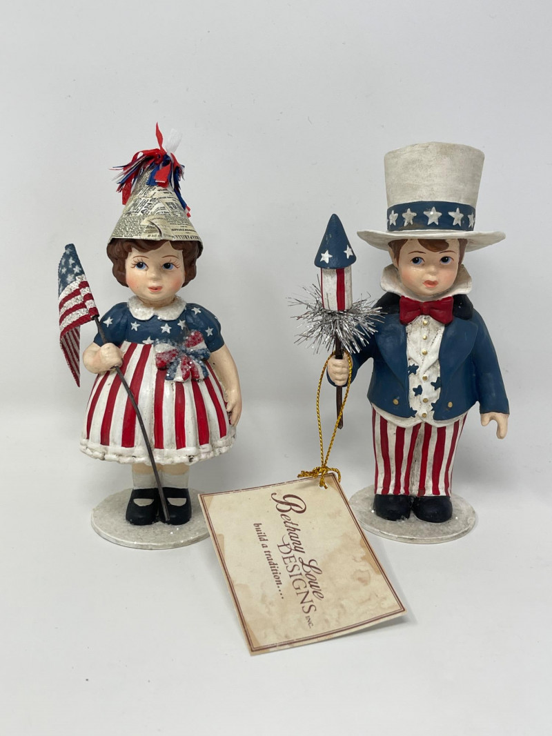 Festive Bethany Lowe Figurine Collection: Patriotic & Halloween Theme Celebrate the seasons with this delightful collection of Bethany Lowe figurines, each crafted with charming details and vibrant themes: Uncle Sam and Lady Liberty Figurines (4.5"-5.5" H): Dressed in iconic Americana, these figures evoke the spirit of Independence with their star-spangled attire and festive accessories. Pilgrim Boy with Pumpkin and Girl with Apple Basket Figurines (4" H): These quaint figures capture the essence of Thanksgiving with their traditional pilgrim outfits and autumn harvest. Bethany Lowe Webster Spider Boy Figurine (4" H): Perfect for Halloween, this figure features a unique spider costume complete with a webbed design and a tiny pumpkin treat bucket.