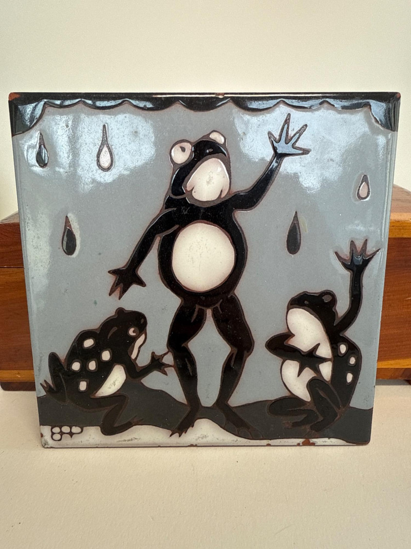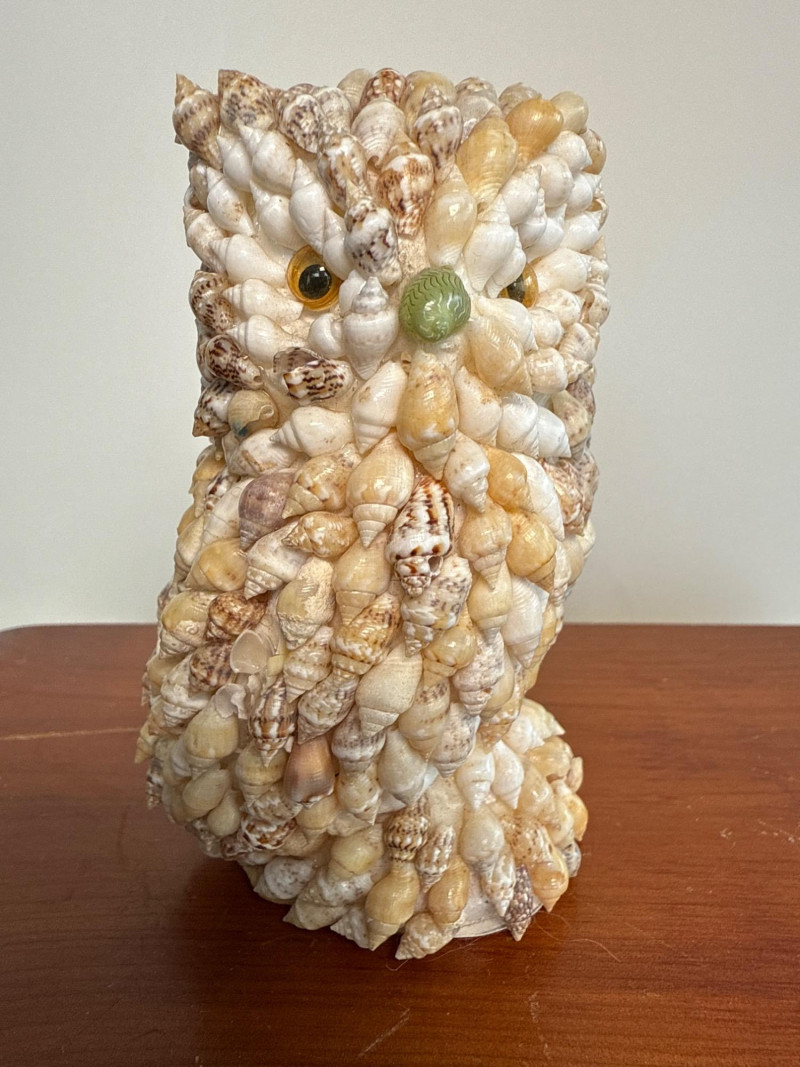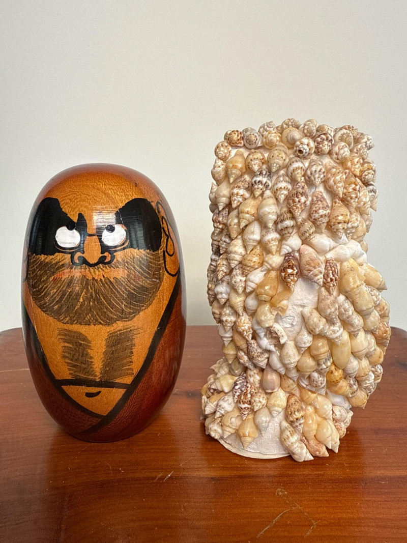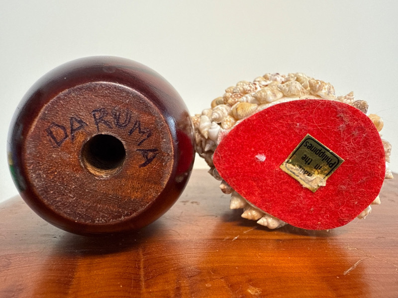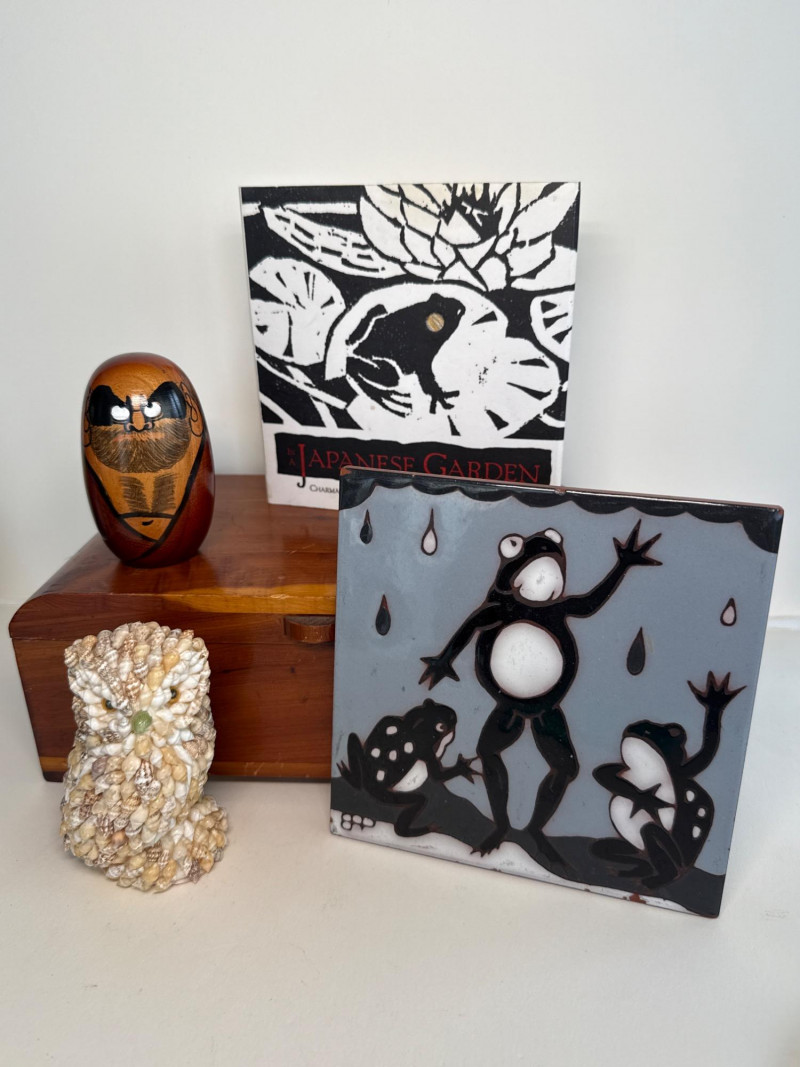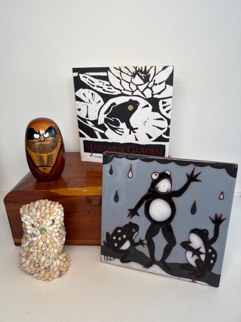 Vintage & Artistic Pieces w/ Asian Influences: Prusa Tiles, Daruma + This unique collection captures a blend of cultural artistry and vintage charm, ideal for eclectic collectors and connoisseurs of unique décor: "In a Japanese Garden" Book by Charmaine Aserappa & Akiko Naomura: A visually stunning exploration of Japanese garden aesthetics, complete with detailed narrative and beautiful illustrations. Vintage Wooden Daruma Doll Souvenir: A traditional Japanese symbol of perseverance and good luck, this handcrafted doll is a charming cultural artifact. Vintage Handmade Seashell Owl: Crafted from layered shells, this intricate piece from the Philippines adds a touch of seaside whimsy to any collection. Prusa Tiles - Elany & Jiri Wall Hanging Plate: A functional and decorative hand-painted tile depicting playful frogs, suitable as a wall hanging or a hot plate, showcasing American artistry with a fun twist. Wooden Box: A simple yet elegant storage solution that complements any of the above treasures or stands alone as a fine piece of craftsmanship. Each item in this collection offers its own story and decorative appeal, making it a fantastic opportunity to acquire diverse pieces that celebrate global cultures and artistic expressions.