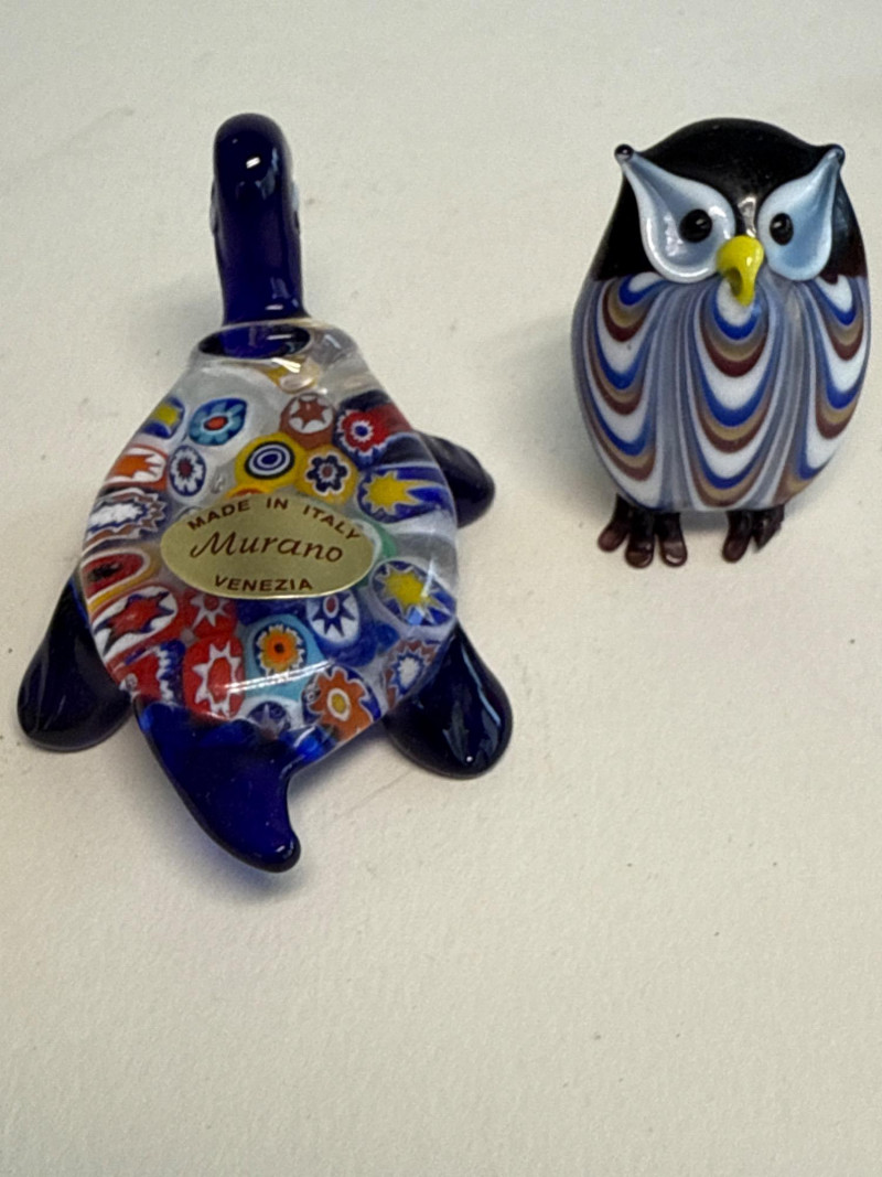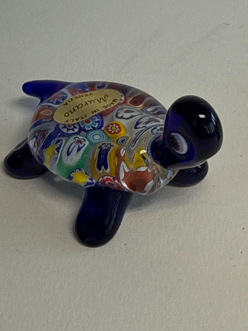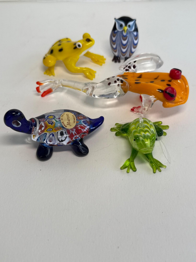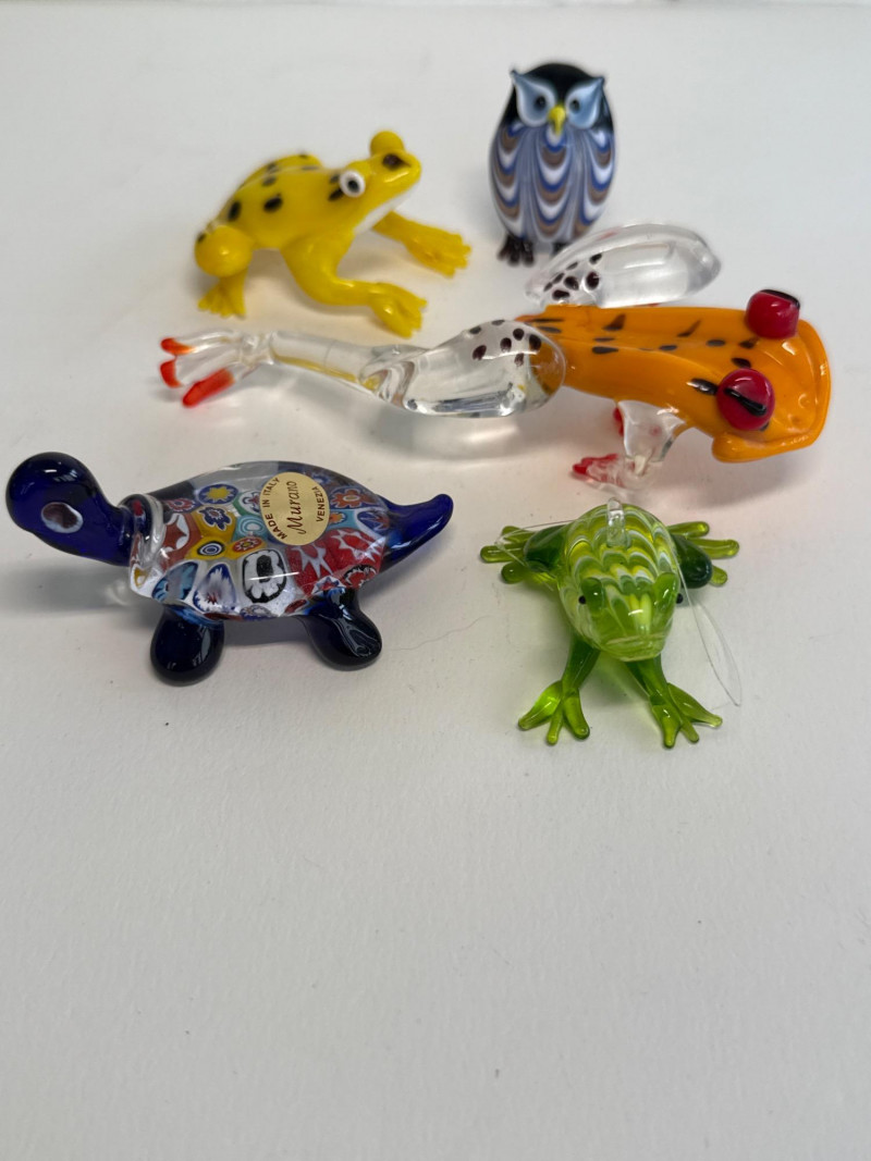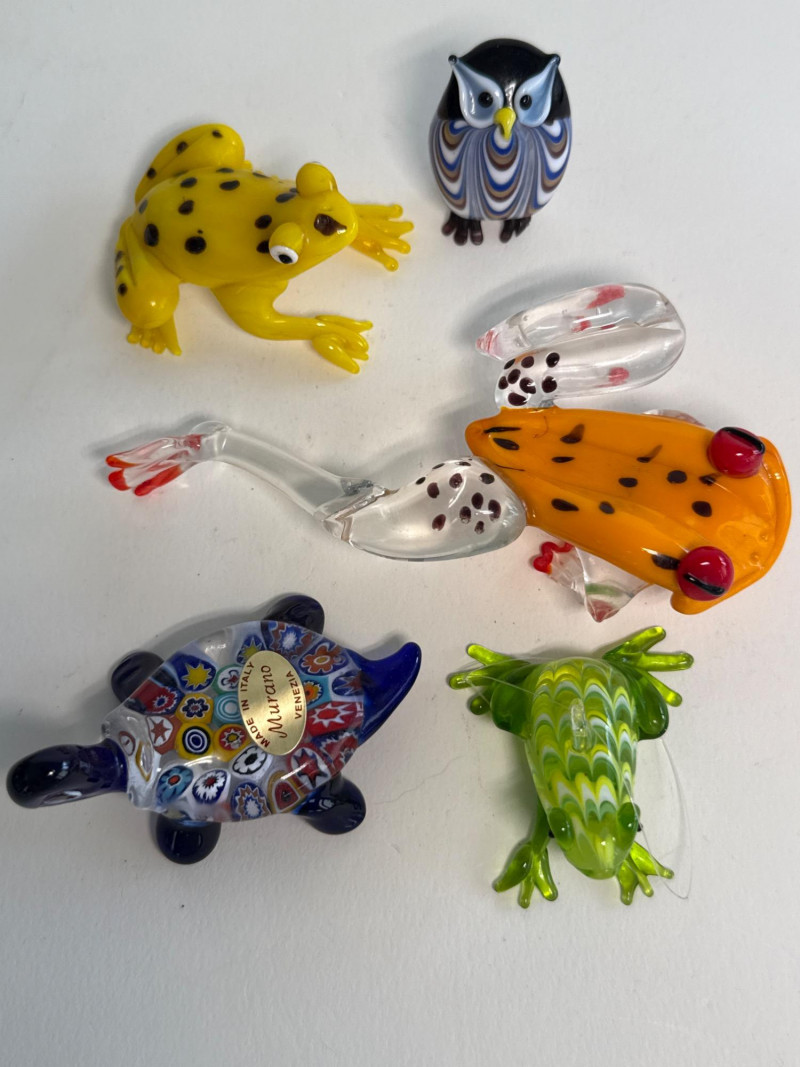 Murano Turtle & Assorted Glass Animal Figurines Explore the enchanting world of glass art with this captivating collection of handcrafted figurines. Each piece in this assortment stands out with its vibrant colors and meticulous detailing, perfect for collectors and enthusiasts alike. Murano Glass Turtle: A standout piece from Venezia, this Murano glass turtle is adorned with a colorful mosaic of floral patterns, showcasing the prestigious craftsmanship of Italian glassmakers. Assorted Glass Animals: This set also includes an array of charming animals, each with its own unique design. From the striking orange glass frog, measuring 5.5 inches in length, 2.75 inches in width, and 1.2 inches in height, to a delightful array of other figures including frogs and owls, each piece captures a moment of natural beauty in brilliant glass.