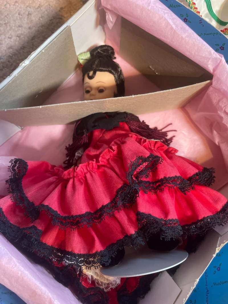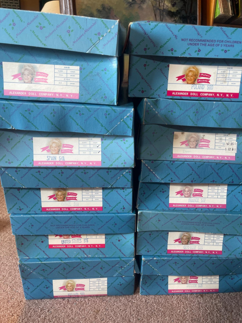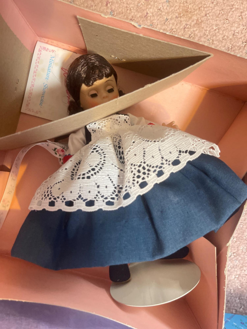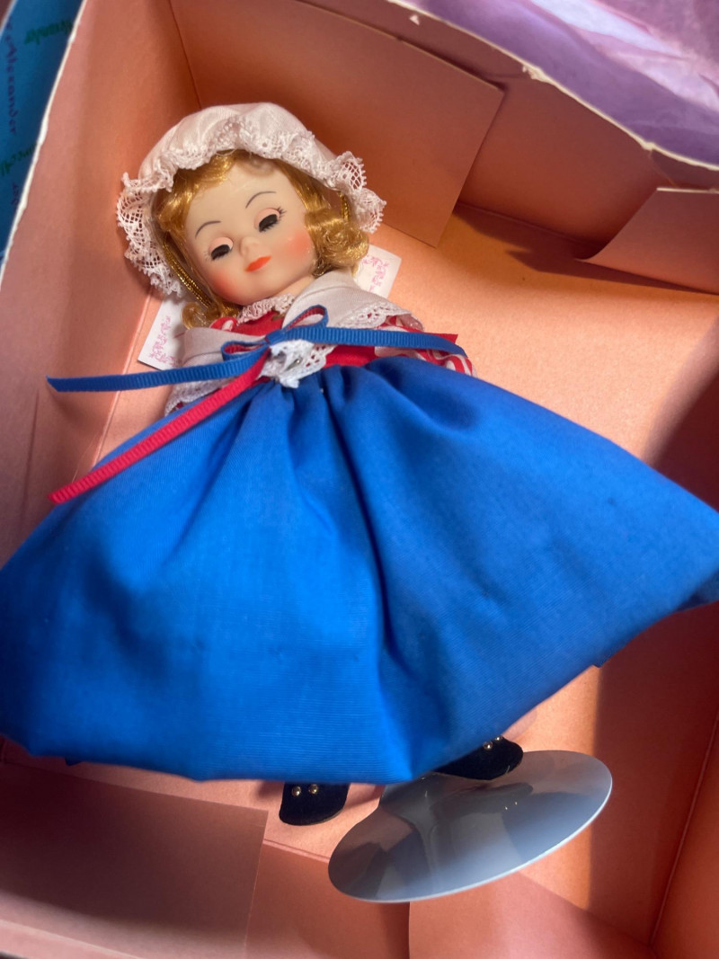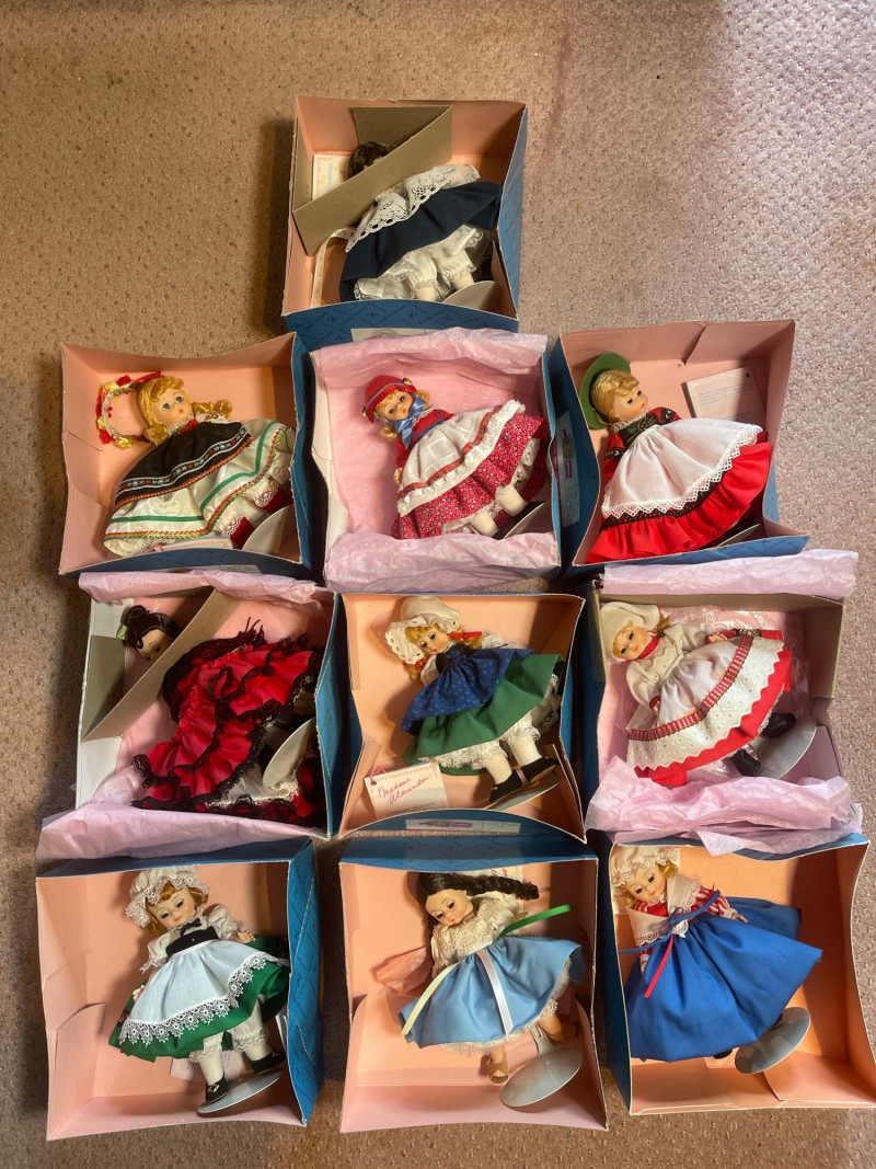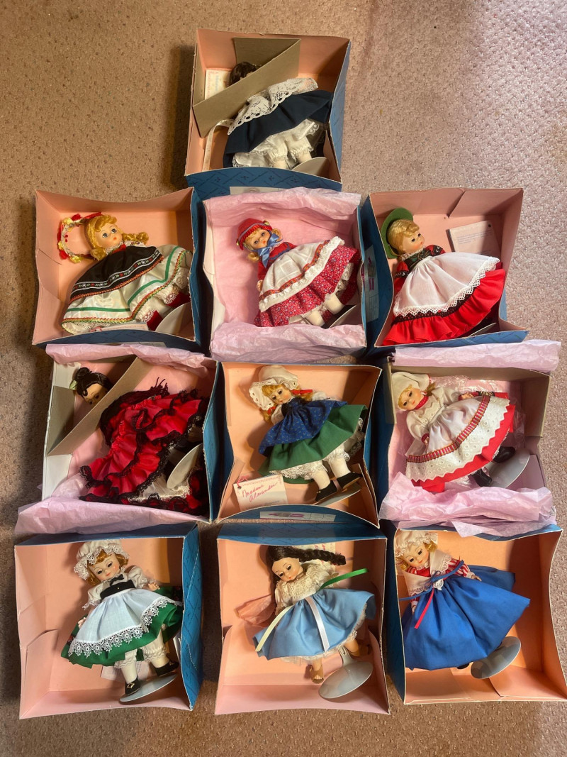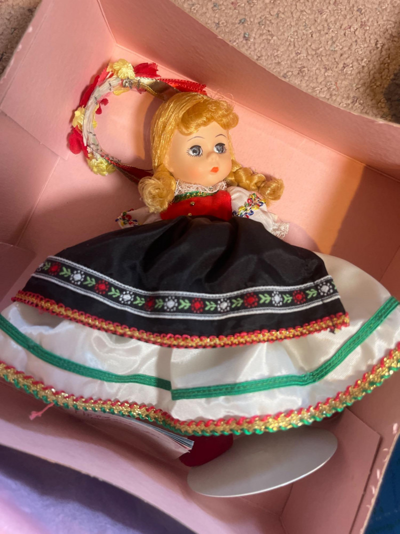 The collection includes dolls from Spain, the United States, Ireland, Poland, France, Mexico, and other countries. Each doll's costume reflects the traditional attire specific to its represented country, highlighted by authentic details and vibrant colors. These dolls come in their original boxes, which are labeled with the name of the country each doll represents. This not only ensures their pristine condition but also enhances their value as collectibles. Last doll pictured is included, but was not shown an original photo because it is broken. All are about 7 to 7.5 inches tall.