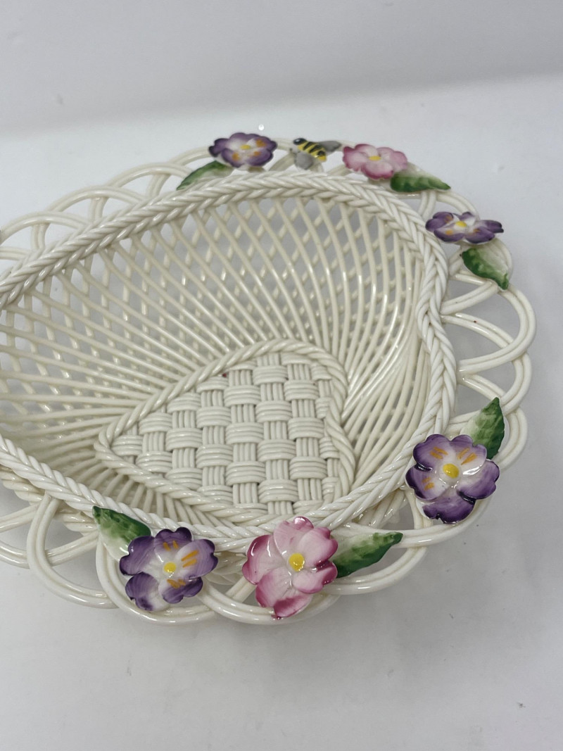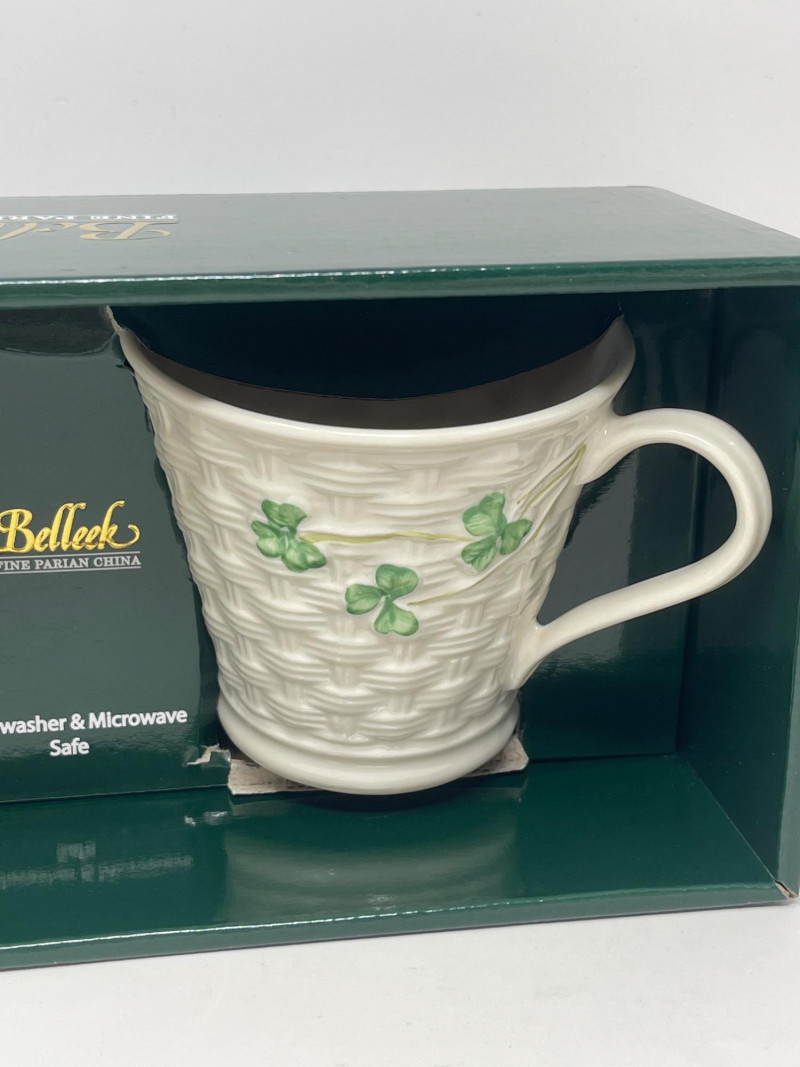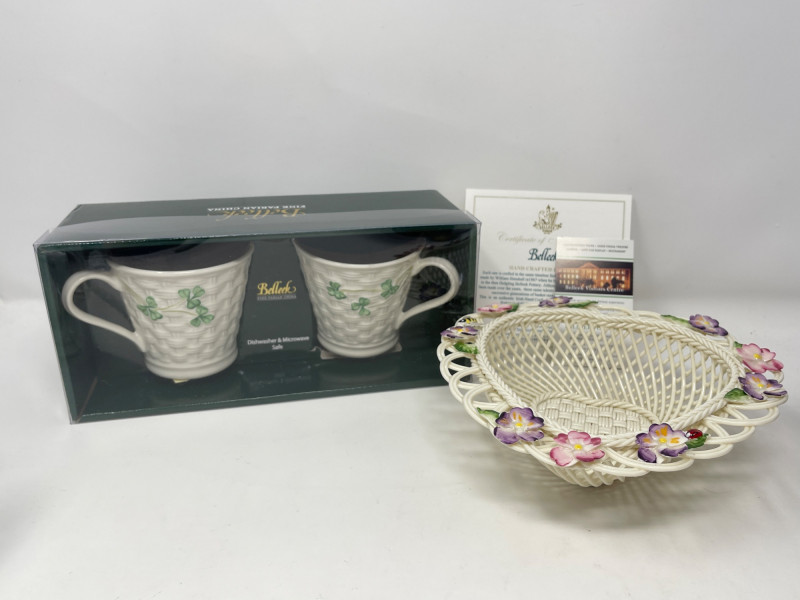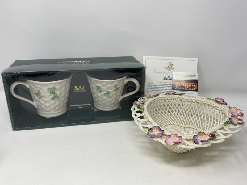Lot # 115 - Belleek Pottery Shamrock Mugs and Floral Basket Set