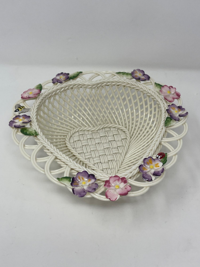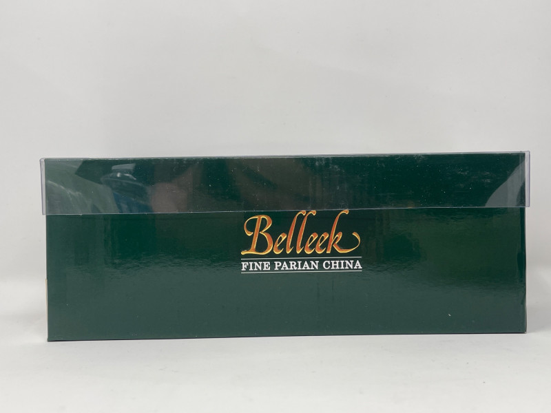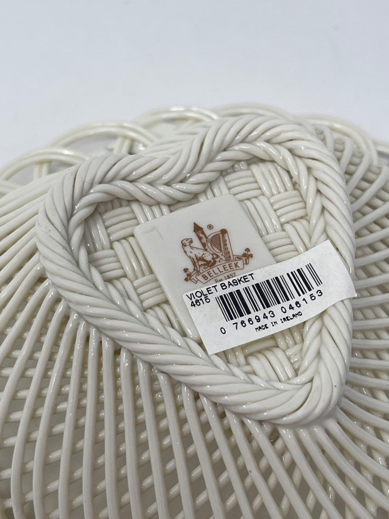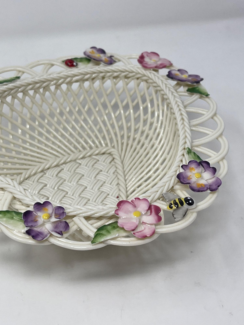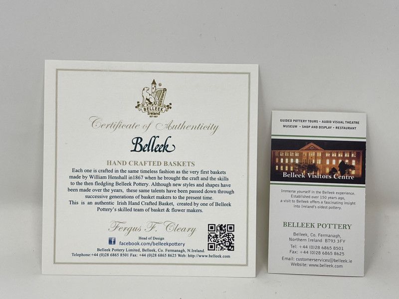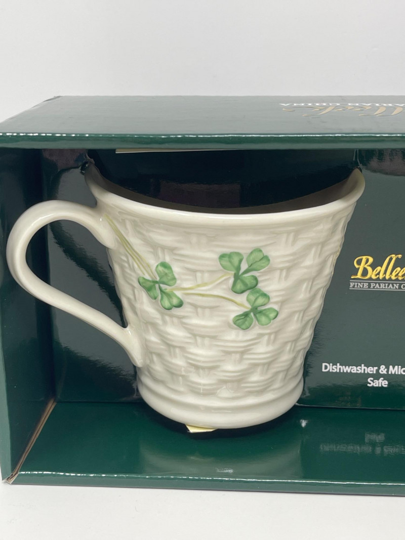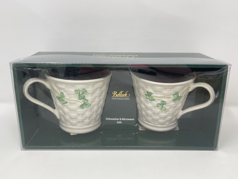 Belleek Pottery Shamrock Mugs and Floral Basket Set Celebrate the artistry of Belleek with these pieces that highlight the traditional craftsmanship of Ireland’s oldest pottery. Shamrock Basketweave Mugs (3" H): Set of two Belleek mugs, intricately designed with a classic basketweave pattern and adorned with hand-painted shamrocks. Dishwasher and microwave safe. Floral Basket Dish (7.5” W x 2.5” H): Exquisitely crafted Belleek basket dish, embellished with vibrant hand-painted flowers. An authentic Irish handcrafted piece with a certificate of authenticity. This collection offers both elegance and practicality, perfect for collectors who appreciate fine detail and historical significance.